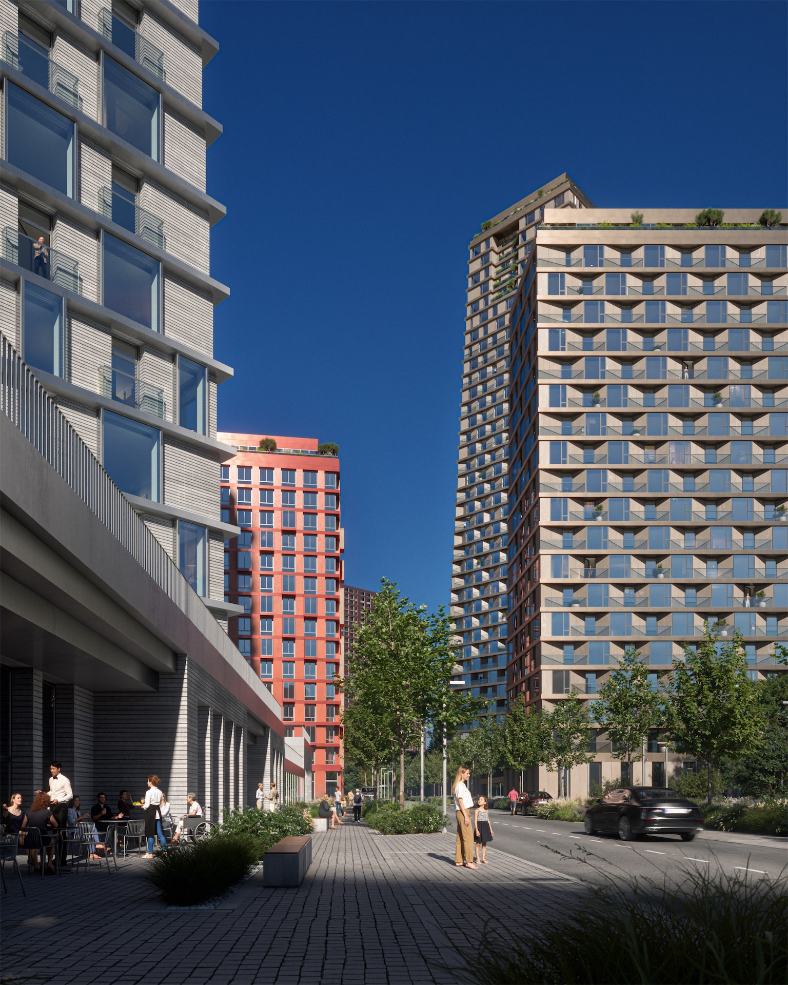 Он выполняет двойную функцию. С одной стороны, структурирует территорию, разделяя ее на три урбан-блока с приватными дворовыми пространствами. С другой — формирует внутреннюю городскую улицу с активным общественным фронтом, включающим ритейл, кафе с террасами и спортивную инфраструктуру.