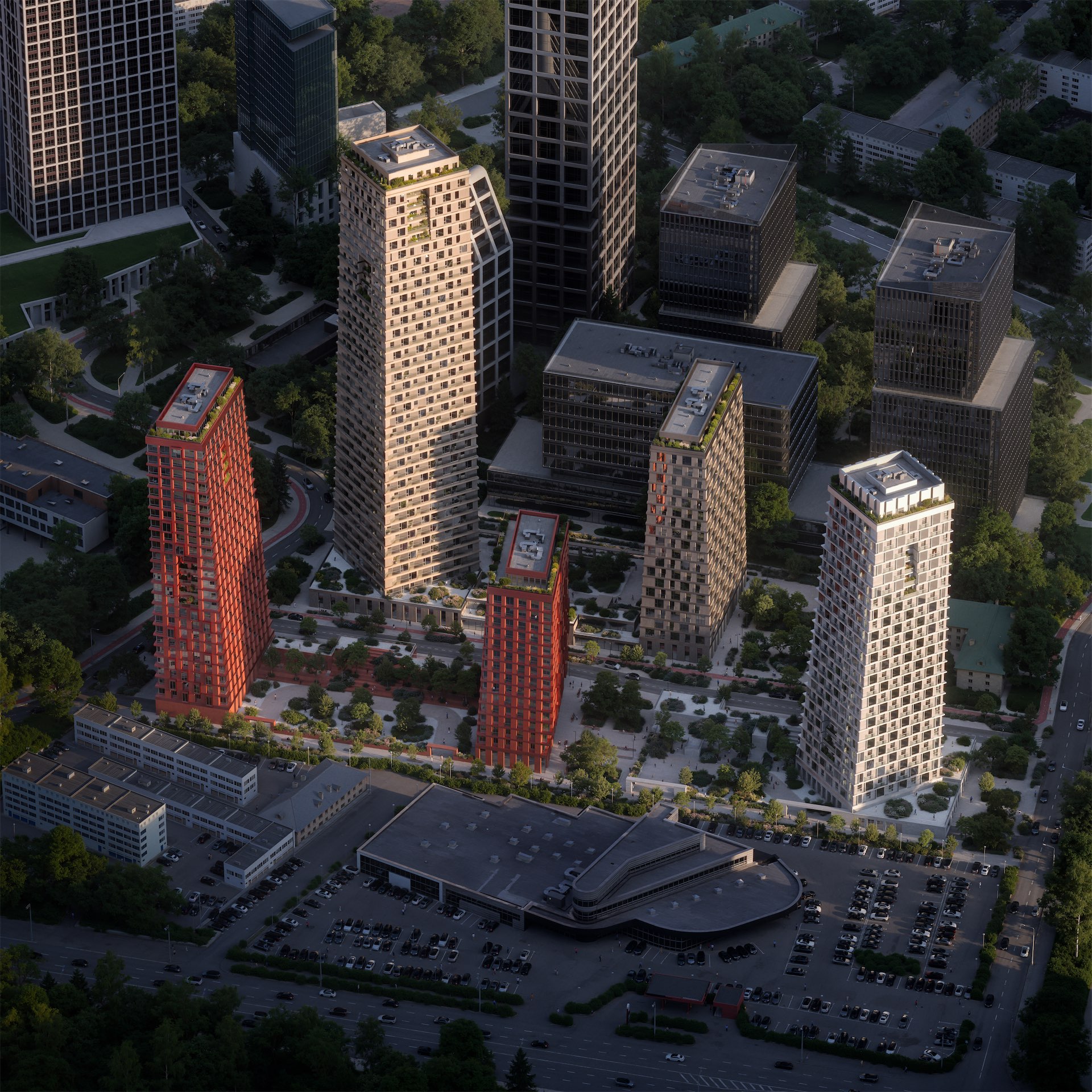 Наклонные фасады и пирамидальная геометрия объемов направлены на оптимизацию инсоляции и доступ естественного света во внутренние пространства. Архитектура строится на принципе сдержанной выразительности: индивидуальность корпусов достигается через вариации формы, этажности, цвета и фактур при сохранении композиционного единства и масштаба.
