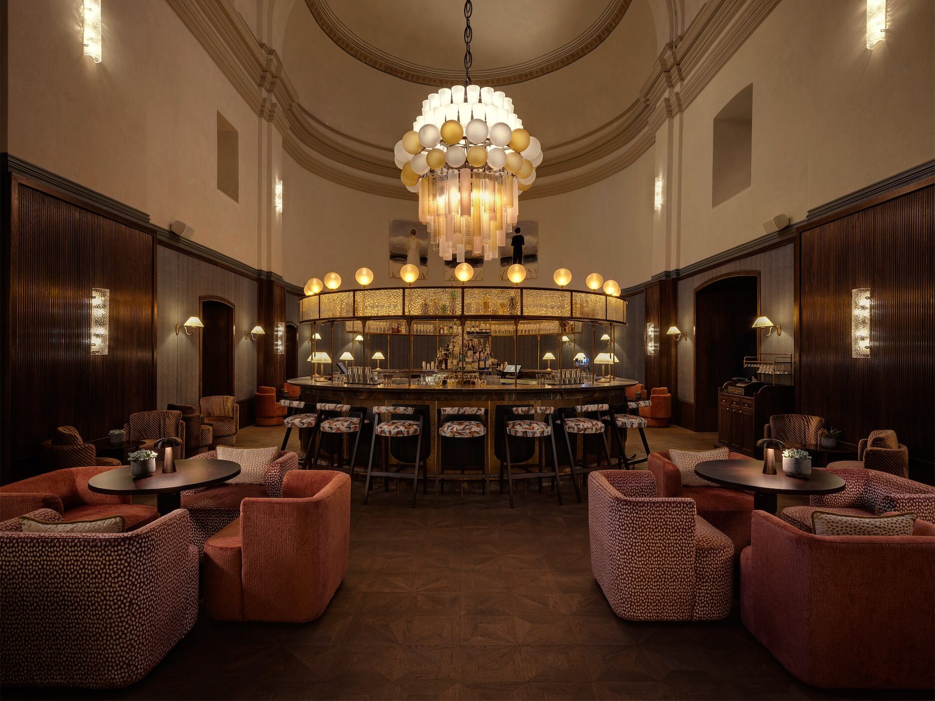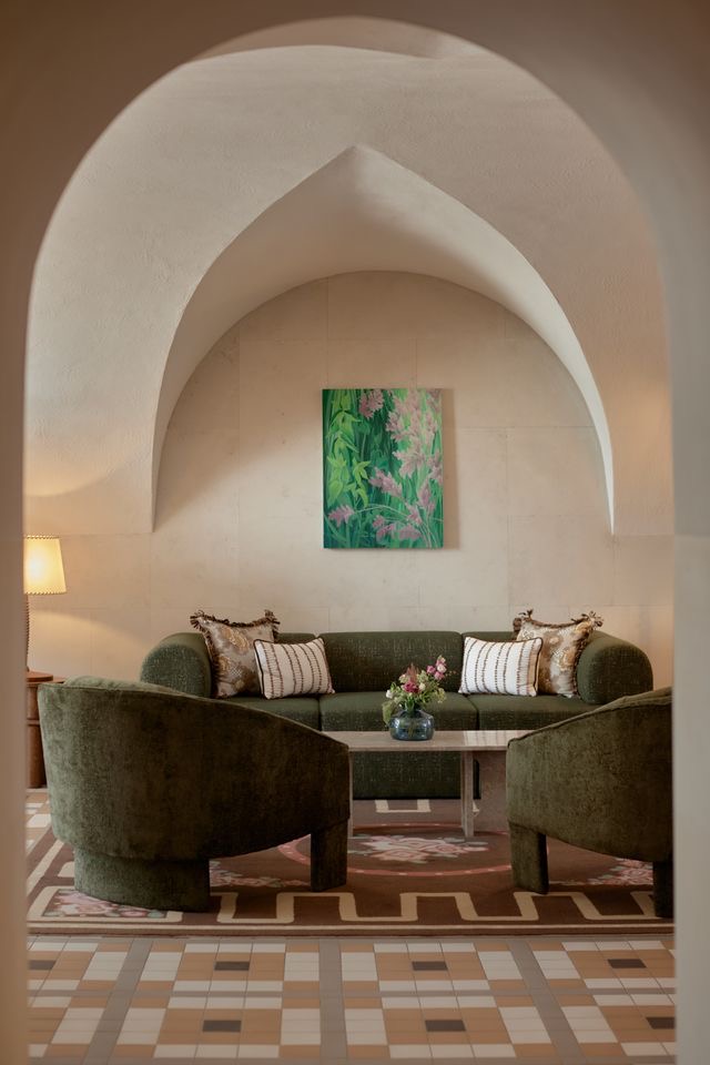 Проект, реализованный лондонским бюро ADC Atelier, строится на внимательной работе с историческим наследием. Сводчатые потолки, фрагменты фресок, массивные стены — все это не превращено в декоративный фон, а включено в архитектурный сценарий. Интерьеры разворачиваются как последовательность пространств с разной плотностью и ритмом — от камерных зон до открытых общественных пространств, где свет, масштаб и материал задают более медленную логику восприятия.
