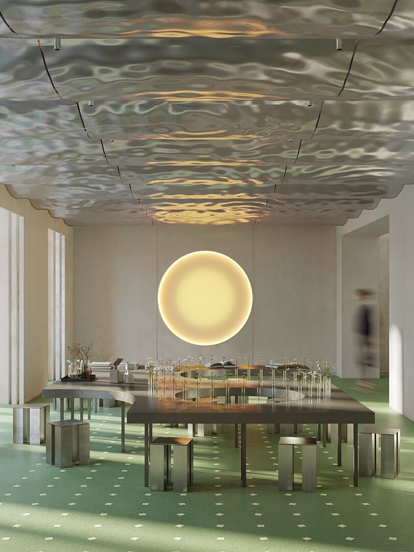 Проект обновления выполнен барселонским бюро Mesura. Архитекторы сохранили и отреставрировали уцелевшие детали — в том числе историческую деревянную мозаичную отделку — и добавили новый архитектурный слой: легкий металлический потолок с концентрическими волнами, отсылающими к пластике Гауди.