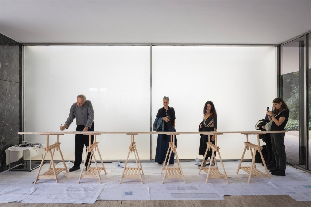 Здесь у меня было три дня, нужно было рисовать на листе размером метр на четыре. Рука до верхнего края почти не дотягивается. Публика стояла напротив — за спину они, к счастью, заходить не могли, и это спасало. Я начал слева — рисовал здание немецкого посольства в Петербурге, где Мис ван дер Роэ руководил стройкой своего учителя и работодателя Петера Беренса. Это были длинные линии, которые нужно было тянуть через весь планшет. Было волнительно первые два-три часа. Но когда я почувствовал, что линии «сели», что первый эпизод получился, дальше пошел спокойнее. Чем дальше — тем больше уверенности.