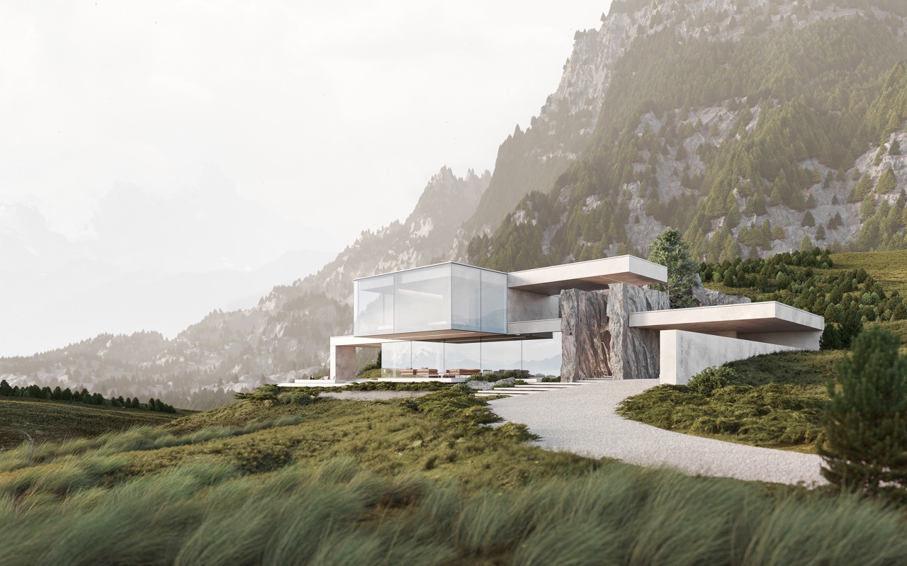Концептуальная задача проекта — совместить несовместимое: объединить воздух и камень, простор и стены, горные вертикали и модернистские горизонтали. Белоснежное здание, врезанное в скалу, сложными перепадами, выступами, открытыми террасами и навесами спускается вниз. Панорамные фасады отражают небо и открывают вид на склоны гор, а скальный материал дублируется на массивных стенах прохода в дом.