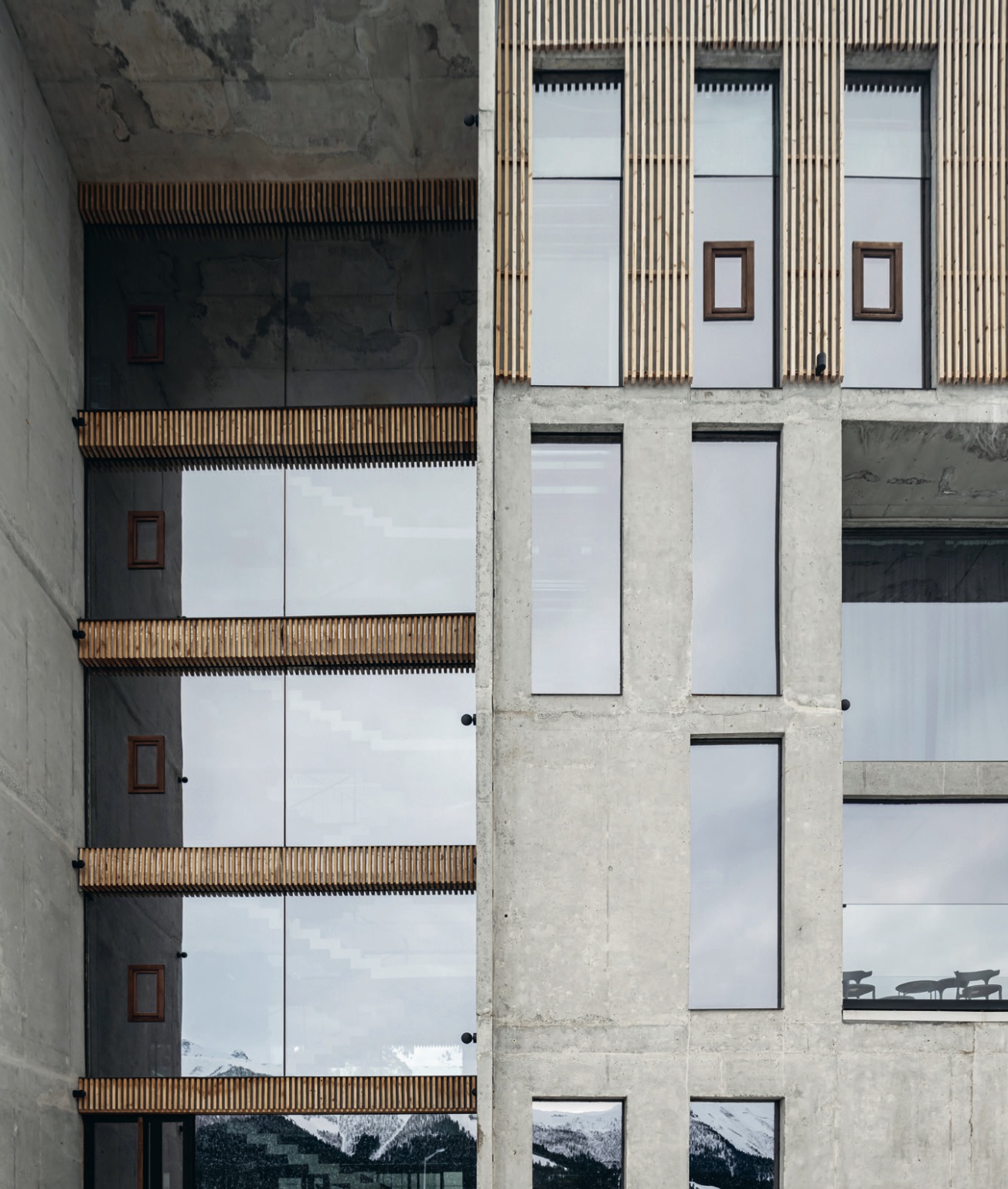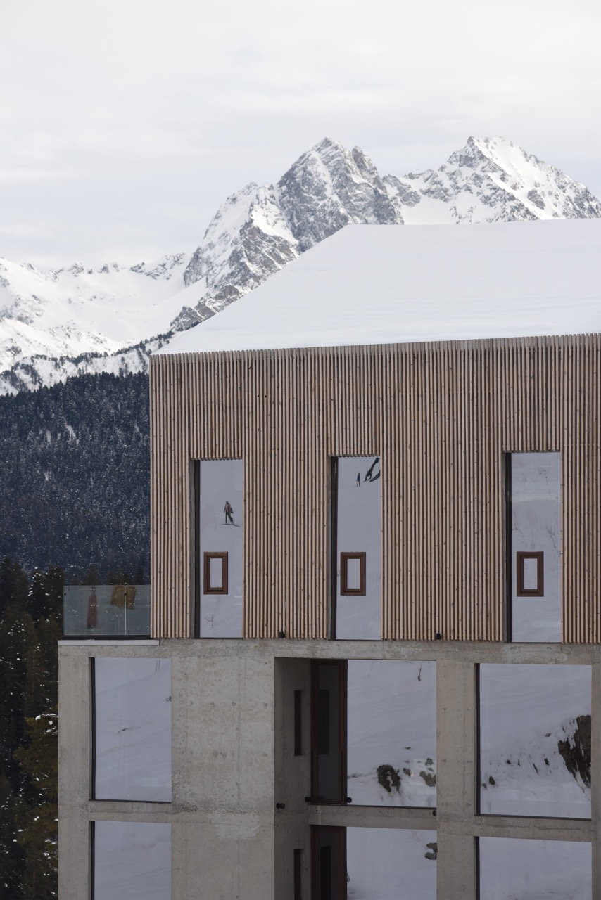 Проект переосмысляет привычный для горнолыжных курортов образ и обращается к архитектуре Северного Кавказа, его сохранившимся дольменам, крепостям и сторожевым башням, сочетая монолитность каменных крепостей с современными формами. Открытые бетонные конструкции первого яруса, выявляющие тектонику постройки, венчаются легким объемом второго яруса, подчеркнутым строгой вертикалью сосновых реек. Панорамные безрамные витражи открывают виды на горную долину.