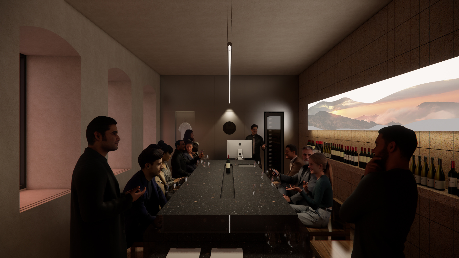 Винный бутик задуман как живое пространство, которое подстраивается под разные сценарии — от повседневной работы магазина до дегустаций и презентаций. В интерьере встречаются натуральные текстуры камня, отражающие локальный характер (туф и ракушечник), а элементы из нержавеющей стали отсылают к производственному процессу, подчеркивая современный, индустриальный интерьер.