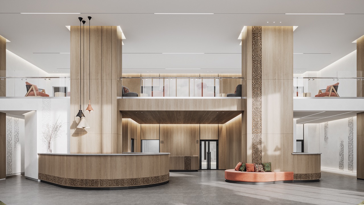 Архитектурная концепция интерьеров нового отеля на курорте Ведучи воплощает диалог между современным дизайном, традиционной культурой и национальными акцентами: коврами-истангами, керамическими вставками, резной отделкой и панно с мотивами старинных чеченских орнаментов. Использование натуральных материалов — дерева, камня и натуральных тканей — формирует теплую и аутентичную атмосферу, которая отсылает к природе и истории региона. Ритм национального узора прослеживается в элементах мебели, светильниках и рельефах стен, но при этом не доминирует — он органично интегрирован в минималистичные формы. Такая архитектура не просто «декорирует» пространство, а оживляет память о корнях, превращая отель в продолжение культурной идентичности Чечни.