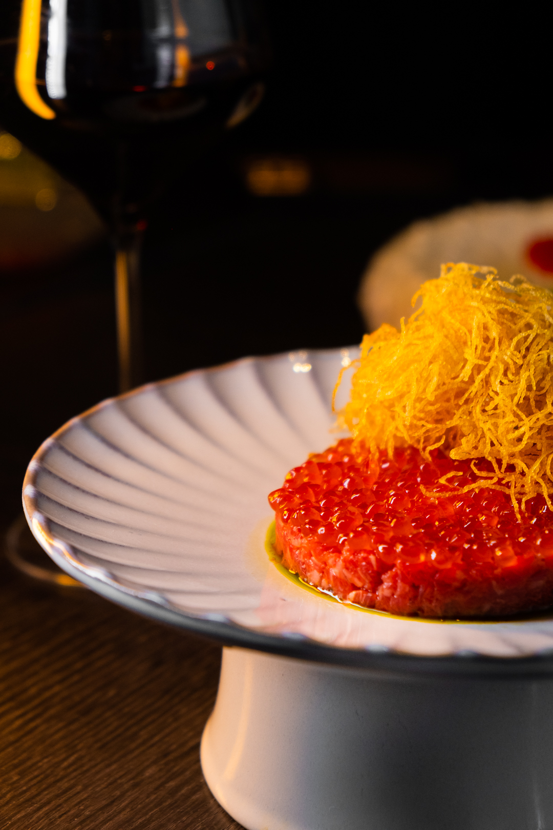 Тартар из говядины с красной икрой, сашими из лосося с манго и соусом из зеленого чили, утку в китайских специях, трубача, приготовленного на воке с грибами, салат с крабом и моти.