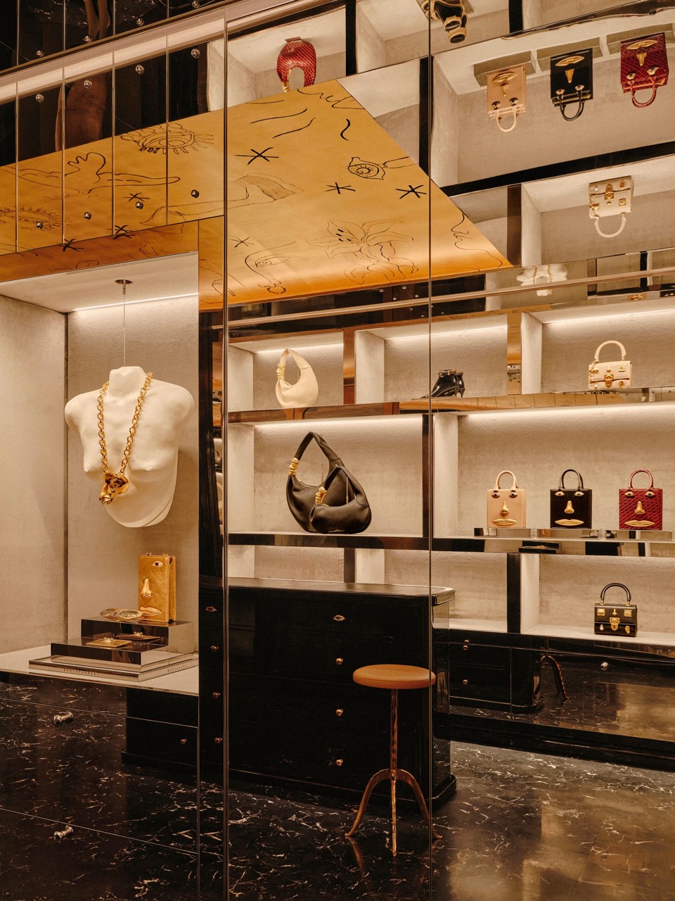 Одна из ниш имеет скульптурную форму ванны, адаптированную под витрину для украшений. Ее размещение превращает знакомый бытовой объект в знаковый элемент интерьера, усиливая салонную атмосферу бутика. Графические работы креативного директора дома Дэниела Розберри, нанесенные прямо на потолок, служат тонким ориентиром, пронизывающим все залы. Сдержанное освещение мягко выявляет текстуры, позволяя материальности интерьера раскрываться не сразу, а по мере движения гостя.