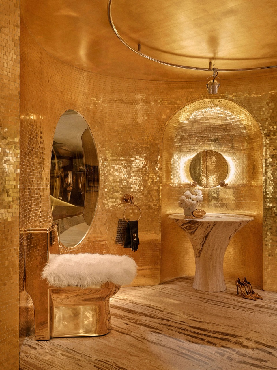 Ключевой прием заключается в сложной игре с материалами и отражениями. Матовое и полированное золото, темный мрамор пола и лакированное дерево стен образуют единый контрапункт. Зеркальные плоскости и соосные проемы визуально расширяют узкие помещения, создавая эффект многослойной глубины. Утопленные ниши, облицованные золотой мозаикой, создают точки фокуса по пути движения. Их масштаб соотносится с человеческим телом, побуждает к близкому рассмотрению и тактильному взаимодействию.