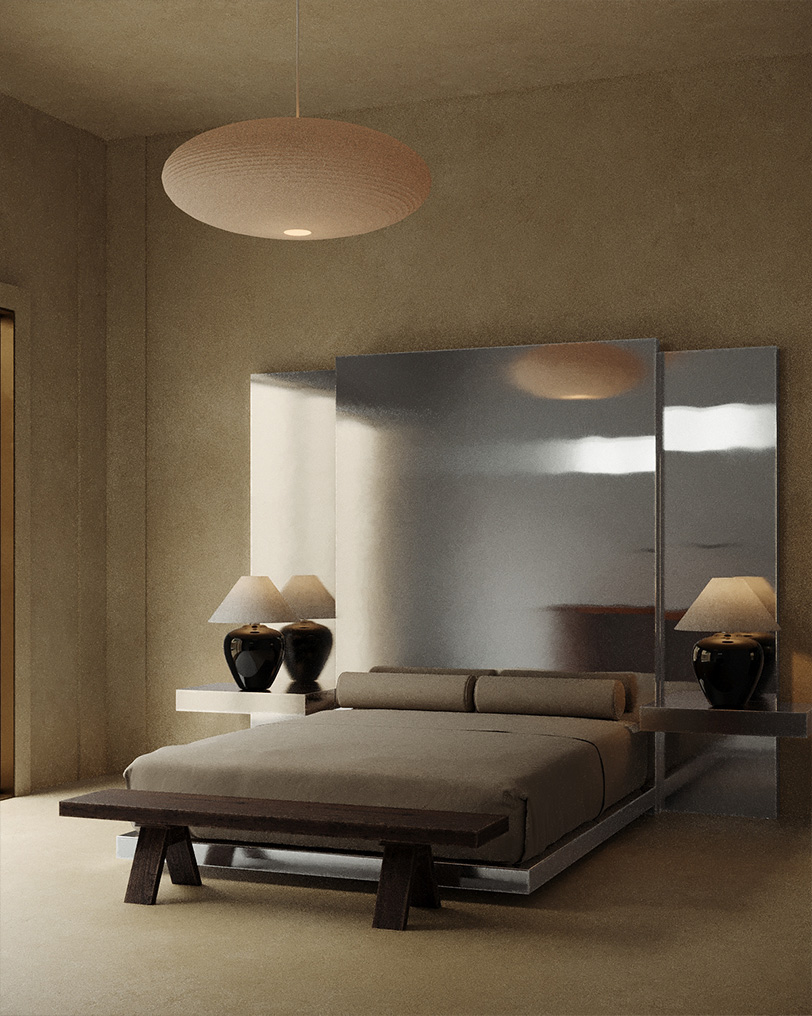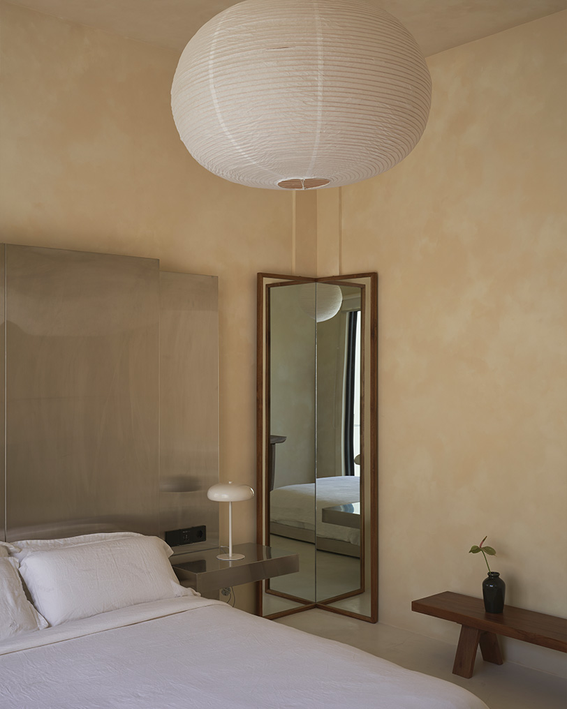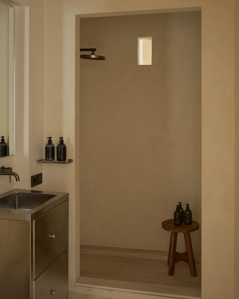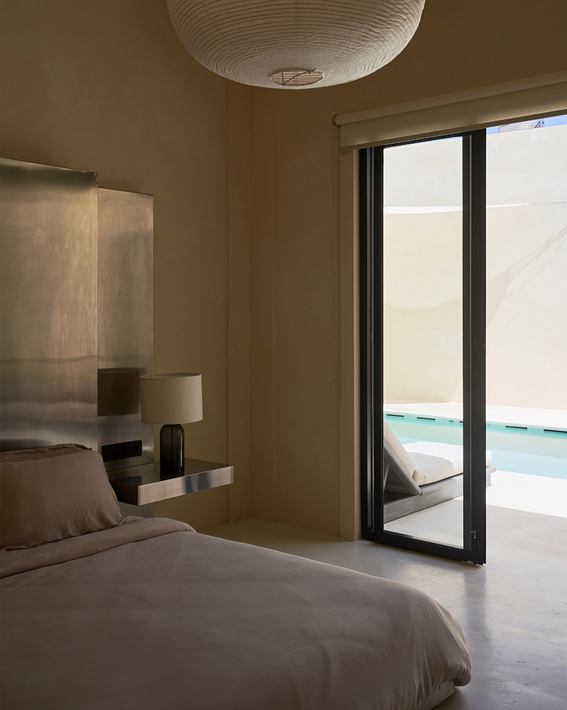 «Работая над архитектурой проекта, мы руководствовались стремлением создать пространство для визуального отдыха: когда попадаешь в него, это особенно считывается. Так, например, стены от разных объемов образовали внутренний двор, где мне хотелось создать визуально чистую зону. Поэтому мы решили использовать единый материал на фасадах, ограждающих территорию, стенах, полу и в зоне бассейна. Чтобы добавить глубины достаточно лаконичному пространству, мы поработали с переходами между элементами: «зависшие» объемы в виде лежаков и ступеней, края бассейна, двери-окна. Эти детали также говорят о пространстве, застывшем во времени, где можно отдохнуть от суеты. В интерьере хотелось продолжить заданную концепцию единства, монументальности, статичности, безмятежности. Планировка выстроена на осях и достаточно симметрична. В спальнях и санузлах сделан акцент на самодостаточных формах, которые являются доминантами помещений: кровать и ниша для умывания. Здесь мы снова старались добавить глубину аскетичному пространству уже за счет взаимодействия материалов по принципу теплый (микроцемент) — холодный (металл)», — Полина Дицман архитектор, основатель Архитектурного бюро Полины Дицман.