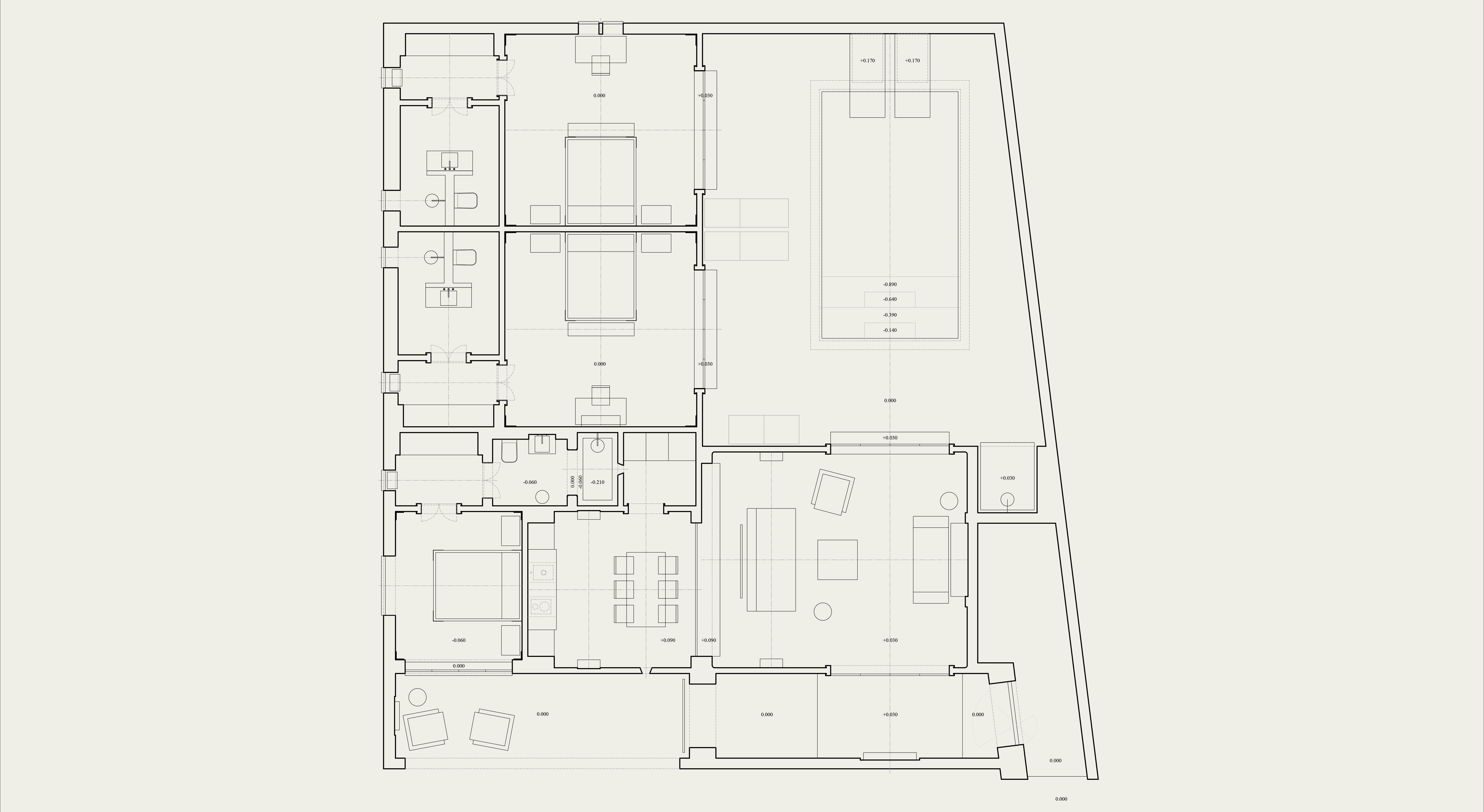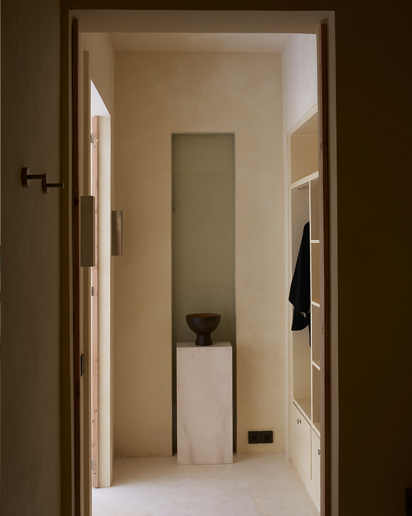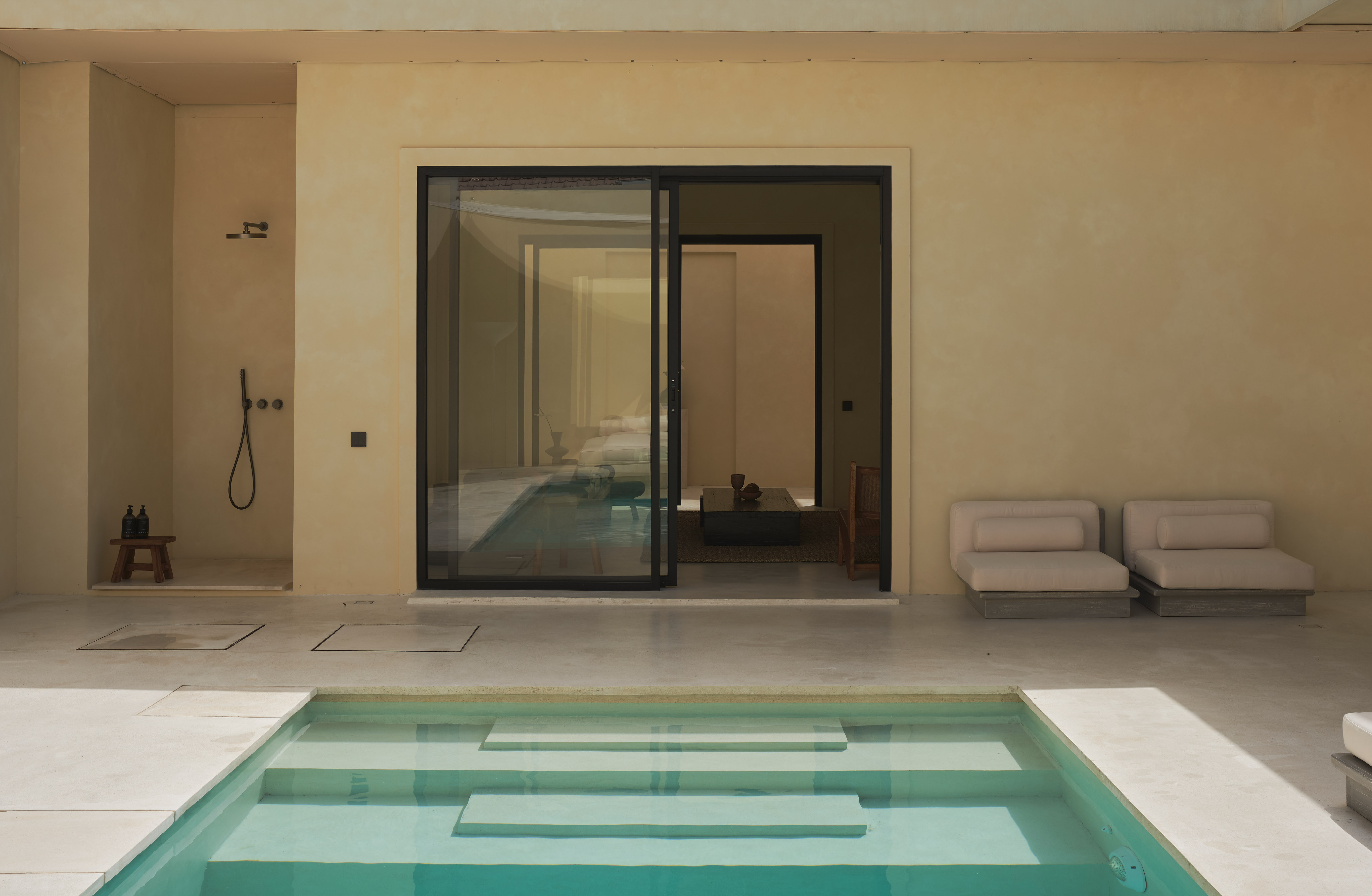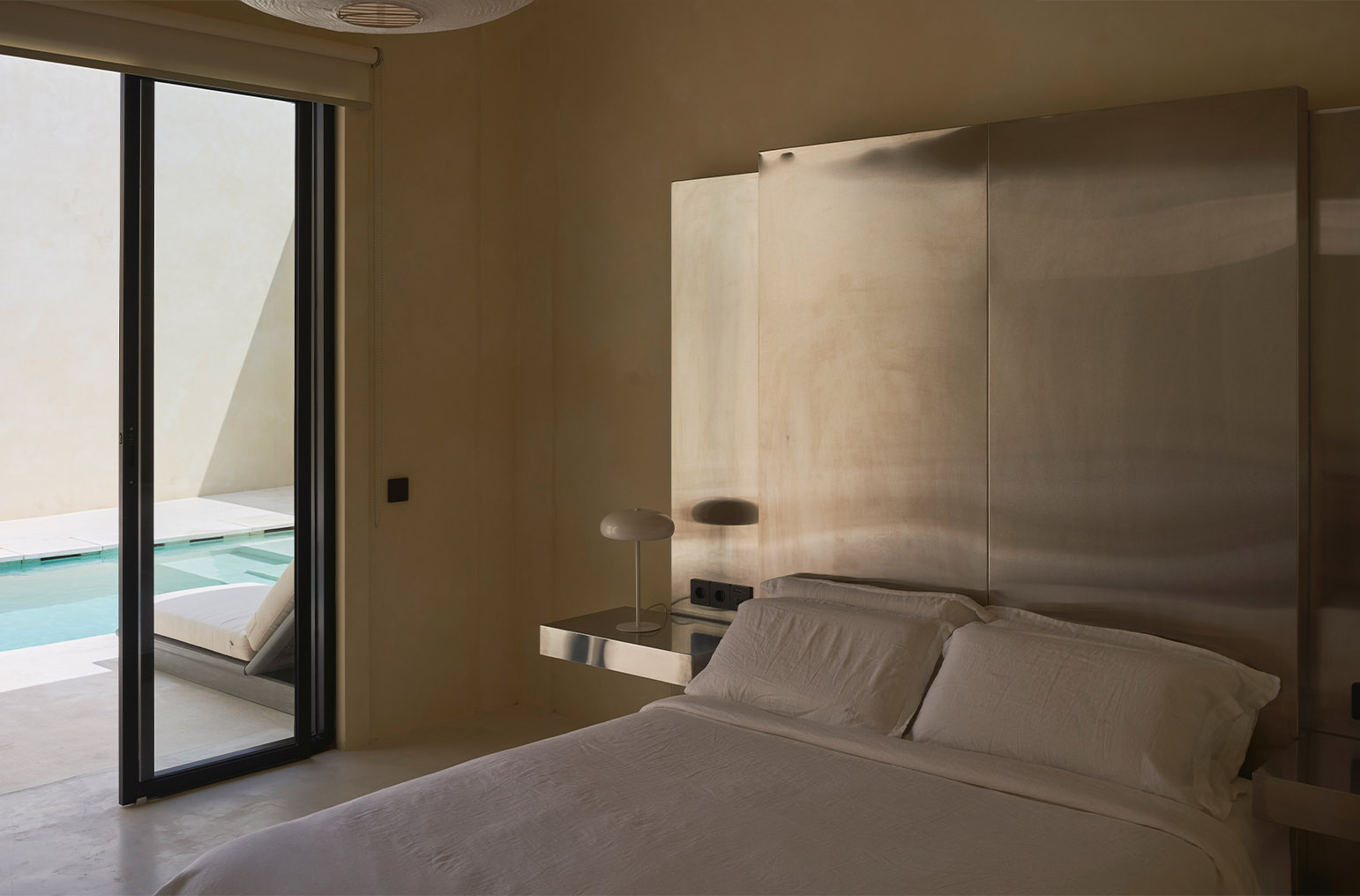 «Работая над архитектурой проекта, мы руководствовались стремлением создать пространство для визуального отдыха: когда попадаешь в него, это особенно считывается. Так, например, стены от разных объемов образовали внутренний двор, где мне хотелось создать визуально чистую зону. Поэтому мы решили использовать единый материал на фасадах, ограждающих территорию, стенах, полу и в зоне бассейна. Чтобы добавить глубины достаточно лаконичному пространству, мы поработали с переходами между элементами: «зависшие» объемы в виде лежаков и ступеней, края бассейна, двери-окна. Эти детали также говорят о пространстве, застывшем во времени, где можно отдохнуть от суеты. В интерьере хотелось продолжить заданную концепцию единства, монументальности, статичности, безмятежности. Планировка выстроена на осях и достаточно симметрична. В спальнях и санузлах сделан акцент на самодостаточных формах, которые являются доминантами помещений: кровать и ниша для умывания. Здесь мы снова старались добавить глубину аскетичному пространству уже за счет взаимодействия материалов по принципу теплый (микроцемент) — холодный (металл)», — Полина Дицман архитектор, основатель Архитектурного бюро Полины Дицман.