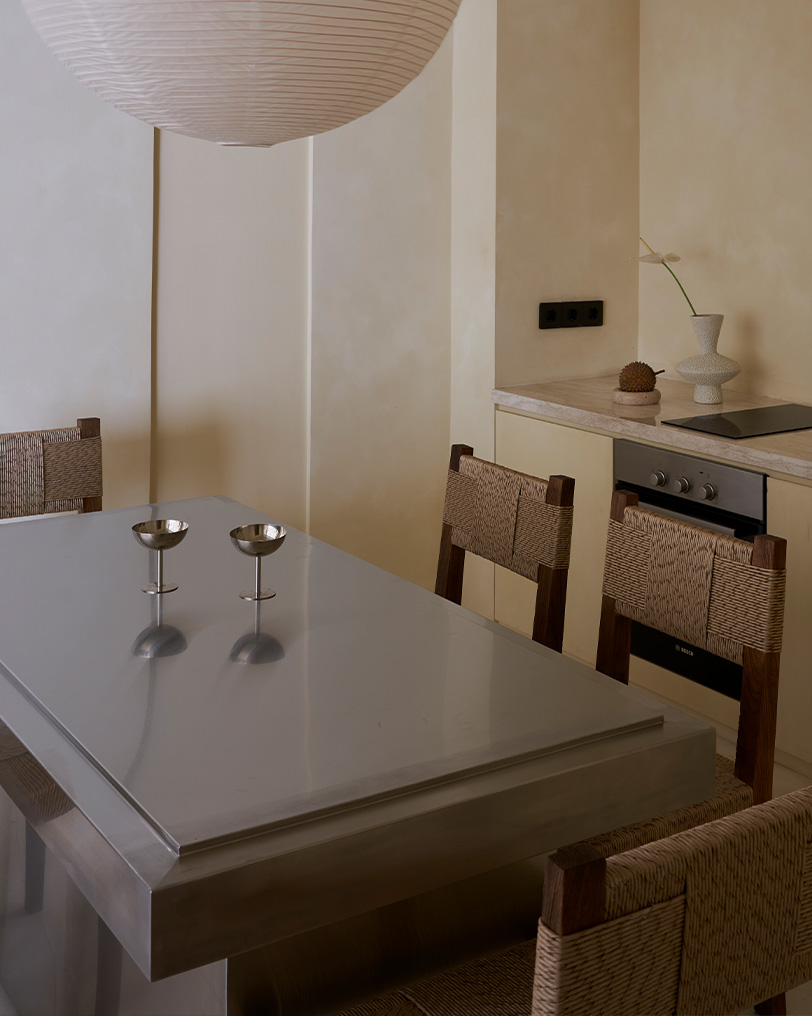 Один из любимых моих предметов и также разработка Полины Дицман. Мы часто выносим его к открытой зоне с бассейном, собираем друзей, устраиваем ужины на закате, делаем сервировки. Он создает чувство семьи и объединения.
