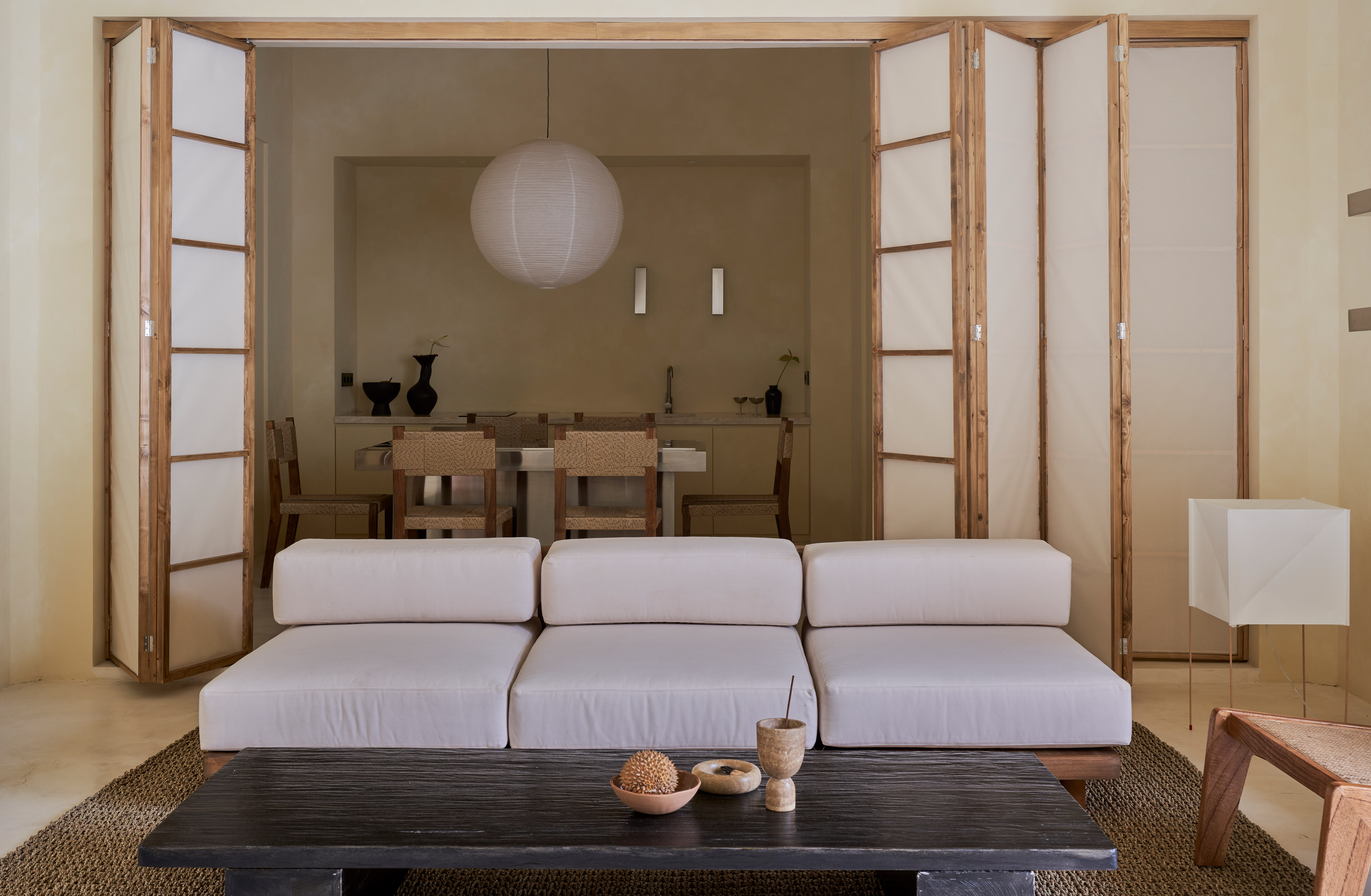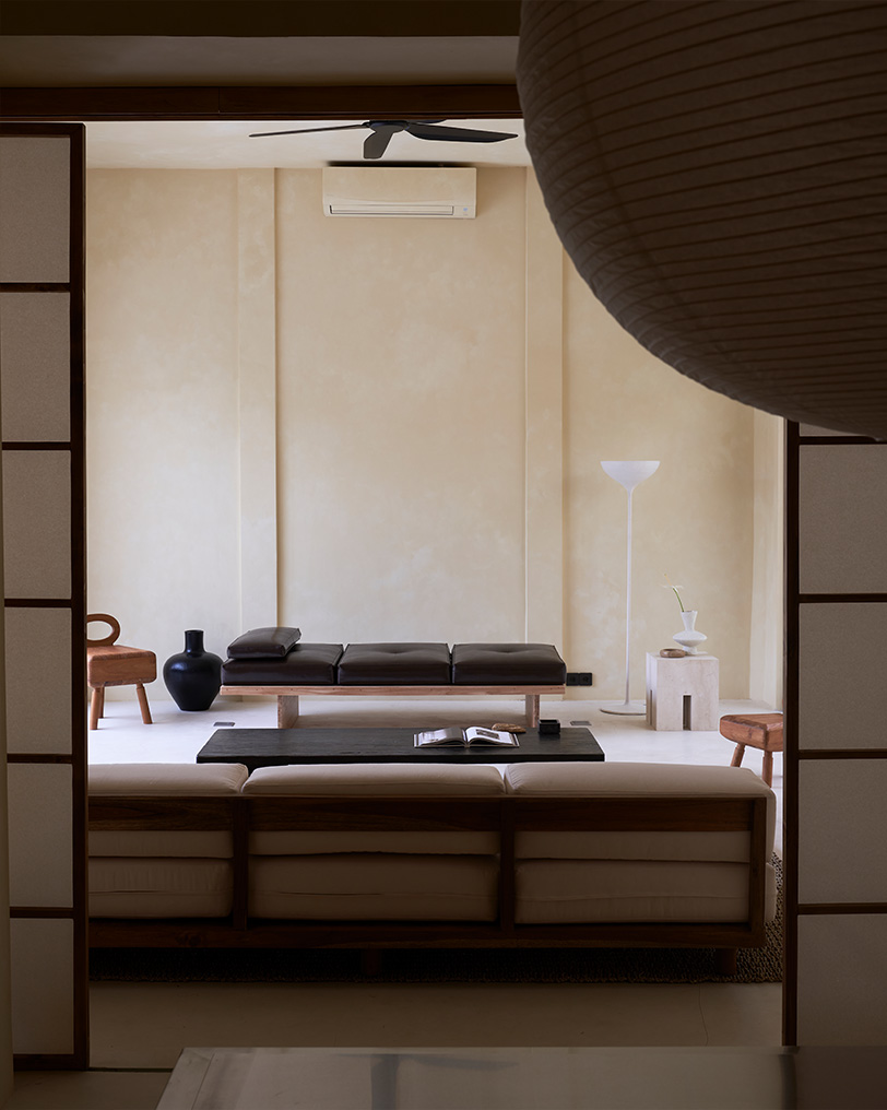 Важно было начать работу над виллами быстро и найти человека, с кем совпадаем по эстетике и тому, что нравится. Я сразу подумала про архитектора Полину Дицман, наше видение во-многом совпадает, и мы дружим. Спустя пару месяцев начали стройку и завершили реализацию проекта через год в декабре 2023 года. Процесс был трудный. Мы сменили трех подрядчиков – они просто исчезали с деньгами, оставляя за собой недоделанную работу. Тяжело было сделать нетипичную мебель на заказ, не такую, как делают на Бали. Местные подрядчики воспринимали референсы буквально, и результат выглядел плохо. Также необходимо было контролировать работу в мельчайших деталях с каждым подрядчиком на ежедневной основе, поэтому почти весь год мы жили на Бали. Иногда было надежнее сделать самим, чем доверять подрядчикам. Например, мы сами клеили японскую бумагу на двери – тут не было права на ошибку!