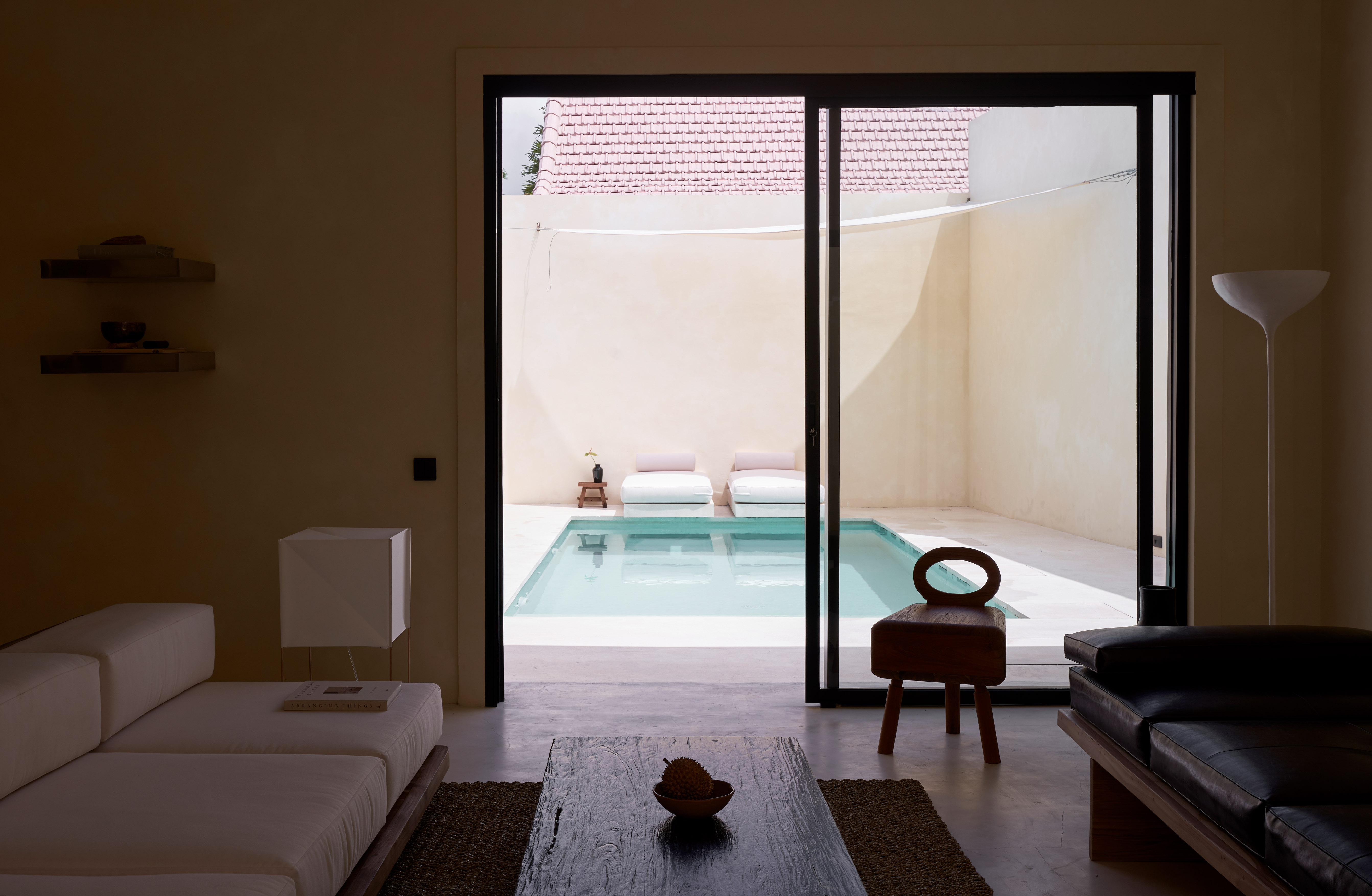 Дизайн интерьера был выполнен архитектурным бюро Полиной Дицман. Получилось минималистичное пространство с правильной геометрией, выдержанное в теплых тонах с обилием металла. Вилла вдохновлена японским минимализмом и элементами традиционных индонезийских интерьеров.