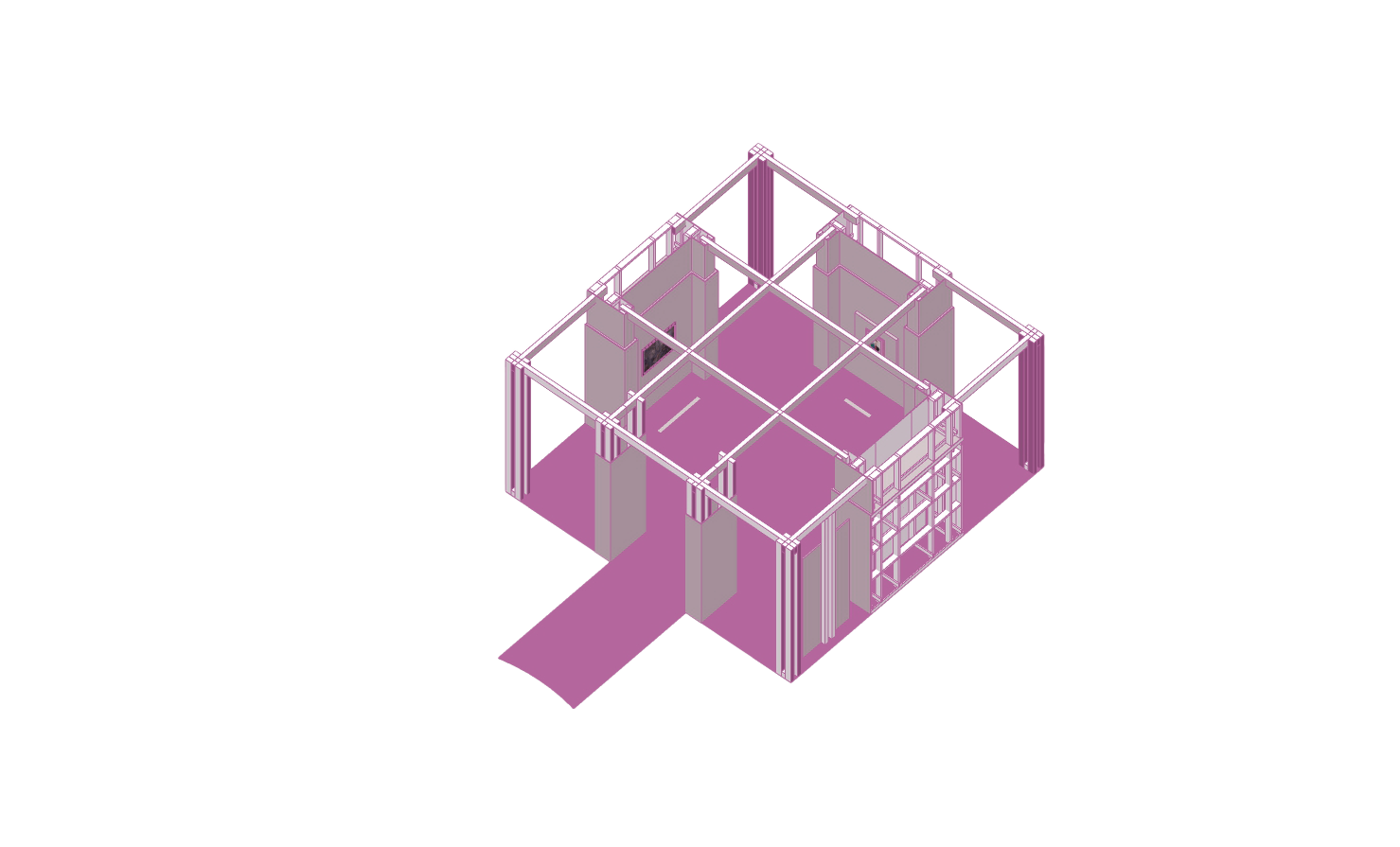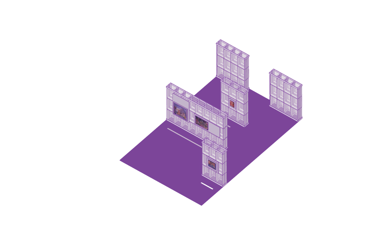 Мы много думали об «изнаночной» стороне павильонов — о пространстве «между» комнатами. Сначала оно казалось чем-то вроде моря или молока — границей, пустотой без содержания. Но и ей нужно было задать характер, чтобы яснее выстроить маршрут. Учитывая театральность нашего подхода, честным шагом стало решение обнажить конструкцию павильонов снаружи — показать, что это не имитация зданий, не долговечные объекты, а именно «театральная» декорация. При этом «фасады» спроектированы не только по конструктивной необходимости — композиция из вертикальных стоек и горизонтальных связей не случайна. Мы хотели создать контраст между внутренним «содержанием» каждого павильона и внешней унифицированной, гомогенной средой, в которой они существуют — бродить по этому «молоку» для нас оказывается не менее интересно, чем по самой выставке.