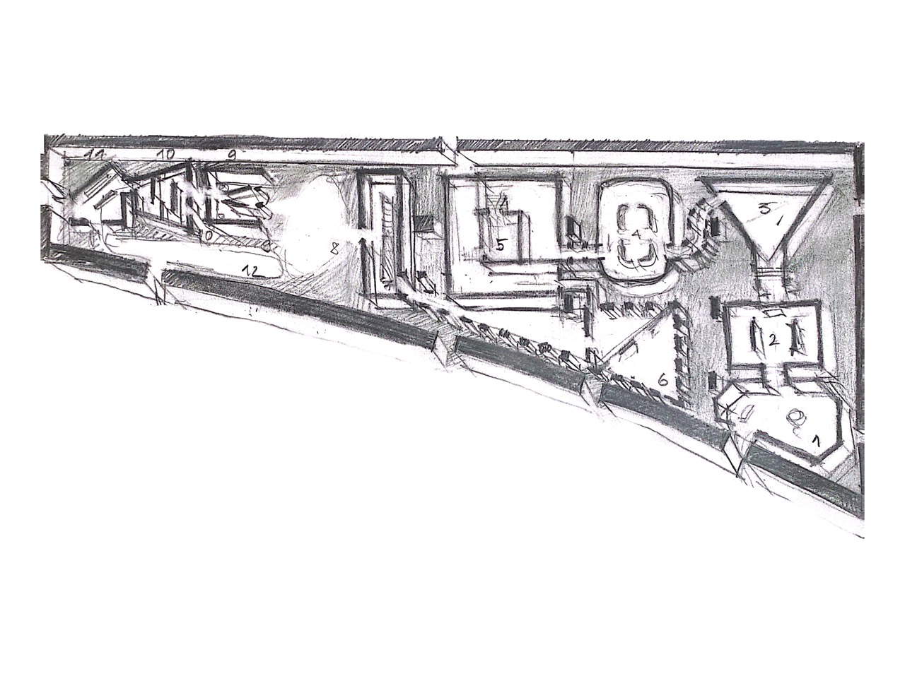 Шестой и двенадцатый павильоны — особые точки, где маршрут можно «пересобрать»: из них видны и пройденные, и будущие залы. Это момент свободного выбора — развернуться, пройти круг снова или иначе. Внутри первой шестерки выделяются павильоны 1–4. Хотя архетипы там разные, все они ясные и простые — поэтому их формы построены на базовой геометрии: трапеция, треугольник, прямоугольник, восьмиугольник. Так возникает ощущение этапа, роста.