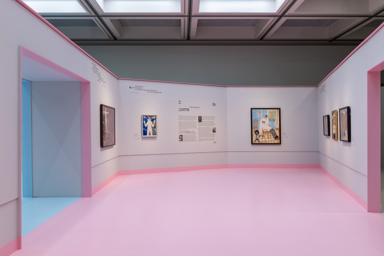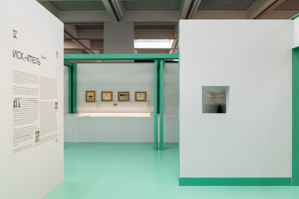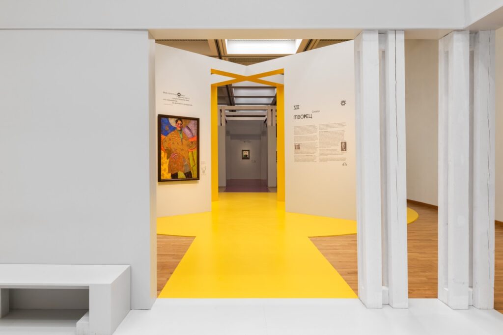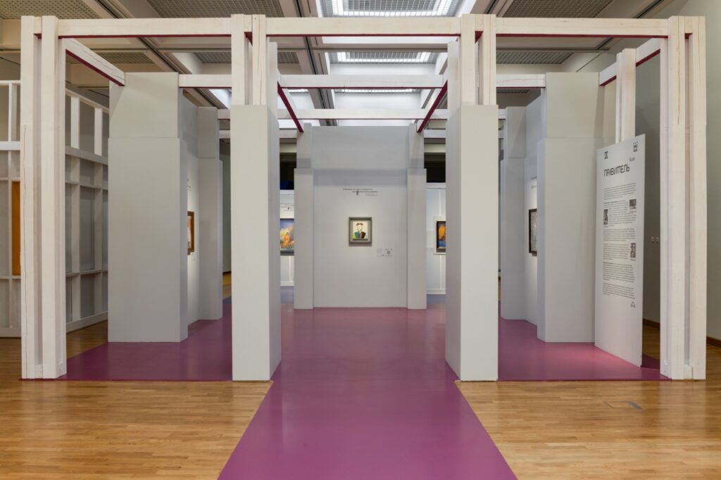 Над этим вопросом мы долго размышляли. Во время стройки даже возникли сомнения — не переборщили ли мы? Без картин и графики пространство казалось слишком интенсивным, но как только появились работы, этикетки, тексты — все встало на свои места. Так мы пришли к ответу. Архитектура во многом вторит экспозиции, она не является главным выставочным объектом. Однако в зависимости от концепции может быть как нейтральным фоном, так и мощным аккомпанементом. Наш случай, конечно, второй. Оригинальная идея требовала ярких и выразительных решений — именно такой подход сделал выставку запоминающейся.