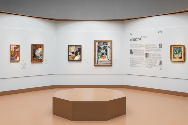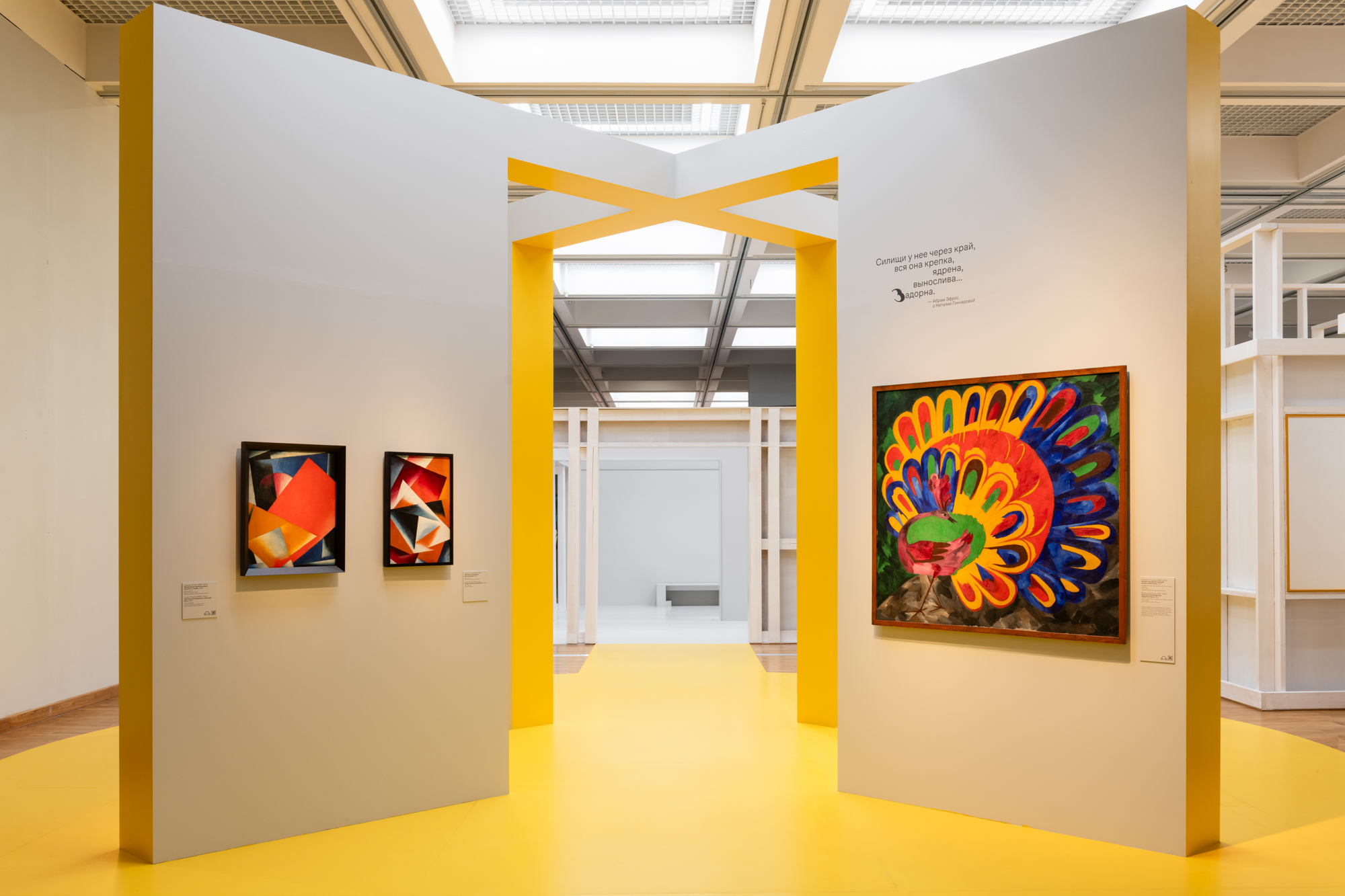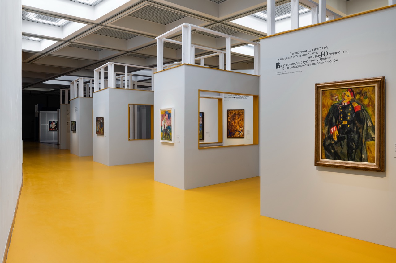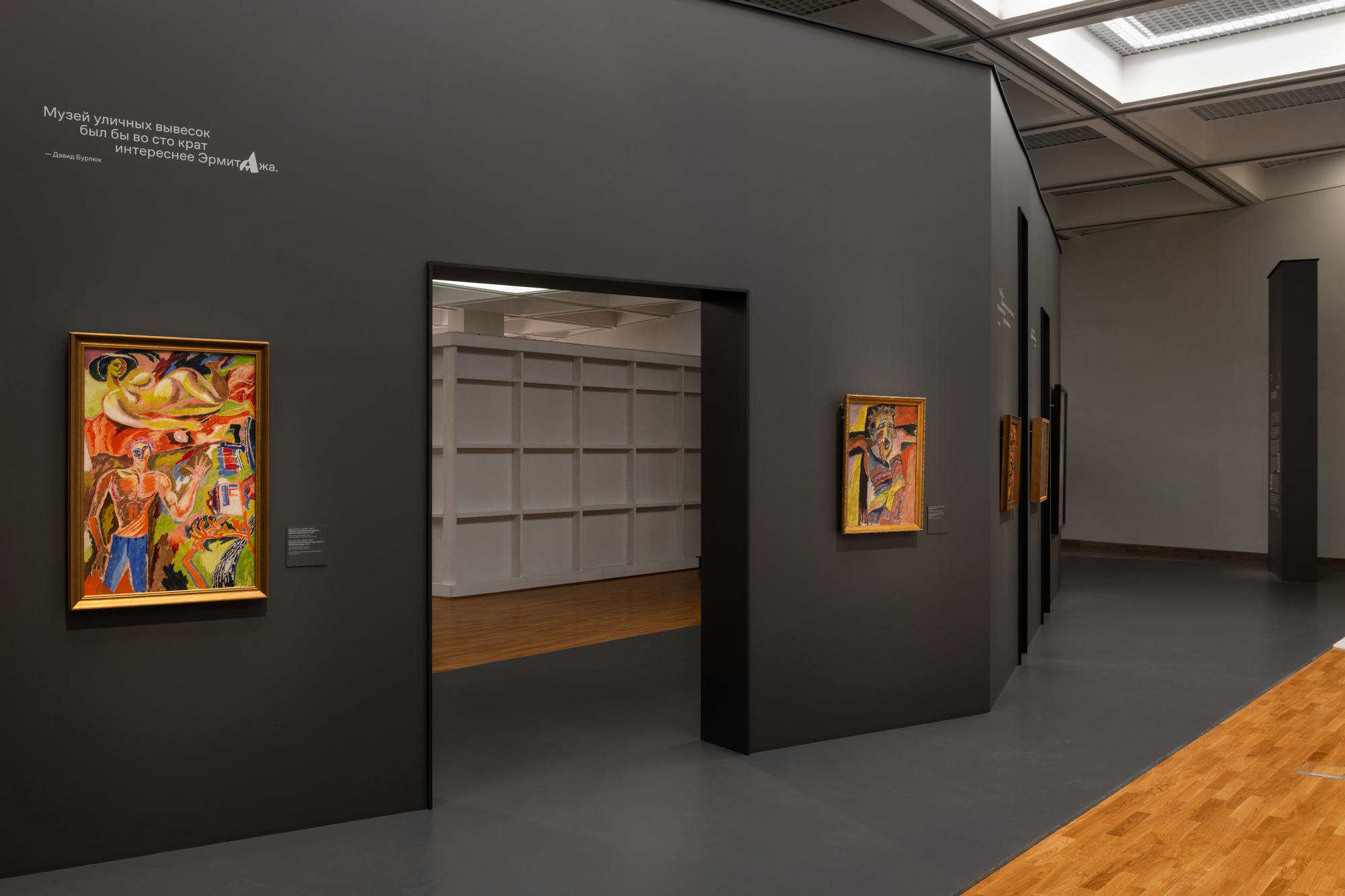 Над этим вопросом мы долго размышляли. Во время стройки даже возникли сомнения — не переборщили ли мы? Без картин и графики пространство казалось слишком интенсивным, но как только появились работы, этикетки, тексты — все встало на свои места. Так мы пришли к ответу. Архитектура во многом вторит экспозиции, она не является главным выставочным объектом. Однако в зависимости от концепции может быть как нейтральным фоном, так и мощным аккомпанементом. Наш случай, конечно, второй. Оригинальная идея требовала ярких и выразительных решений — именно такой подход сделал выставку запоминающейся.
