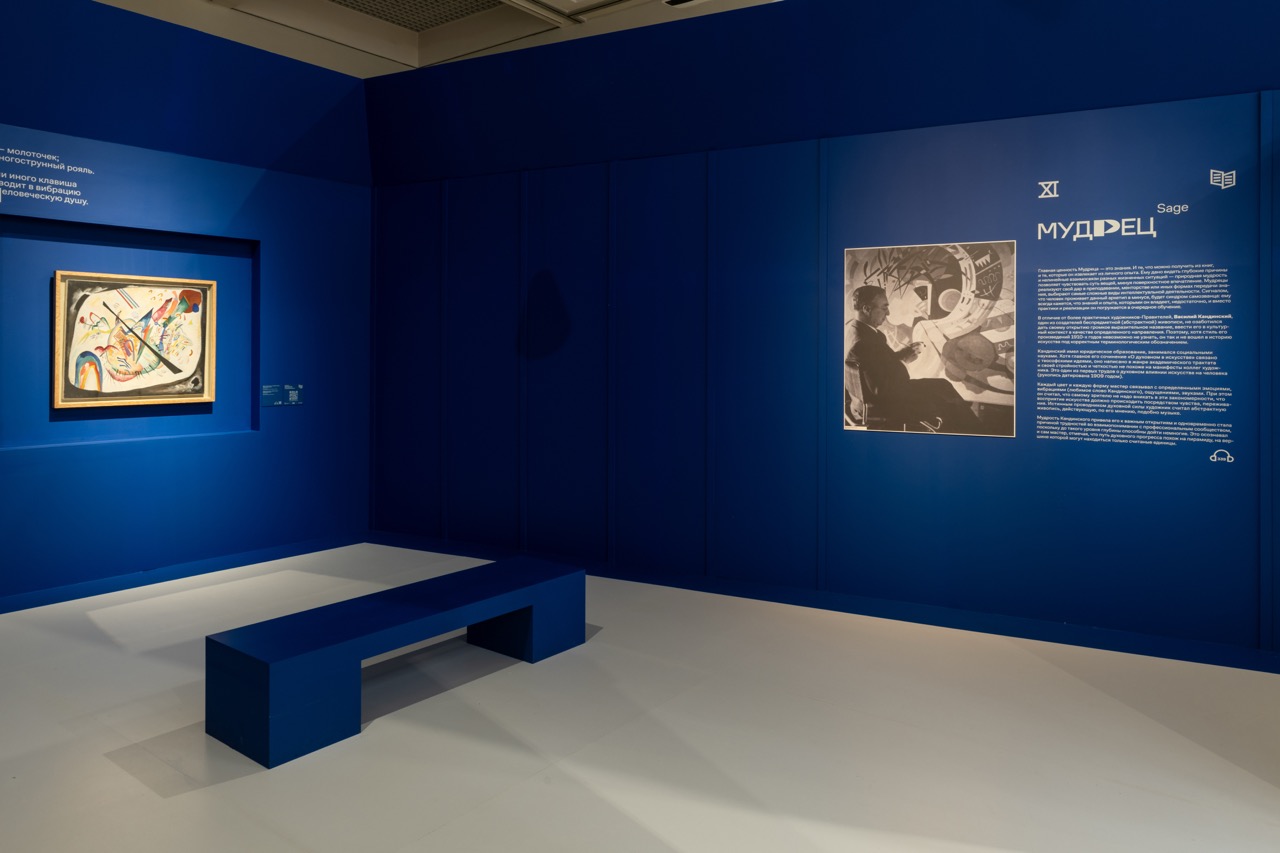 И геометрические фигуры, и цвета имеют свои особые черты, свой характер, как и архетипы. То есть в основном мы опирались на эпитеты, характеризующие архетип, переводя их в архитектурные/геометрические образы и формы. Аналогично и с цветом. Хоть во многом цветовая гамма была предопределена куратором, мы старались через подобную интерпретацию понять, какие переживания и эмоции цвет способен передать, в какой плоскости, какие черты подчеркнуть и т. д. Например, в павильоне «Мудрец» (11-й), где всего одна картина, мы перевернули привычную логику: цветом выделили не пол, а стены и карниз — чтобы гипертрофировать глубину пространства и усилить впечатление от работы.