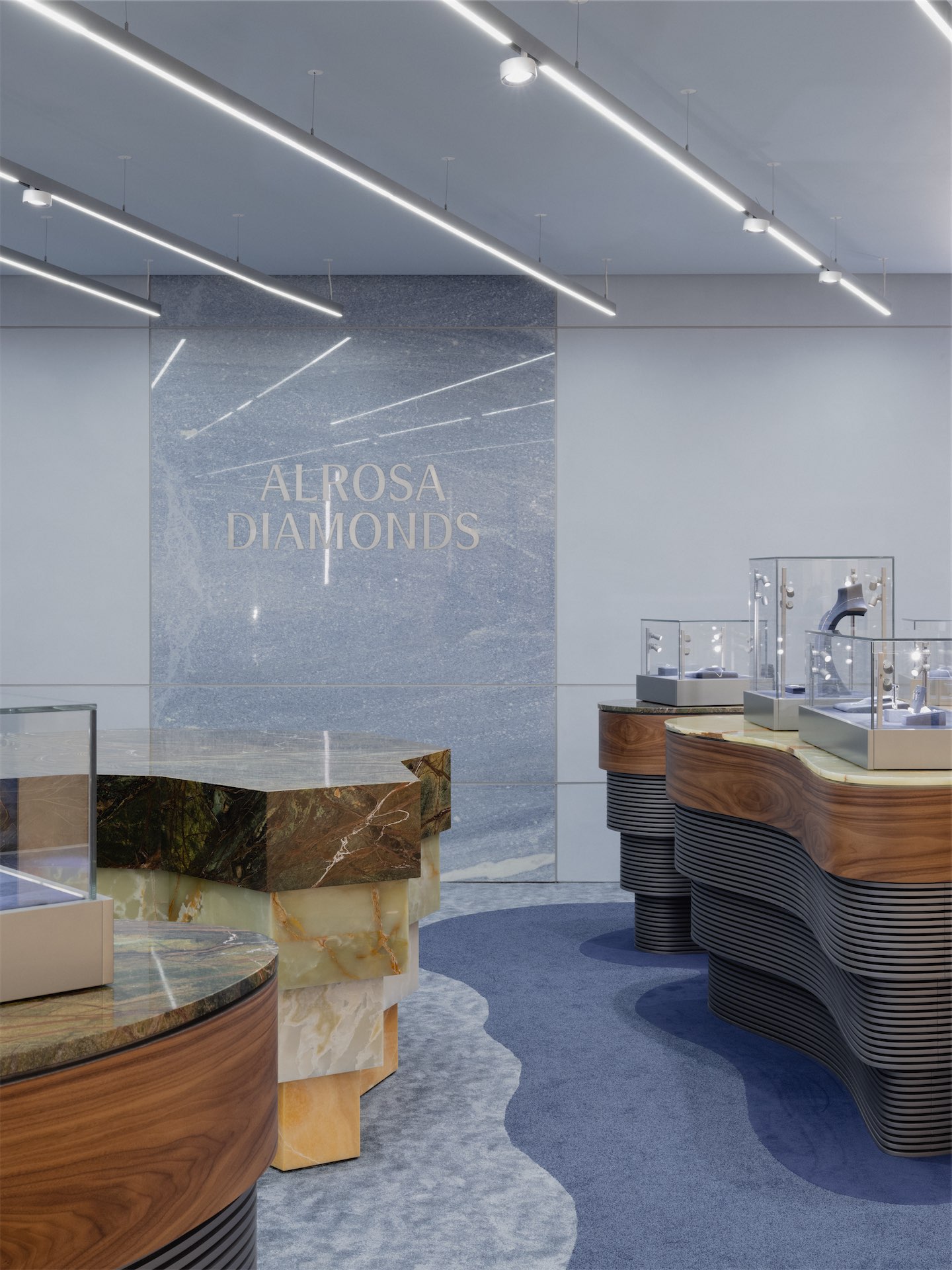 В галерее «Времена года» открылся самый большой бутик ALROSA Diamonds по проекту бюро KOZEEN+RUEDA Станислава Козина и Марсело Руэда. Это третье пространство бренда, над которым работает дуэт архитекторов: бутики на Петровке (о нем писали подробнее тут) и в Столешниковом переулке были предыдущими главами единой истории о Якутии. В интерьере они обращаются к географическим образам региона.