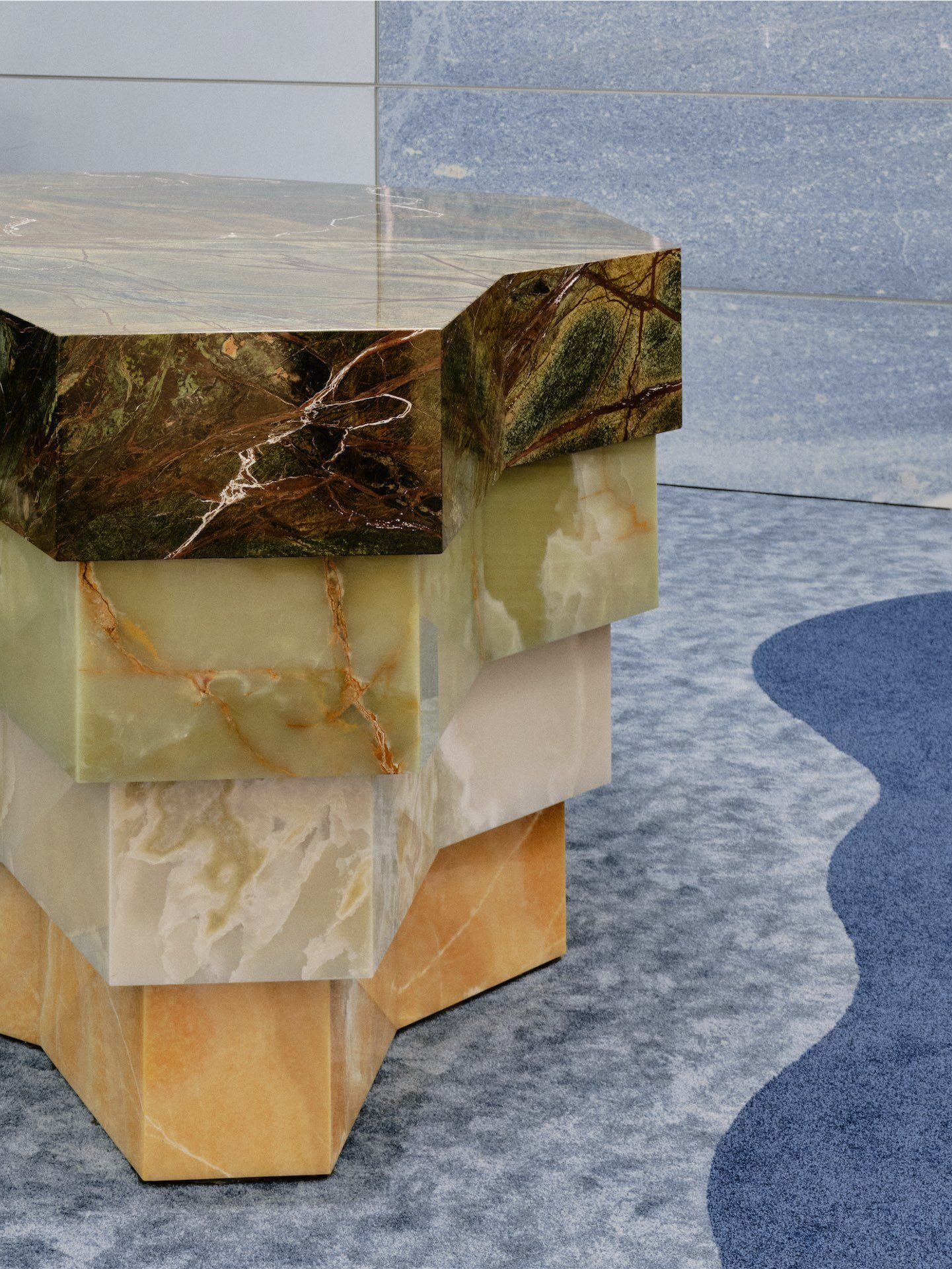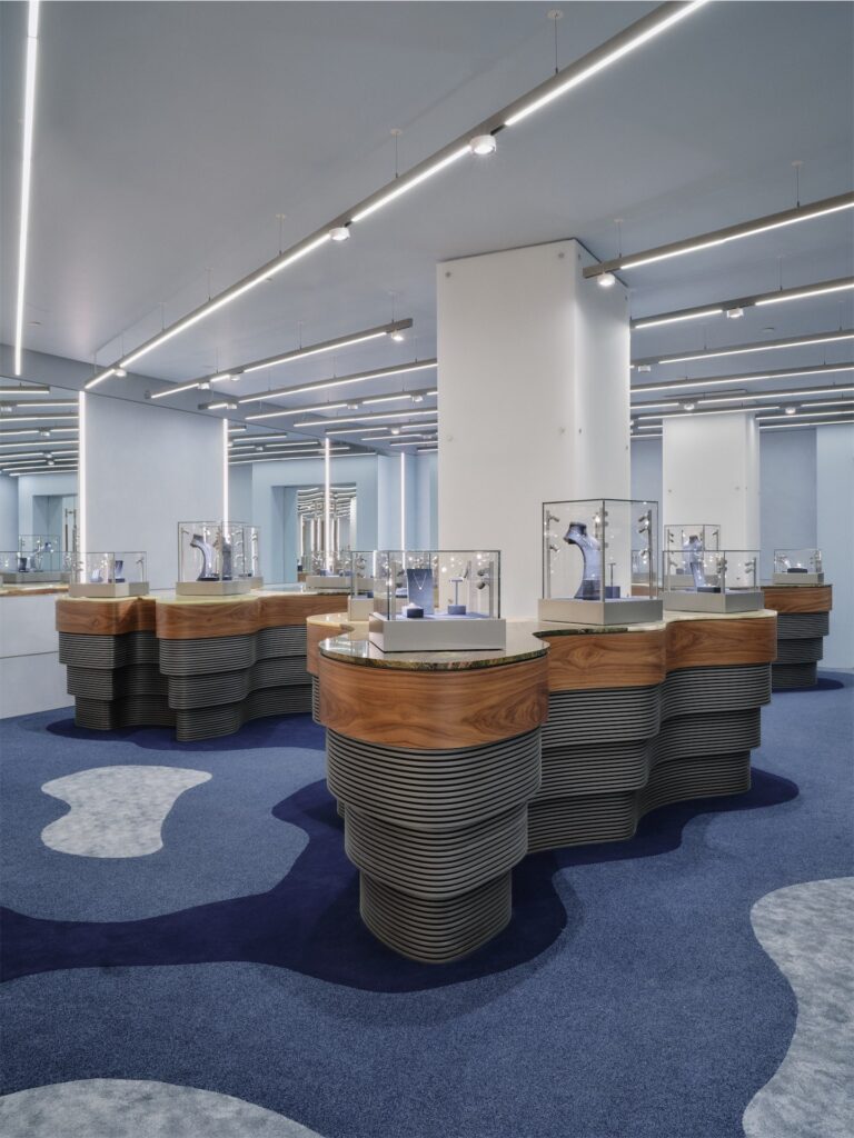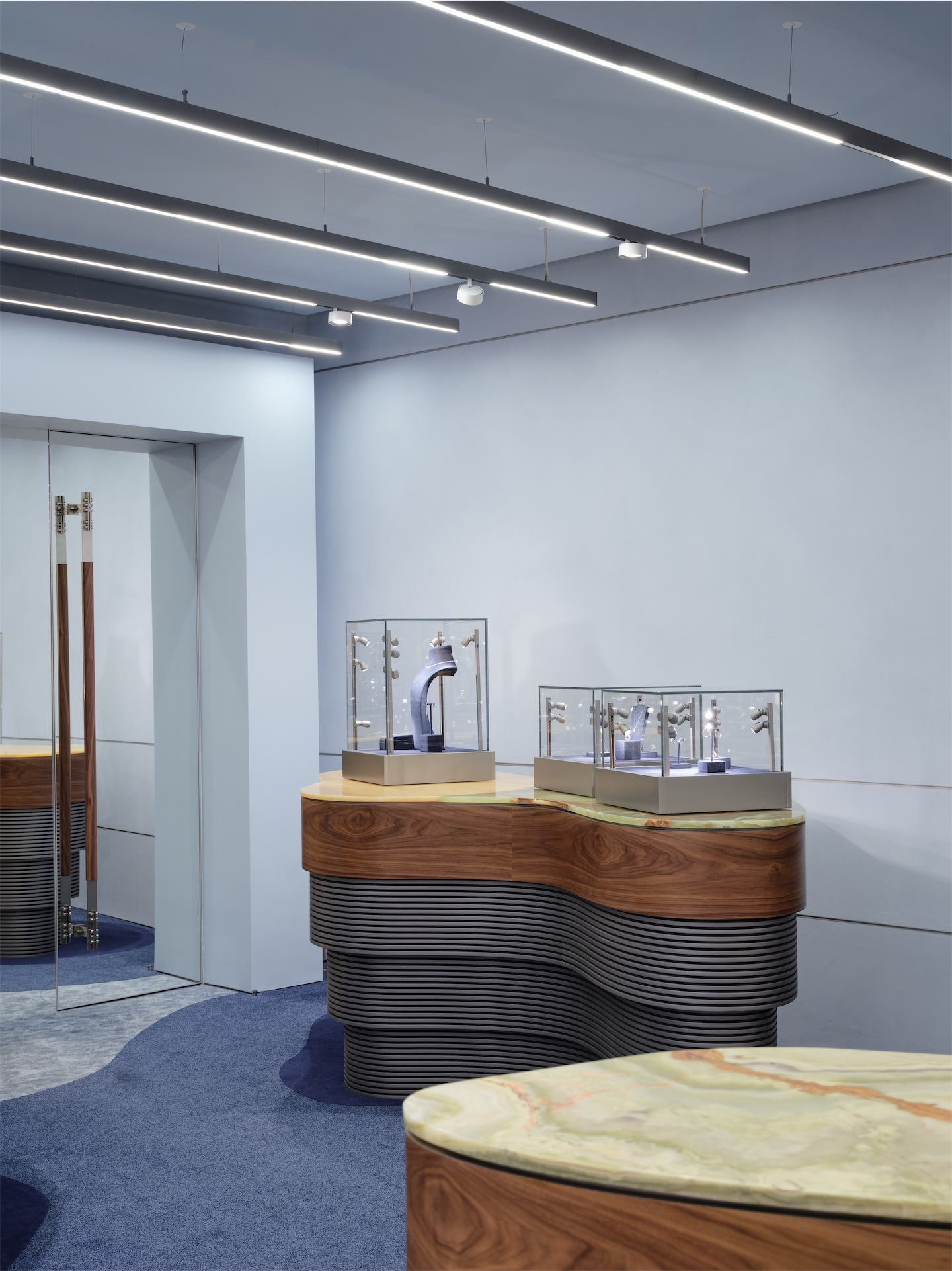 Главное интерьерное решение бутика — отдельно стоящие мебельные модули-острова с контрастом высот и органическими изгибами. Их вершины отделаны шпоном американского ореха, столешницы — из оникса трех видов и мрамора Rain Forest Green. Заказчиком также была поставлена задача сделать акцент на мебели.