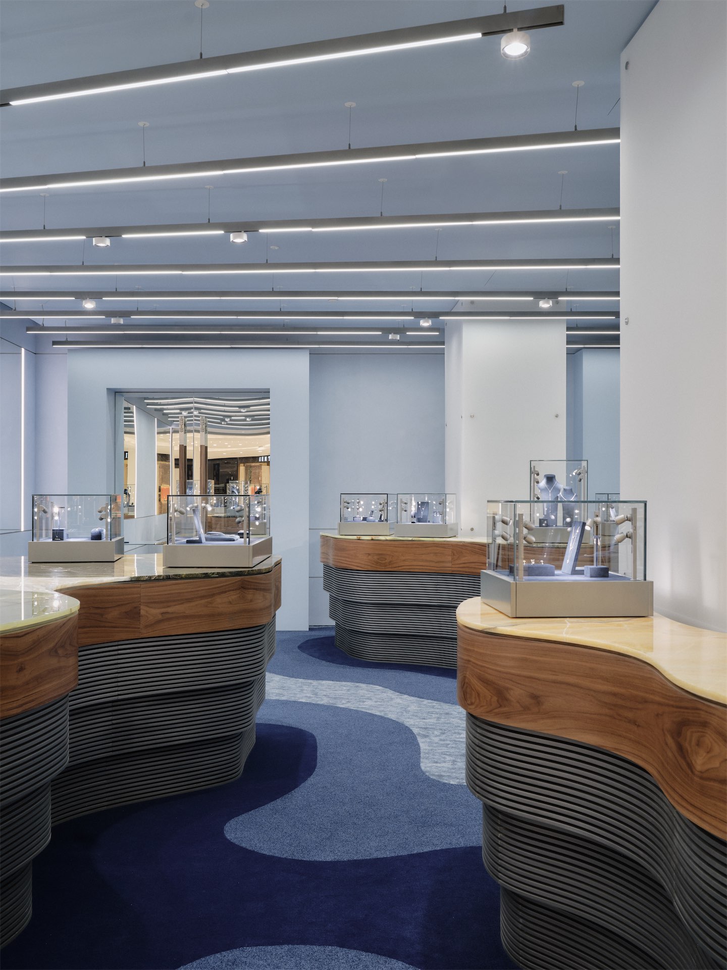 Темно-синий и голубой ковролин изображает воду: рисунок расходится кругами от основания каждого острова, повторяя его очертания и одновременно задавая маршруты по залу. Стены и потолок выполнены в прохладно-голубом оттенке, отсылая к атмосфере первозданной северной природы. Подвесные светильники у входа расходятся лучами, повторяя закругленную форму главного зала торговой галереи.
