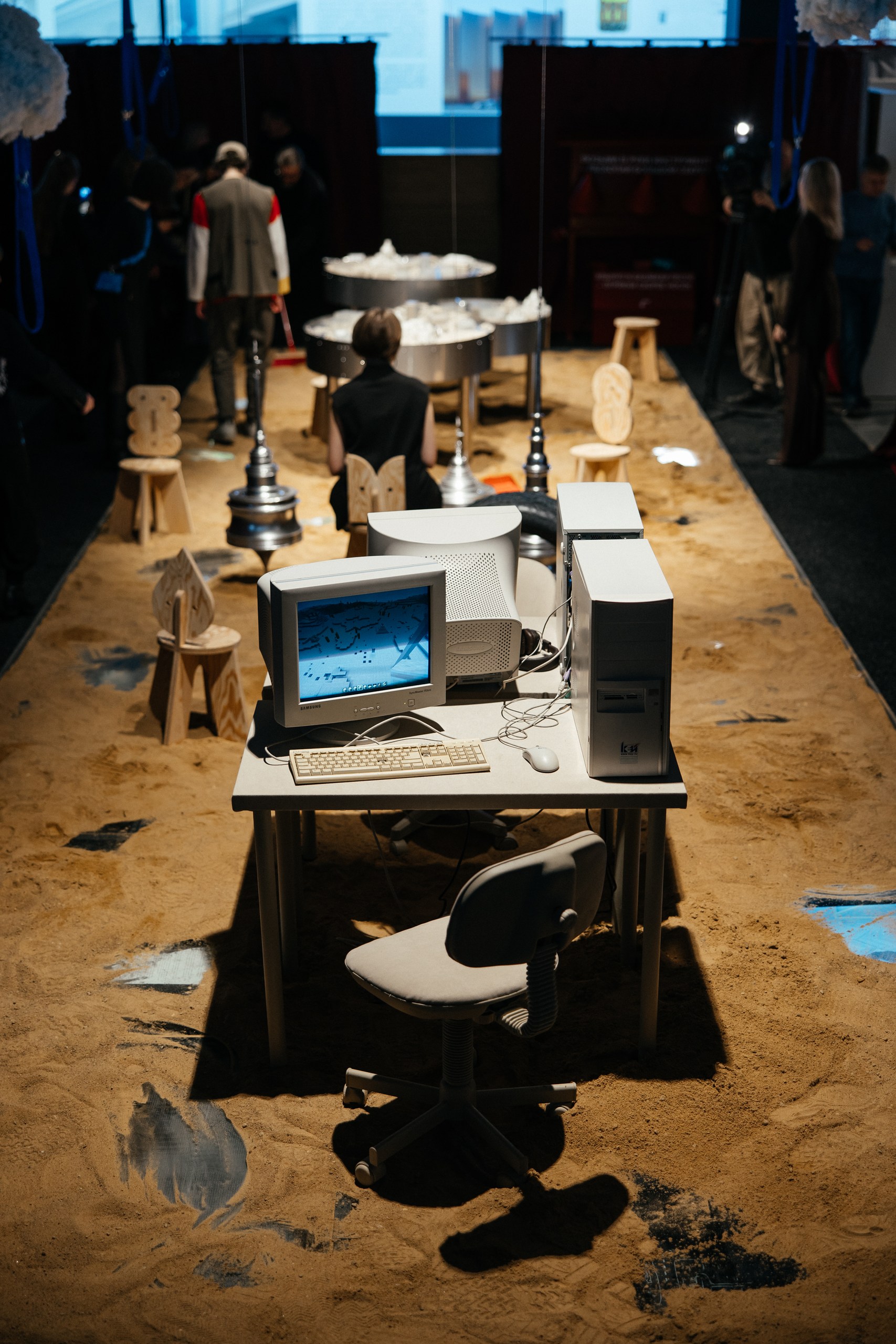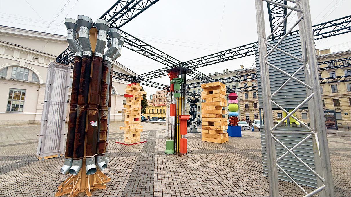 Инсталляция «Песочница» — интерактивное пространство с песком и архитектурными «игрушками» от 16 молодых петербургских архитекторов, где можно собирать формы знакомых зданий из песка на вибростолах, запускать волчки со шпилями и играть с другими объектами, смотря на город как площадку для творчества и эксперимента.