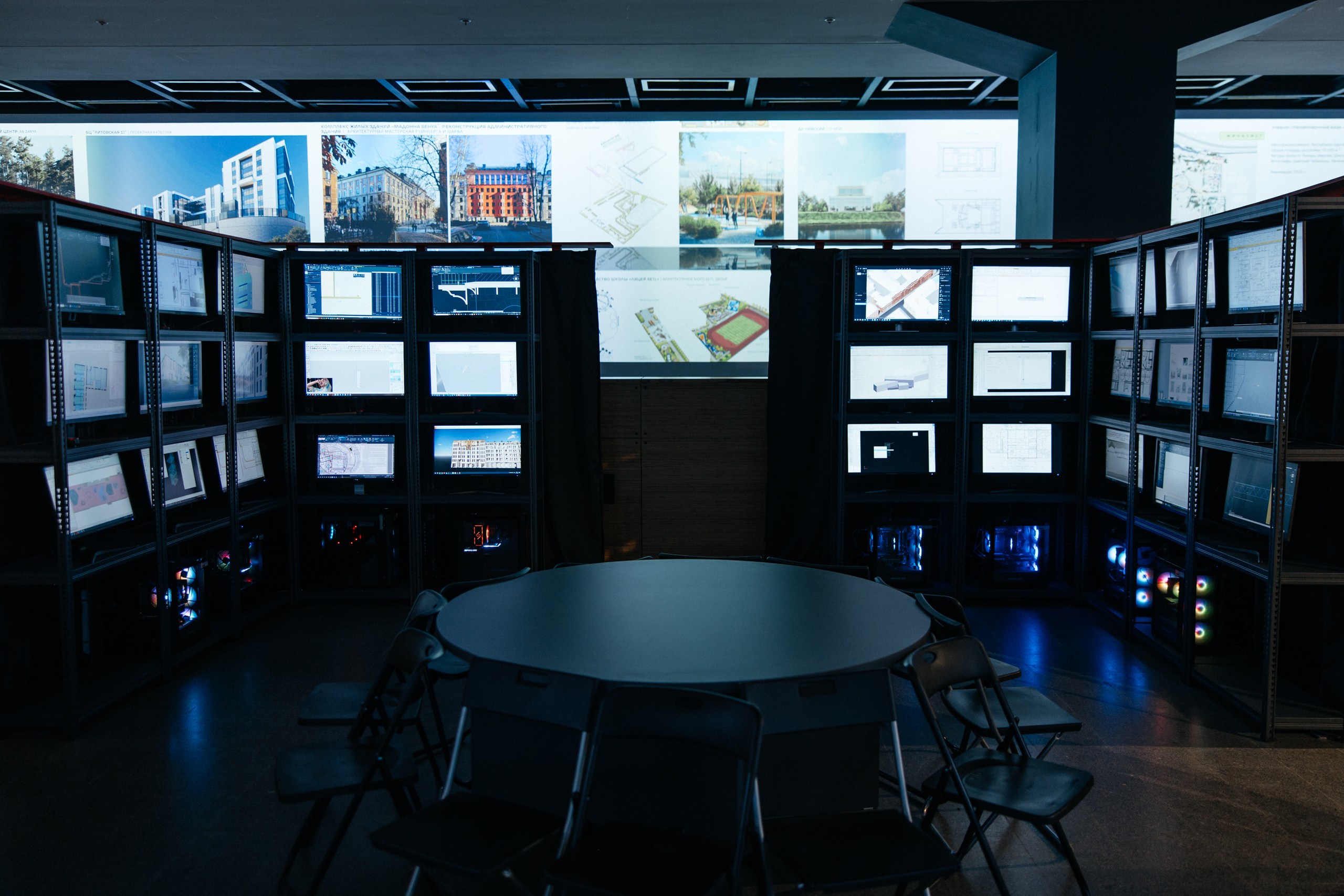 Мультимедийная инсталляция архитектурного бюро «Студия 44», состоящая из множества мониторов, показывает, как работает бюро: на каждом экране можно посмотреть прямую трансляцию параллельно происходящих в офисе бюро процессов — черчения, создания рендеров, 3D-моделей и других рабочих процессов.