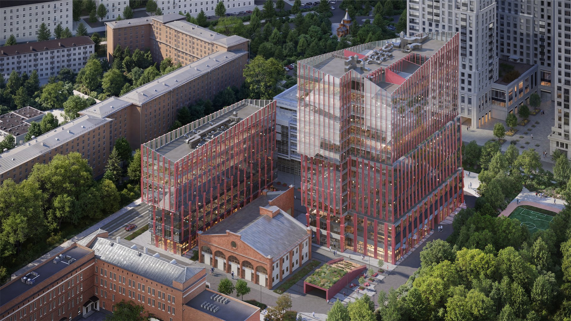 «Мы переосмыслили историческую морфологию — горизонтальное членение объемов и вертикальный шаг с разным ритмом — и перевели ее на современный архитектурный язык. Сложный розово-терракотовый оттенок фасадов позволяет зданиям вписаться в контекст, дополняя его. Строгая фасадная сетка и декоративные пилоны подчеркивают промышленный характер, а пластика объемов делает его собранным и цельным», — отмечает Амир Идиатулин, архитектор, основатель бюро.