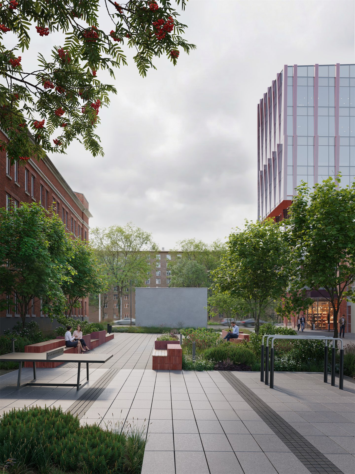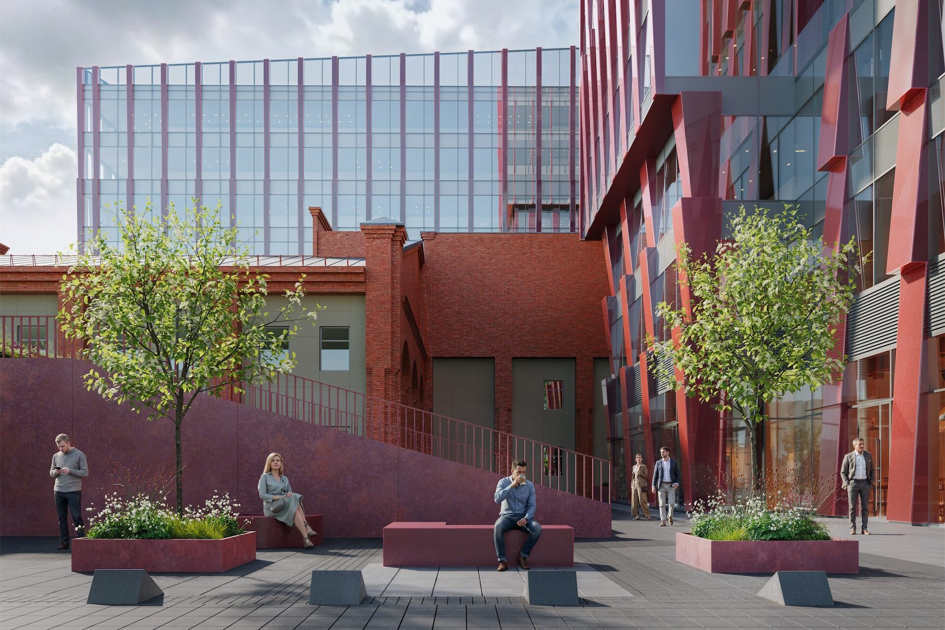 Решение благоустройства бизнес-центра «Upside Останкино» следует архитектурной логике здания и развивает индустриальную тему через контраст. Строгая геометрия мощения и фактуры малых форм соседствуют с насыщенными зелеными оазисами. Акцентный красный цвет проходит сквозной линией от фасадных деталей к элементам окружающего ландшафта, собирая элементы проекта в единое целое. Дворовое пространство включает в себя тихие зоны, спортивную площадку, амфитеатр для отдыха на открытом воздухе и неформальной работы.