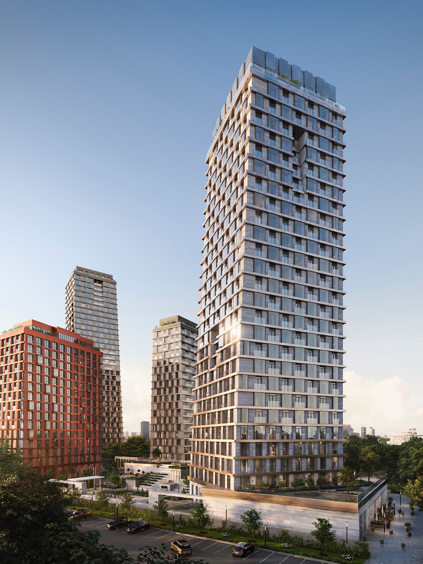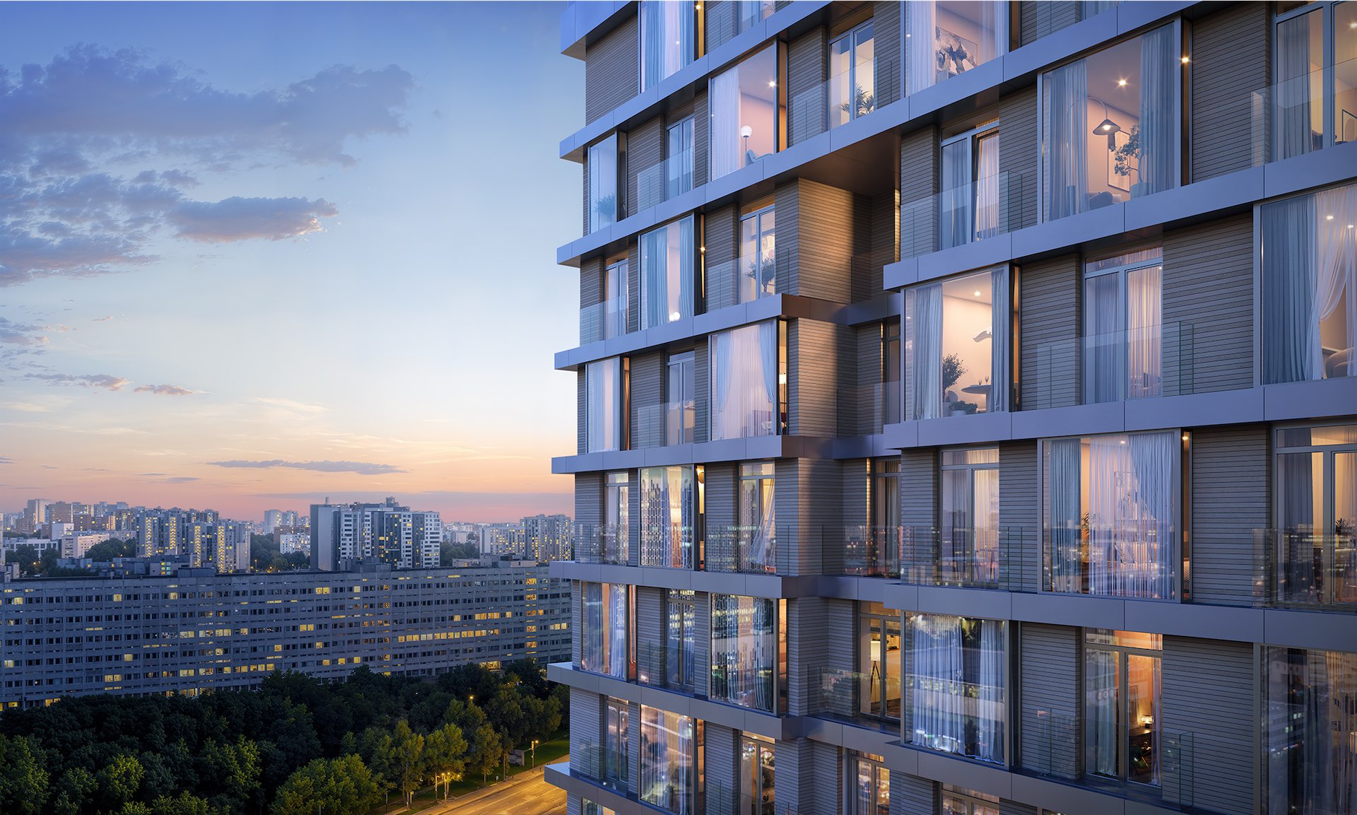 Архитектура в форме раскрытого веера позволила организовать в большинстве квартир открытые террасы с видами на Воробьевы горы. Для 117 резиденций проекта предусмотрены «секретный» сад в патио и лобби с камином, библиотекой и вечнозелеными растениями.