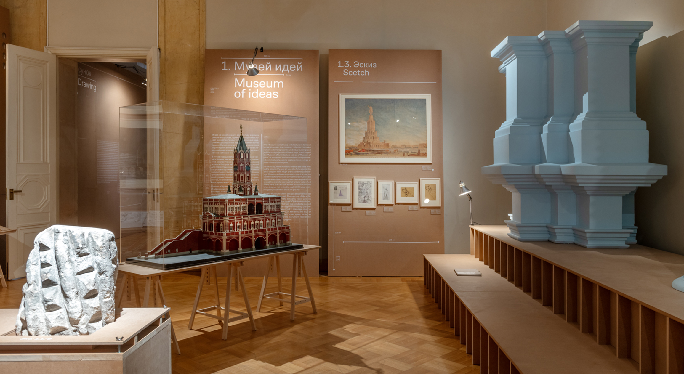 Черновые наброски и презентационные чертежи, фрагменты утраченных зданий и предметы интерьера, макеты, планы, архитектурные эскизы и наброски, фотографии и заметки, книги, воспоминания и альбомы, коллекции призваны служить одной цели — говорить с посетителем о том, что есть архитектура. Артем Стаборовский (архитектурное бюро Saga), Мила Силенина и Юля Кондратьева (студия графического дизайна Holystick) рассказали о том, как это — делать выставку про архитектуру в Музее архитектуры имени А. В. Щусева