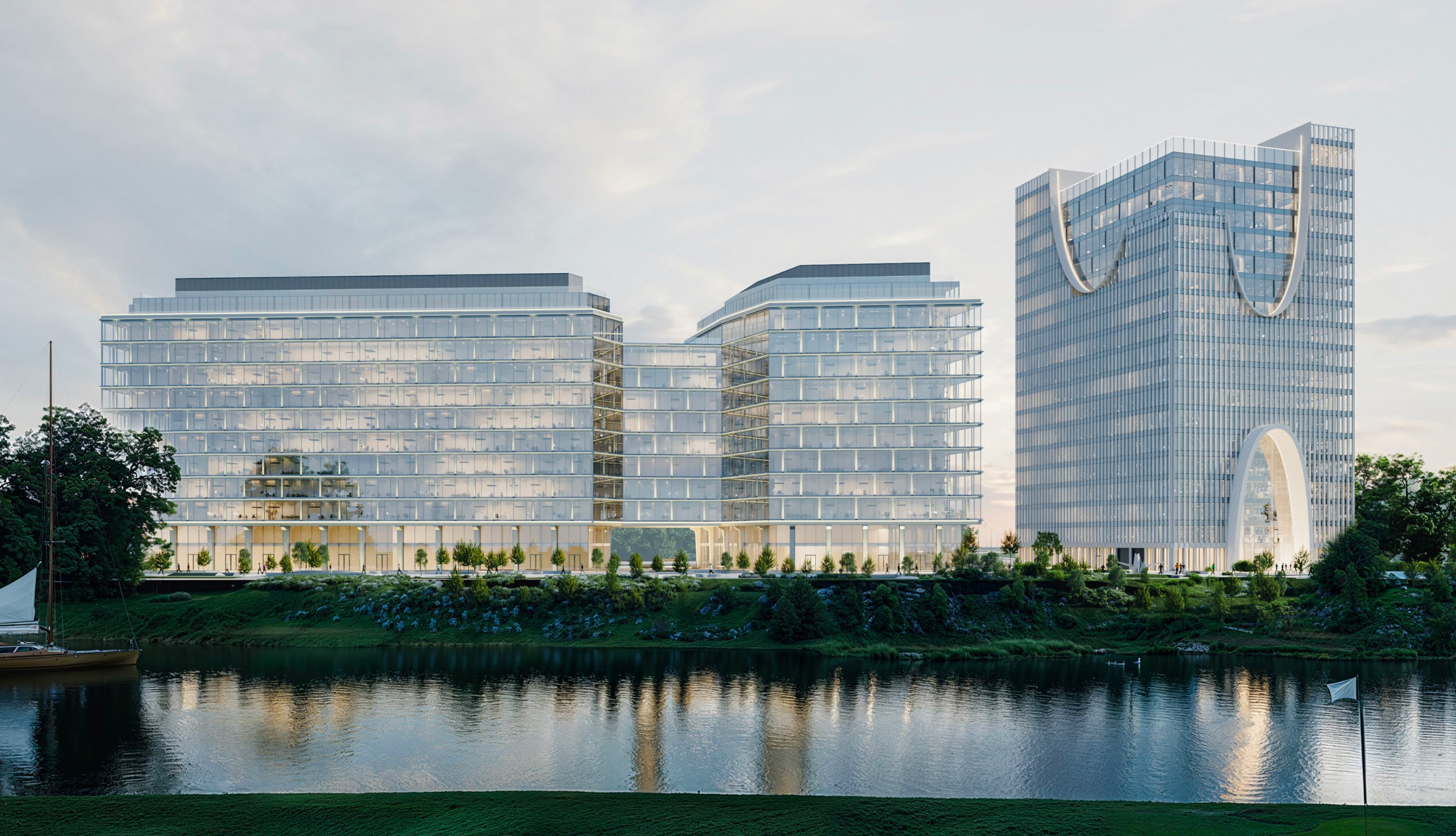 «Архитектура на берегу — это всегда вызов создать красивый силуэт и эмоциональную линию горизонта, в которой будет за что зацепиться глазу, остановиться и замереть. В качестве решения мы выбрали диалог контрастов. В его основе — два архитектурных объема, которые, несмотря на свою противоположность, создают гармонию. Это противопоставление формирует новый визуальный код района, связывая природу и урбанистику в единое целое», — Николай и Сергей Переслегины, Георгий Трофимов, бюро Kleinewelt Architecten, авторы проекта STONE Мневники.