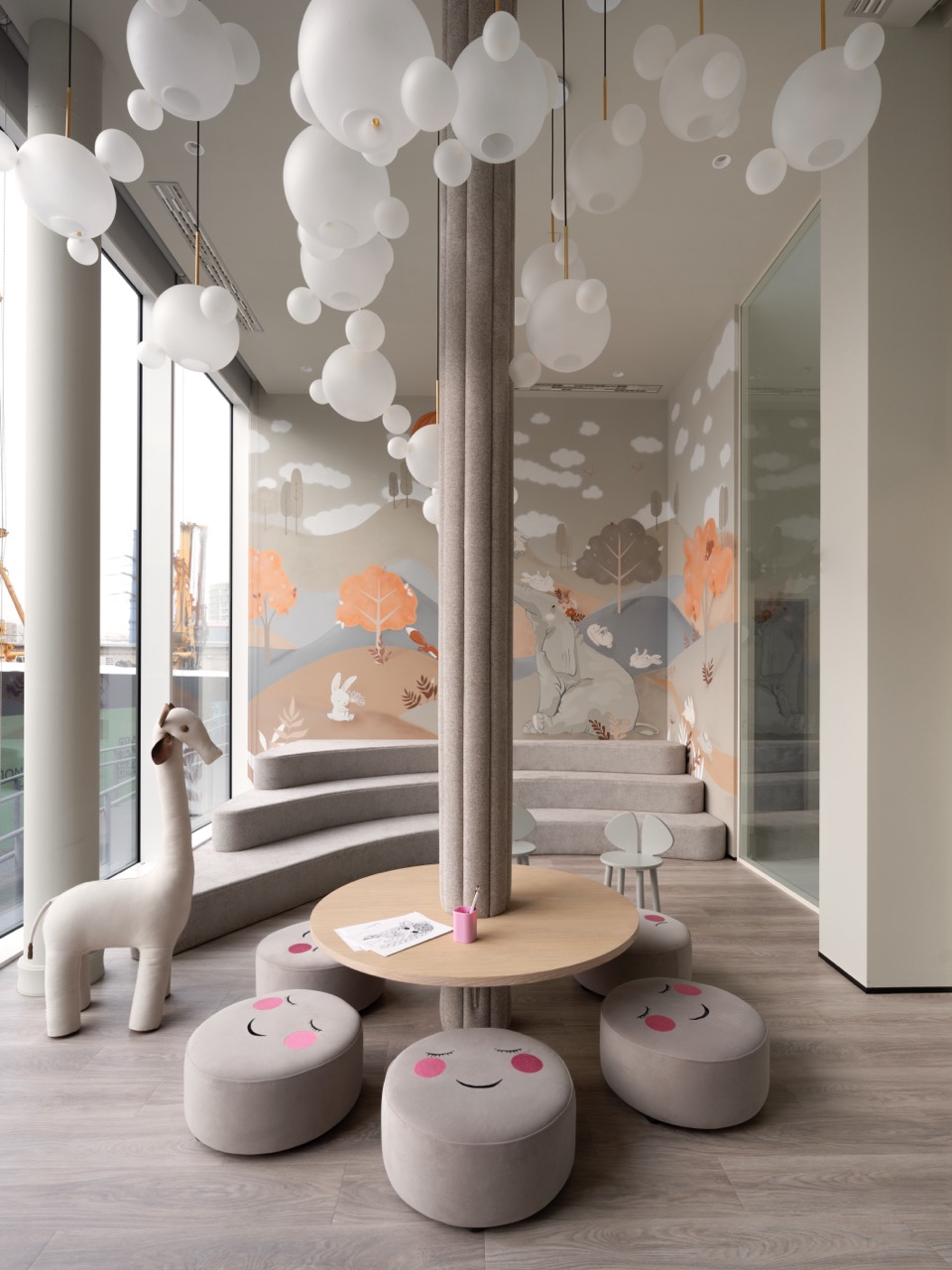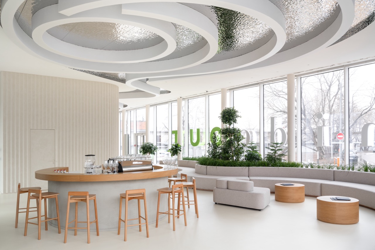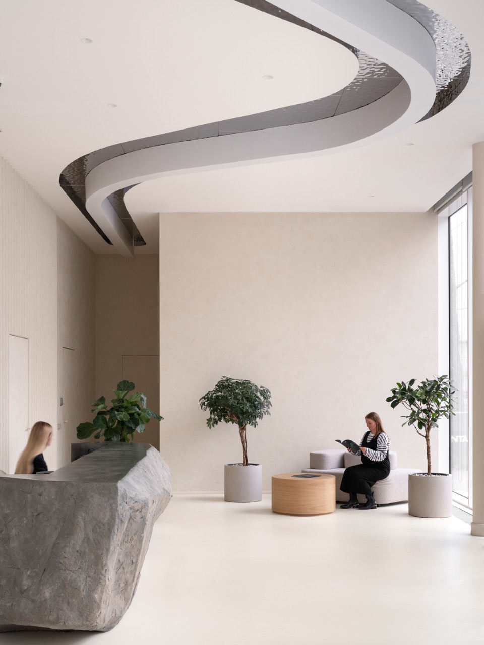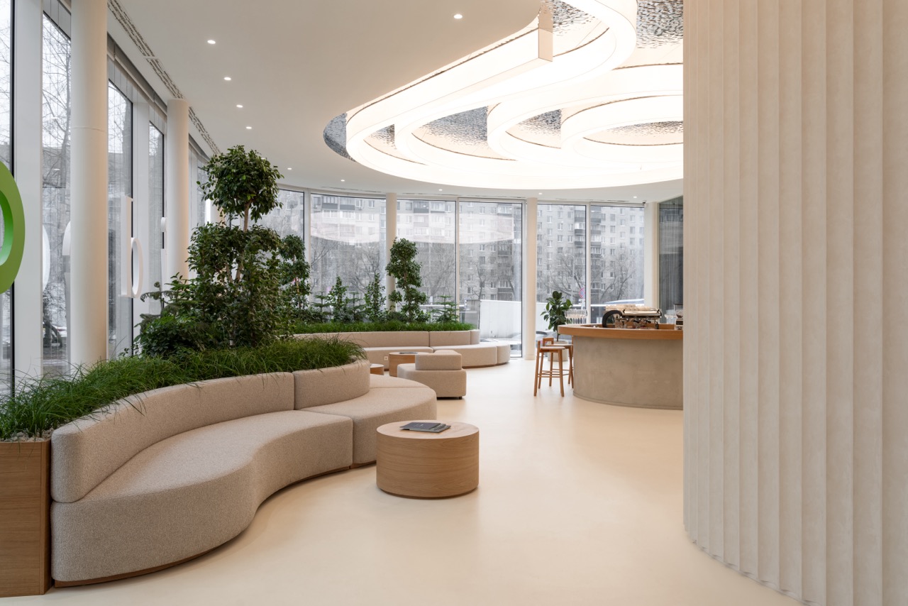 Интерьер построен на контрасте монументальных и камерных элементов. Белоснежные тектонические колонны словно вырастают из пола, визуально поддерживая потолок и напоминая стебли гигантских растений, тянущихся к свету. Им противопоставлена мебель с обволакивающими округлыми формами, вдохновленная гладкой галькой и речными валунами. Глубокие диваны, тактильные пуфы и кресла, обитые мягкими тканями, дарят ощущение уюта, защищенности и домашнего тепла.