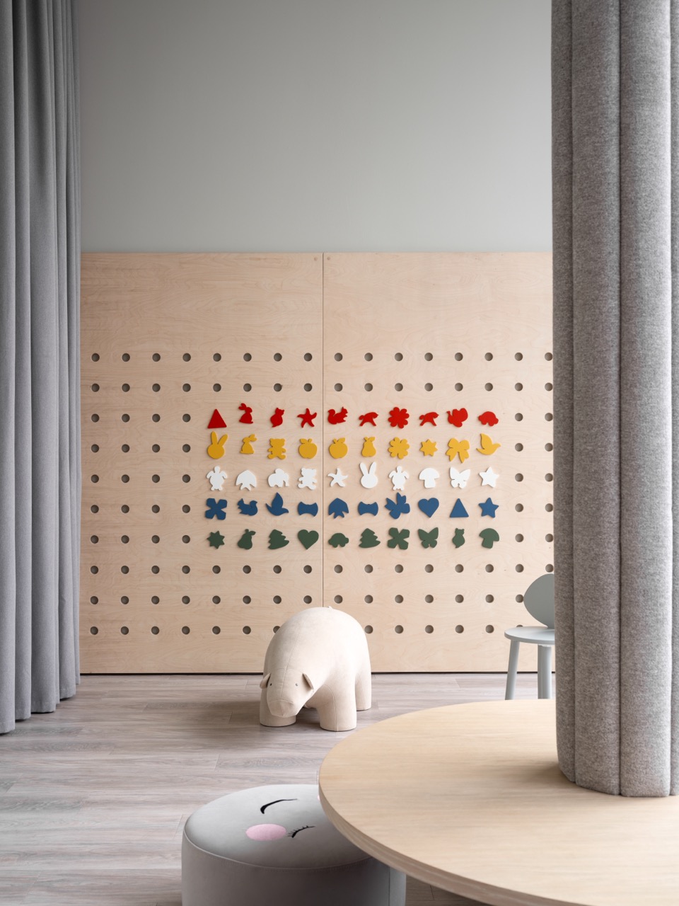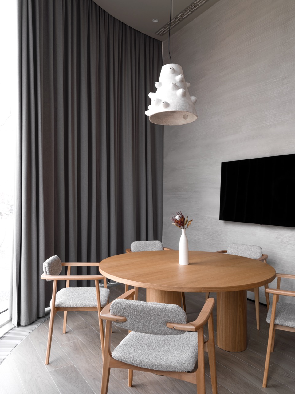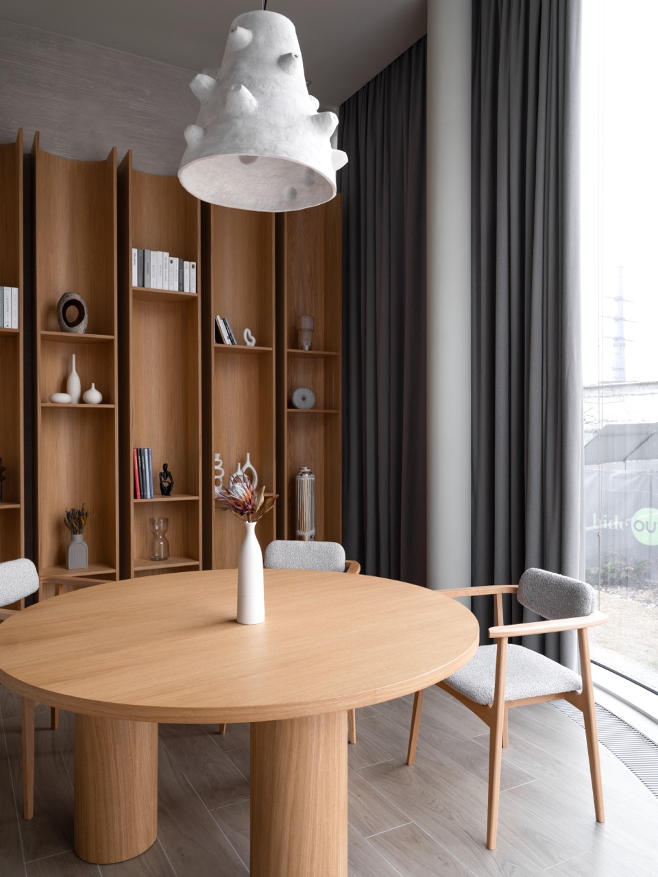 Интерьер построен на контрасте монументальных и камерных элементов. Белоснежные тектонические колонны словно вырастают из пола, визуально поддерживая потолок и напоминая стебли гигантских растений, тянущихся к свету. Им противопоставлена мебель с обволакивающими округлыми формами, вдохновленная гладкой галькой и речными валунами. Глубокие диваны, тактильные пуфы и кресла, обитые мягкими тканями, дарят ощущение уюта, защищенности и домашнего тепла.