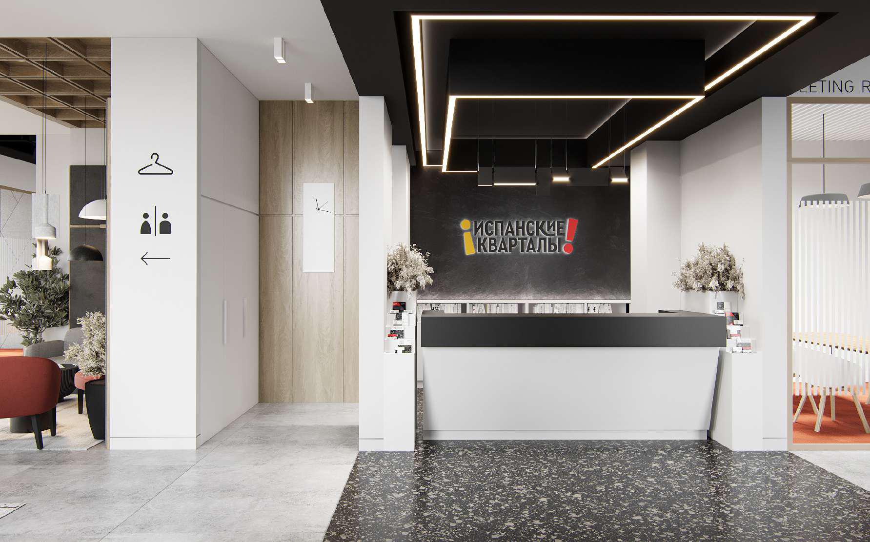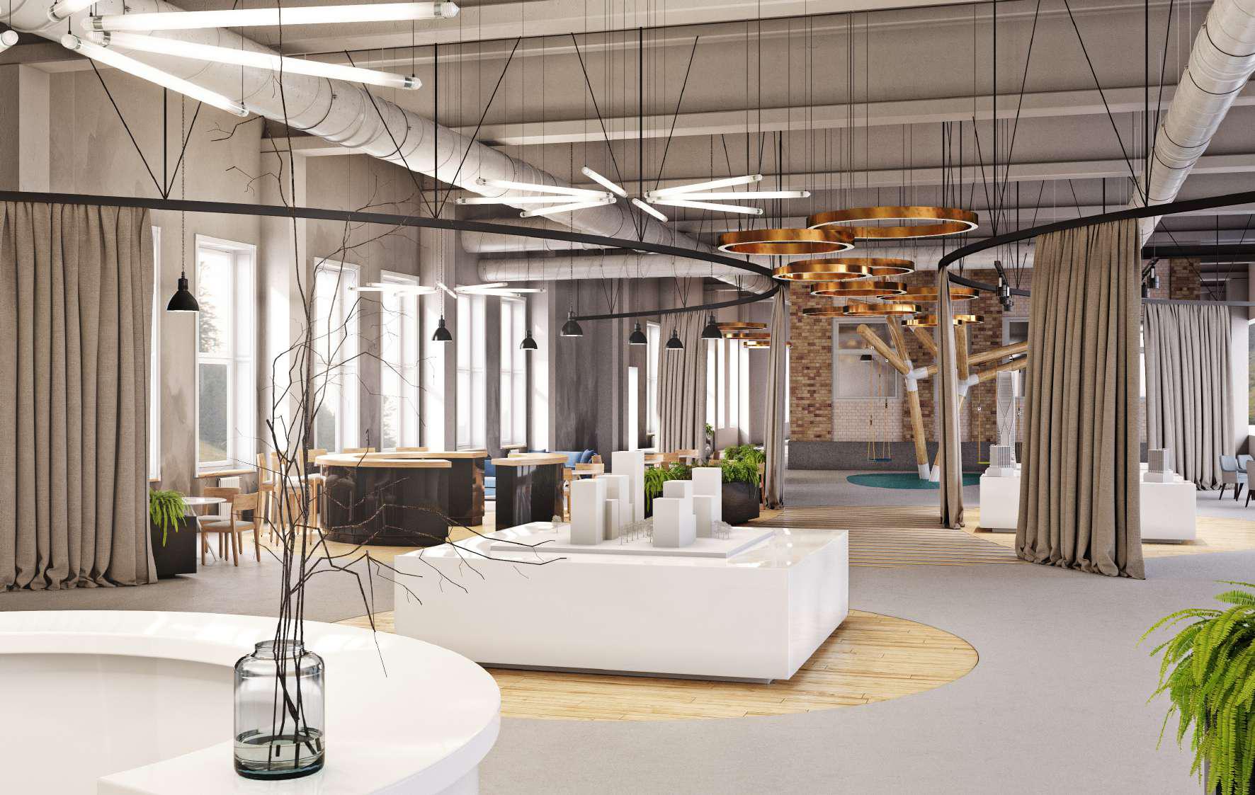 Центральный элемент пространства и главный навигационный ориентир —  «световая река» — custom-разработка в виде светодинамического арт-объекта на потолке. Этот светильник, плавно изгибаясь, не только зонирует пространство, но и создает интуитивный маршрут для движения, наполняя залы мягким и текучим светом, ассоциирующимся с водным потоком. Эта же «река» станет повторяющимся мотивом в лобби будущих жилых башен, создавая прочную визуальную и концептуальную связь.