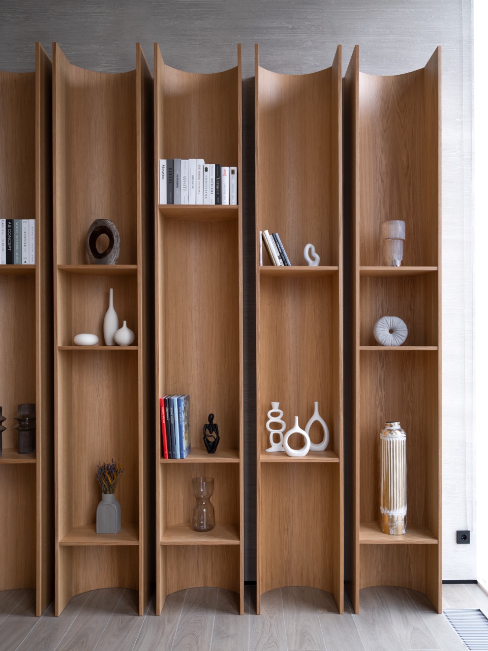 Материальная палитра — это манифест экологичности и премиальности: натуральное дерево, камень, металл и обилие живых растений. Нейтральный фон служит идеальной сценой для игры света и тени, подчеркивая чистоту линий и качество исполнения каждого предмета мебели, многие из которых, включая модульные диваны и встроенные системы хранения, были спроектированы по индивидуальным эскизам.