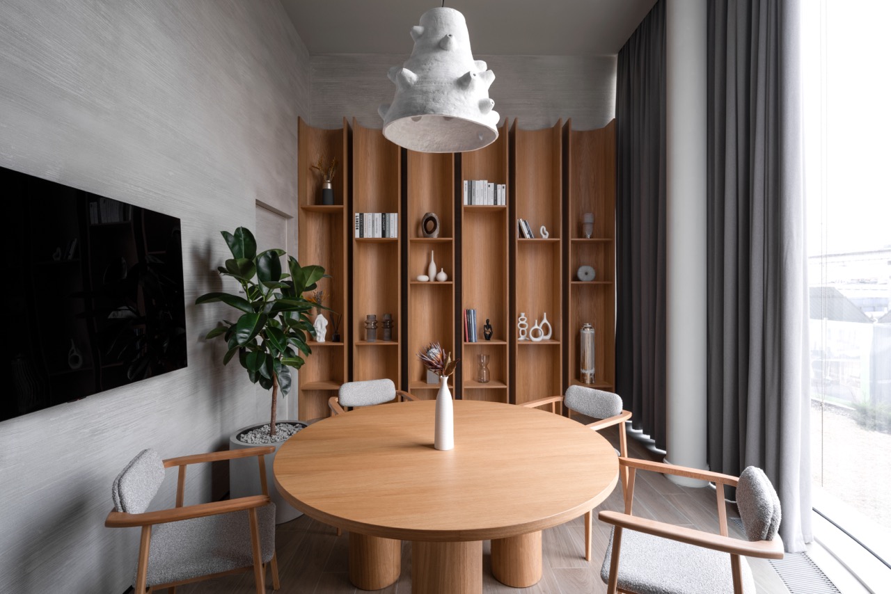 «Офис продаж hideOUT — это не просто временное пространство для сделки, а точка входа в философию проекта. Мы создали миниатюру будущих общественных зон жилого комплекса, где каждый элемент — от “световой реки” до мебели ручной работы — погружает человека в атмосферу уединенного природного оазиса посреди города. Это опыт проживания еще до покупки», – Мария Николаева, руководитель MAD Architects.