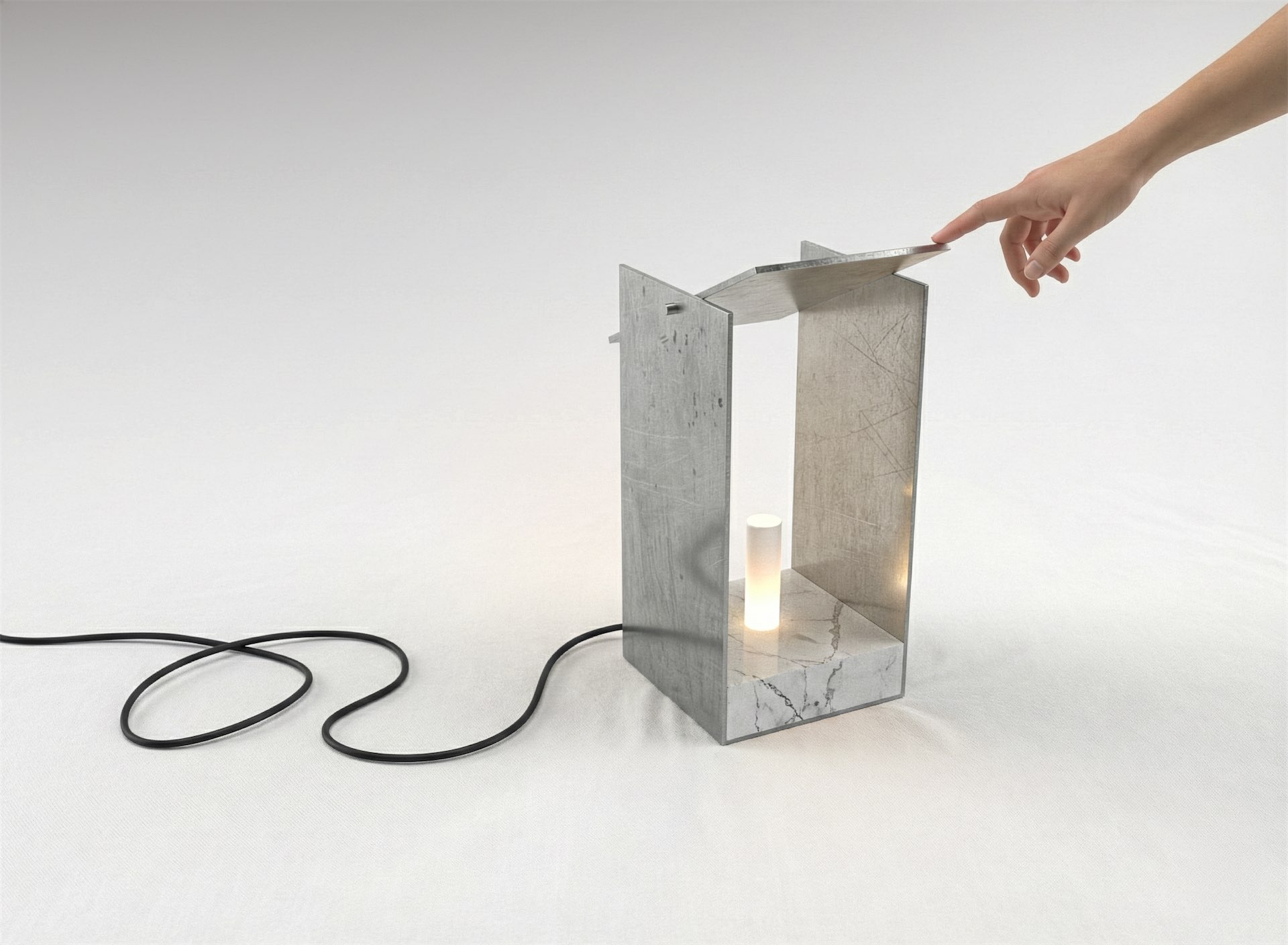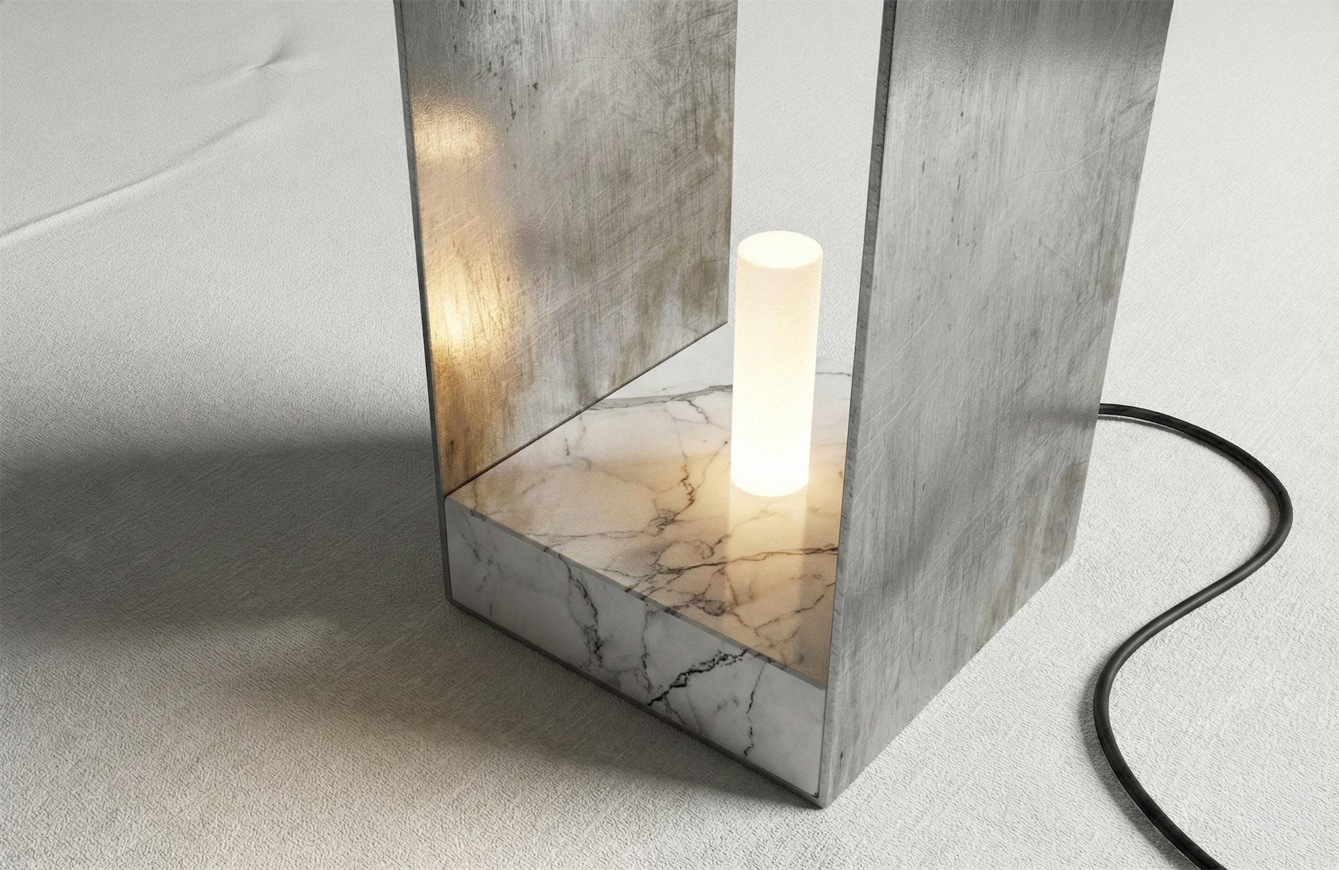 Изготовленная из мрамора и алюминия, лампа сочетает в себе массивность и прочность. Со временем на поверхности появятся микроцарапины и легкая патина в местах прикосновения, превращая следы использования в архив памяти предмета.