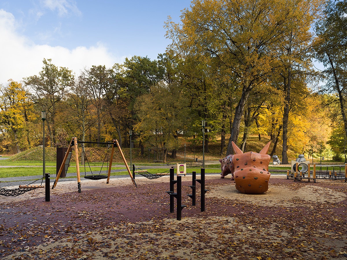 Рядом с исторической лестницей – большая детская площадка с акцентными игровыми зонами, созданными по эскизам детского воркшопа, проведенного в Черняховске в рамках вовлечения жителей в проектирование территории парка. В белых проницаемых металлических павильонах установлены качели, лавочки, гамаки, столики, большая грифельная доска для рисования.
