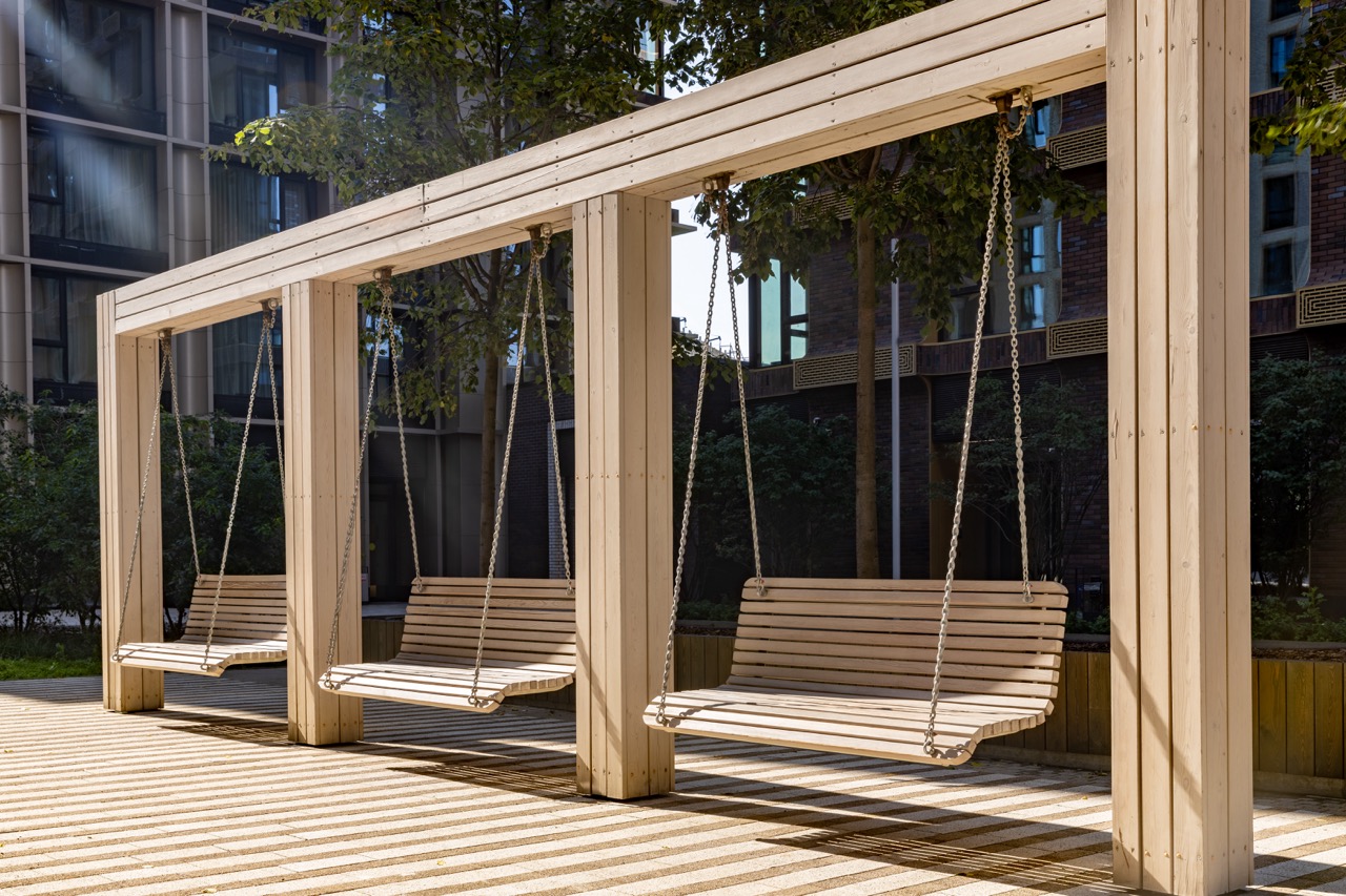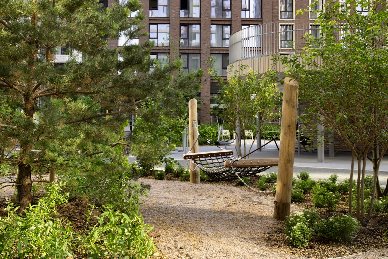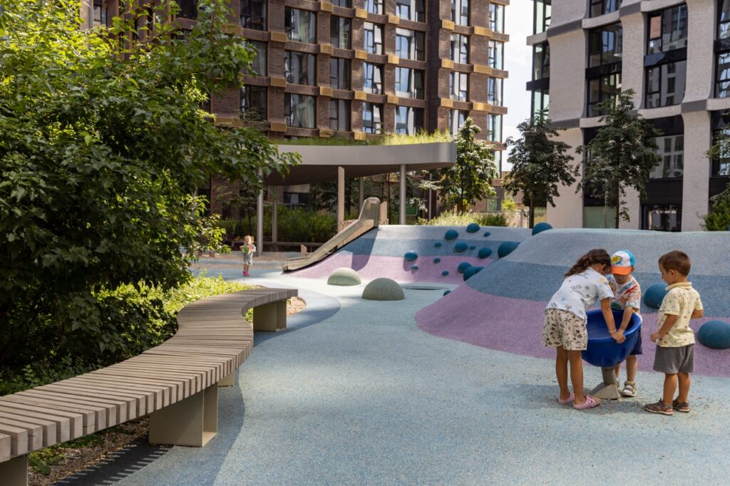 Концепция ландшафта построена на идее «двора-парка». Просторная центральная лужайка, обрамленная перголой с качелями, стала сердцем комплекса. Рядом созданы открытая спортивная площадка со ступенчатым амфитеатром, большое игровое пространство и «водный сад», который также является важным элементом системы водоотведения на территории. Он расположен в самой низкой точке рельефа, куда уходит избыточная влага. В нем высажены влаголюбивые растения и спроектированы деревянные мостки для удобства передвижения. Для детей это место стало продолжением игровой площадки, где они могут исследовать природную среду.