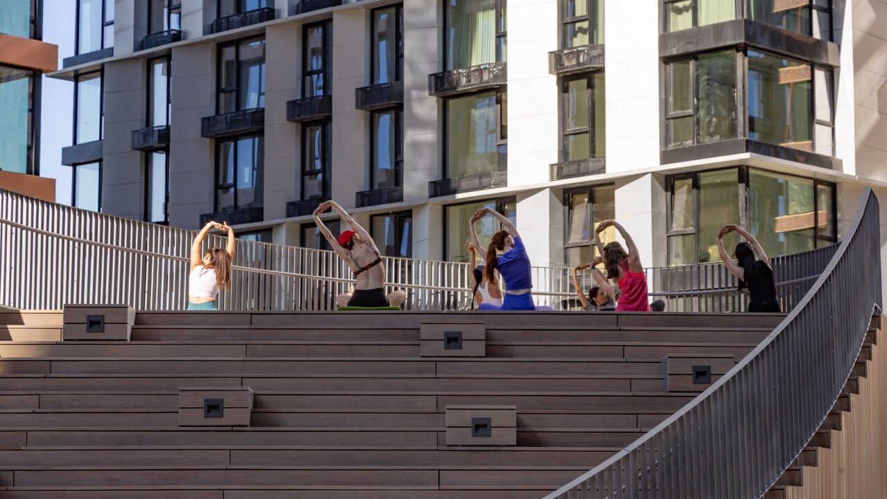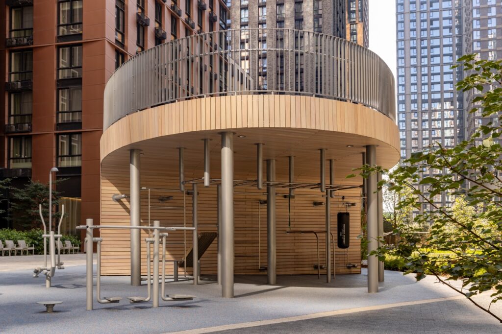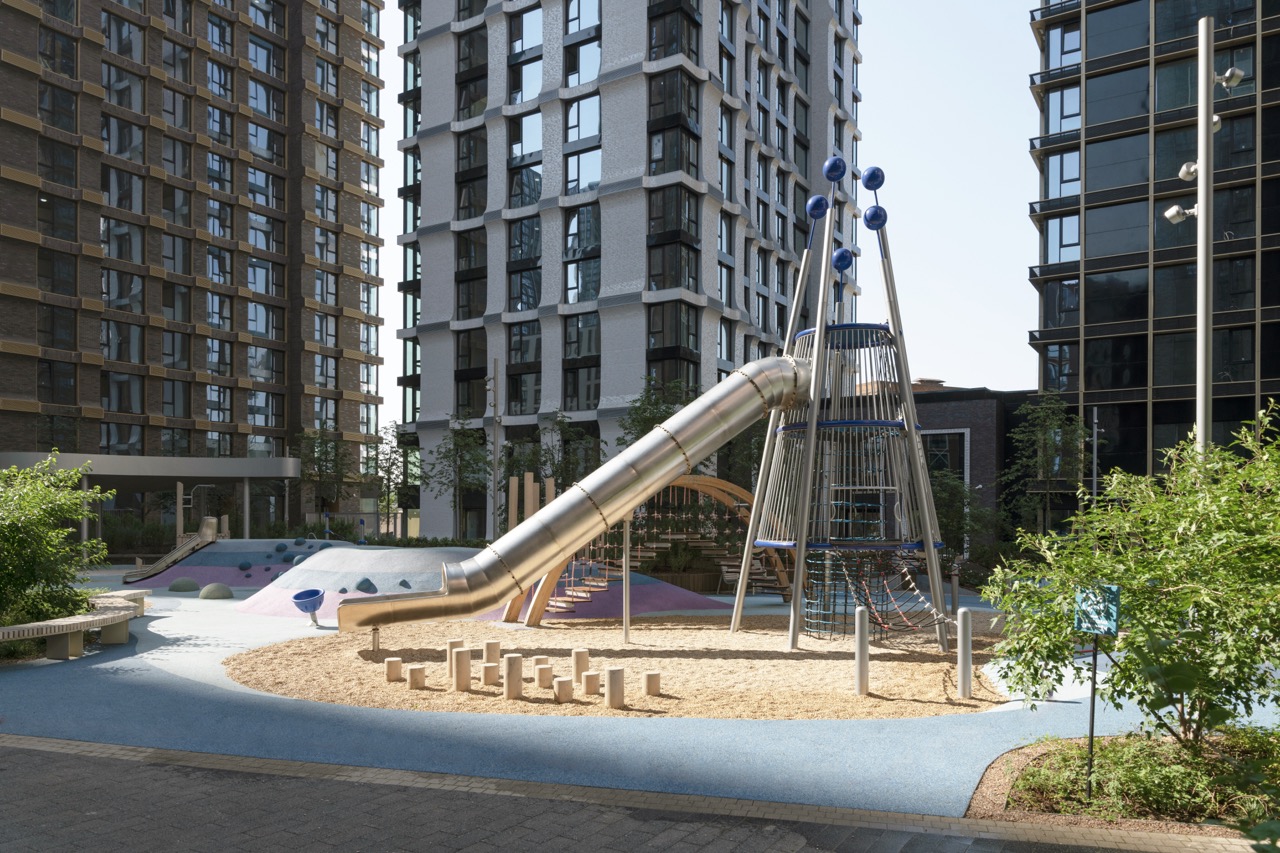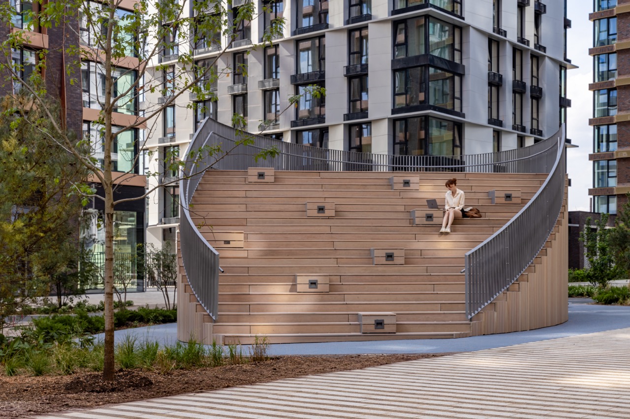 Концепция ландшафта построена на идее «двора-парка». Просторная центральная лужайка, обрамленная перголой с качелями, стала сердцем комплекса. Рядом созданы открытая спортивная площадка со ступенчатым амфитеатром, большое игровое пространство и «водный сад», который также является важным элементом системы водоотведения на территории. Он расположен в самой низкой точке рельефа, куда уходит избыточная влага. В нем высажены влаголюбивые растения и спроектированы деревянные мостки для удобства передвижения. Для детей это место стало продолжением игровой площадки, где они могут исследовать природную среду.