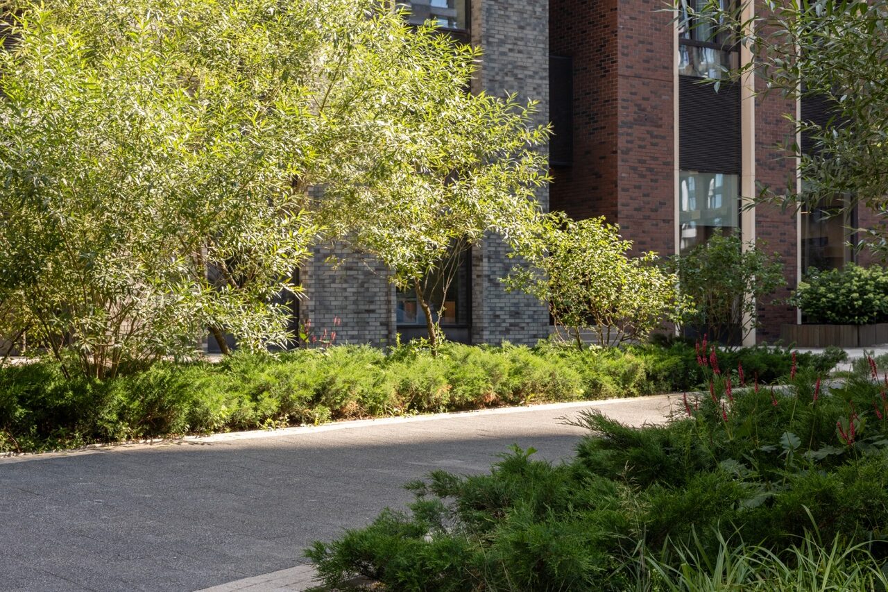 Озеленение построено на принципе всесезонности. Все растения подобраны так, чтобы обеспечить декоративность и визуальное разнообразие красок на протяжении всего года. Дворовые пространства формируют «колодец», благодаря зеленым насаждениям снижается шумовое загрязнение. Наиболее активные зоны — детские и спортивные — обрамлены плотными многоярусными посадками.