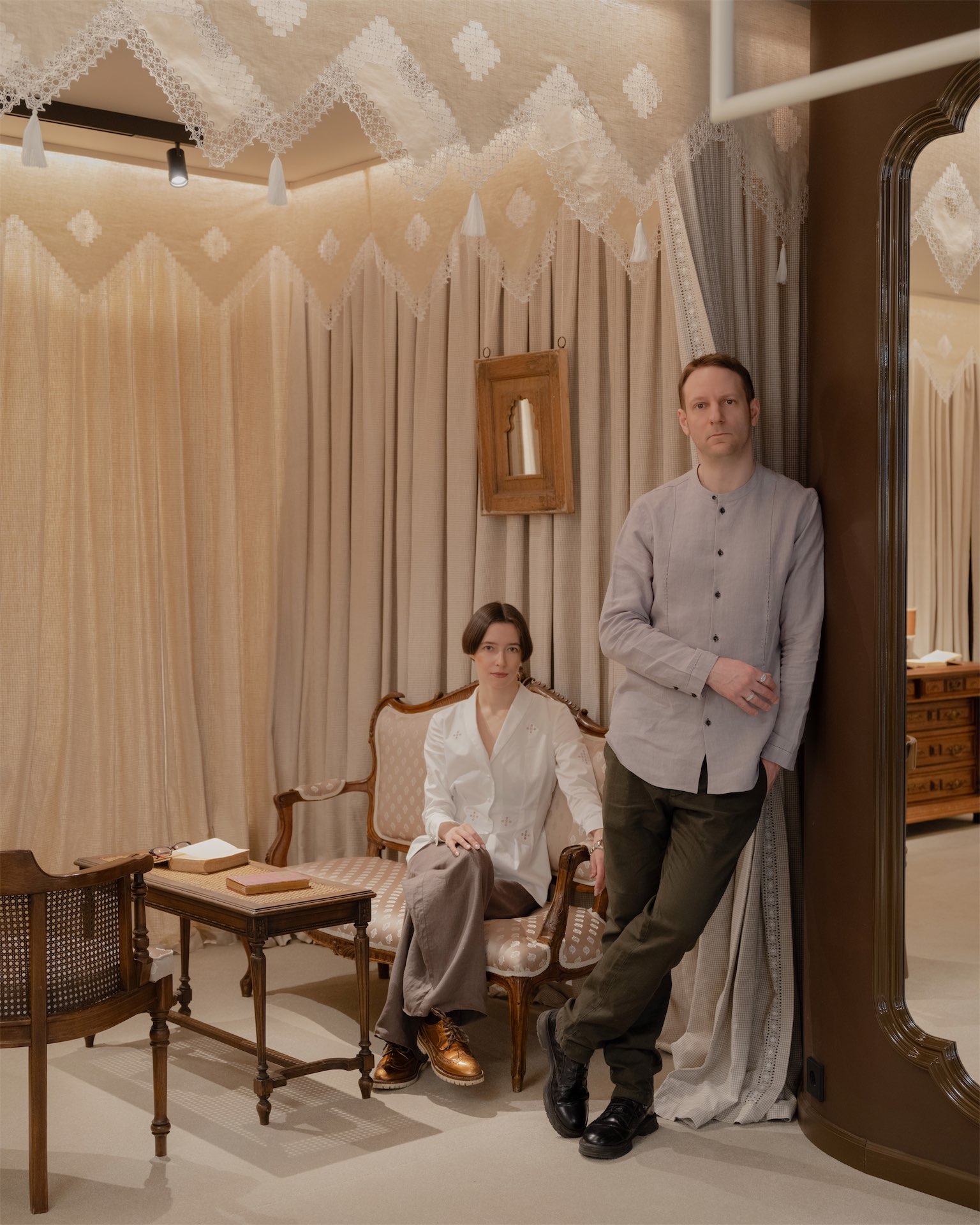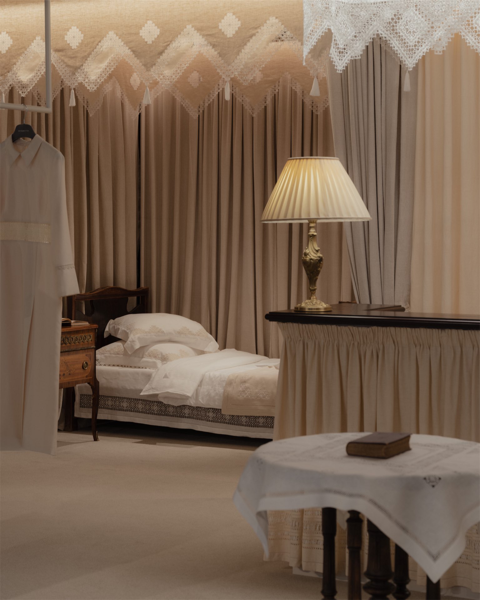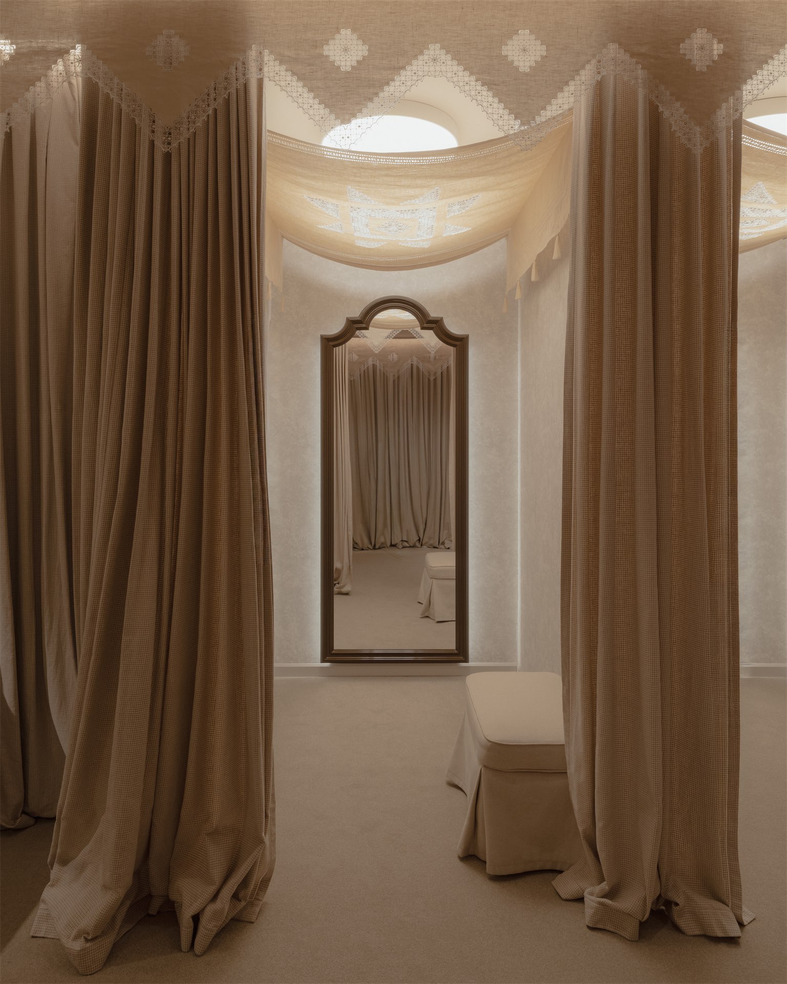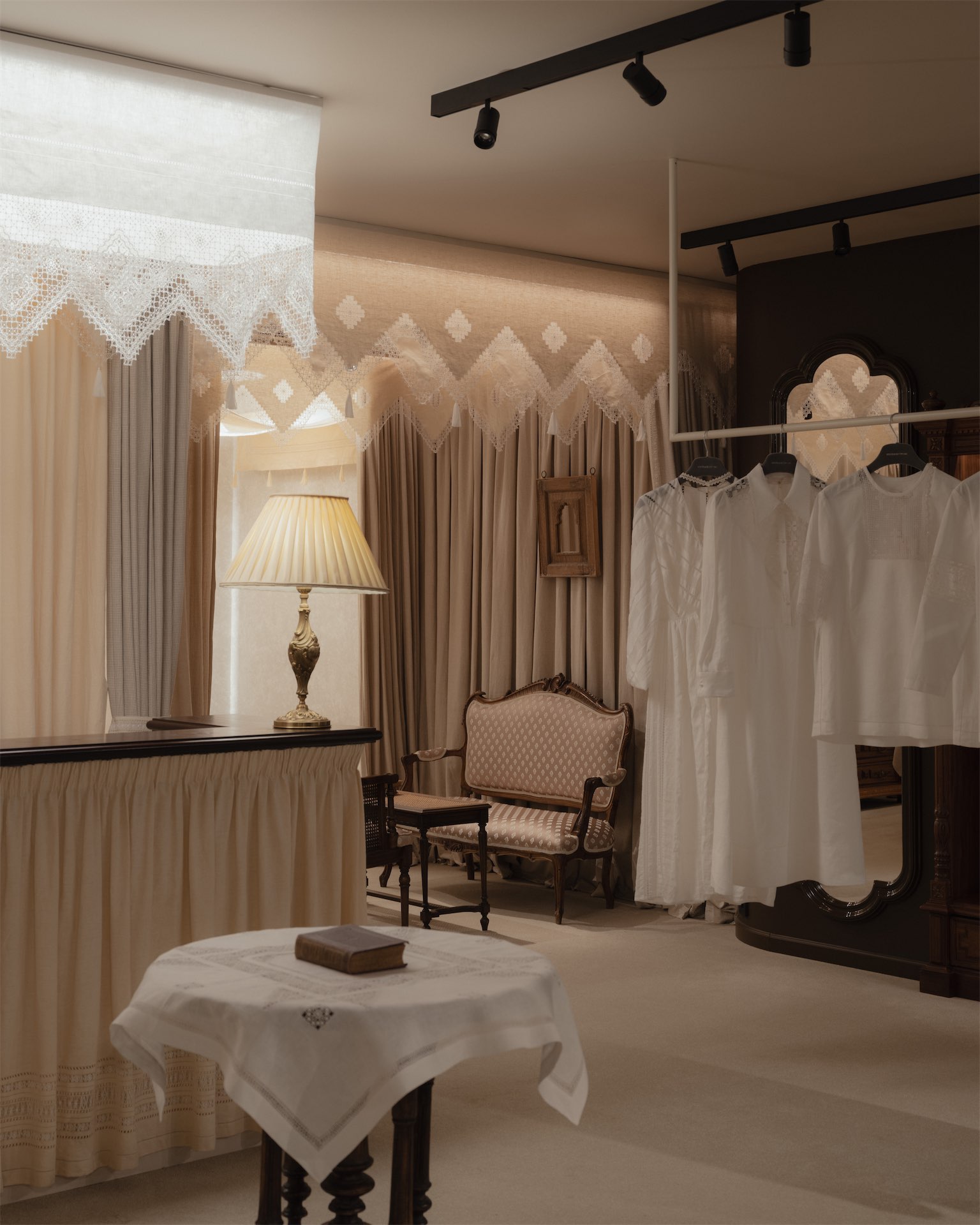 Интерьер строится на мягких, тактильных решениях. Ткани и ручная вышивка становятся частью архитектурного сценария. Пространство наполнено антикварной мебелью: палисандровая кровать эпохи модерн демонстрирует постельное белье, бельгийские и французские комоды с техникой маркетри служат витринами для аксессуаров, в зоне ожидания — ротанговые кресла-бержеры.