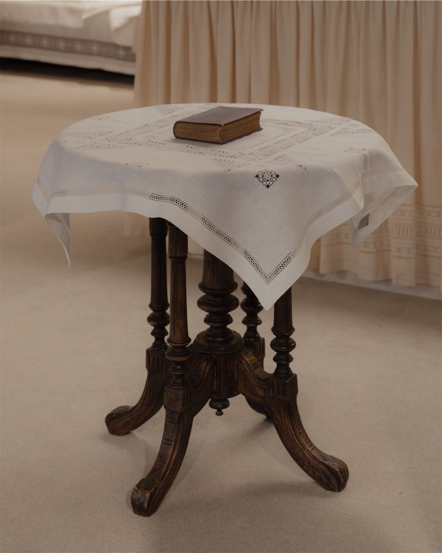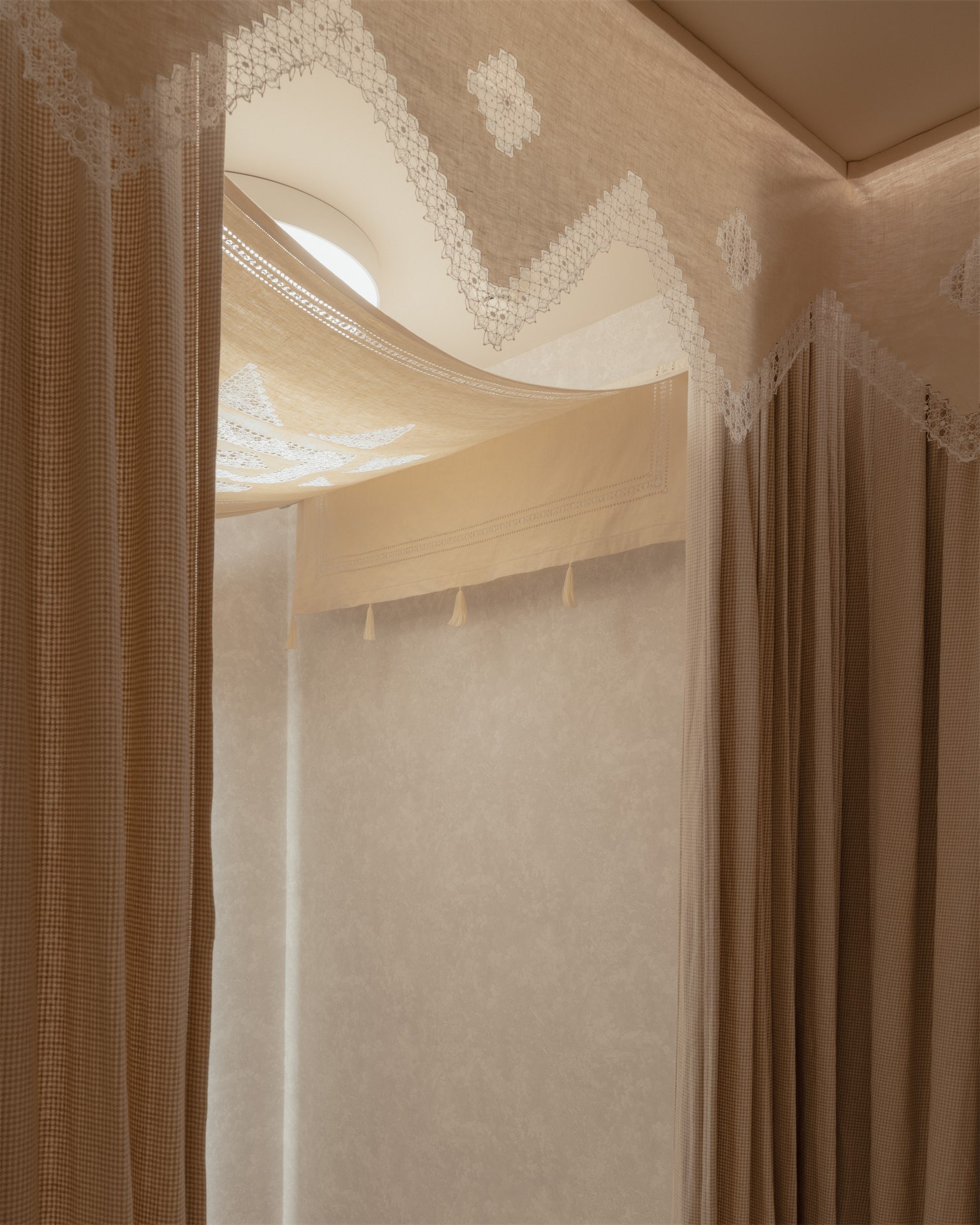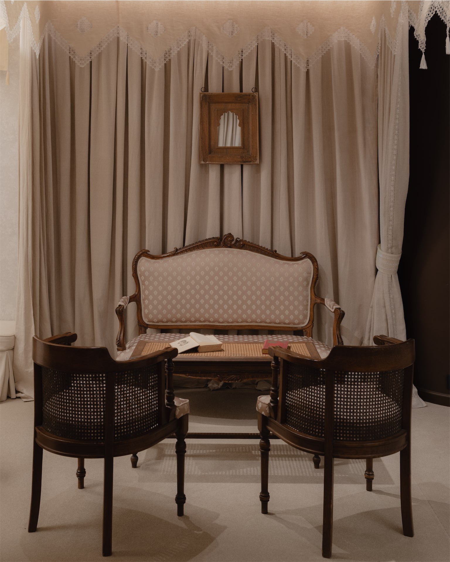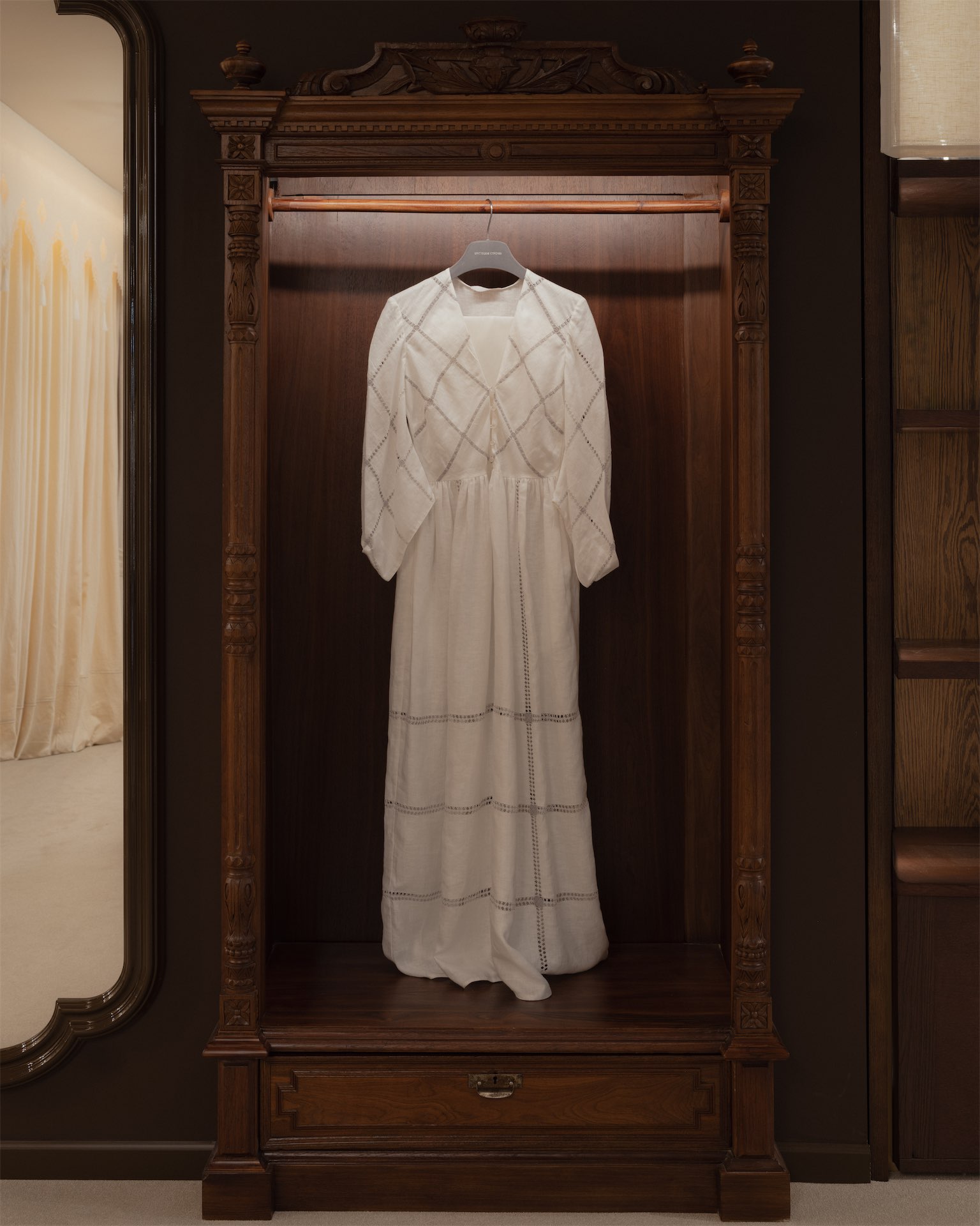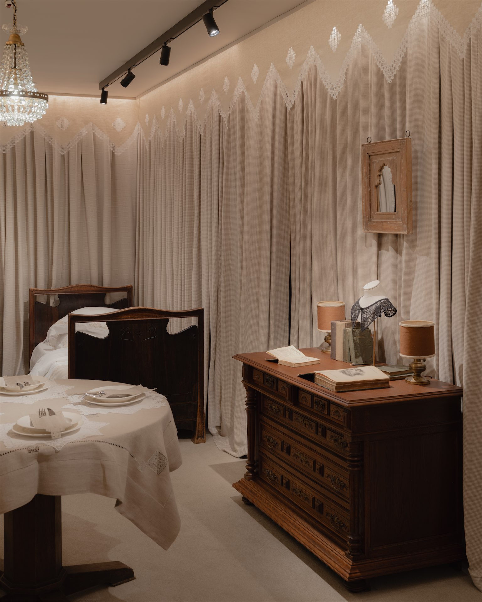Интерьер строится на мягких, тактильных решениях. Ткани и ручная вышивка становятся частью архитектурного сценария. Пространство наполнено антикварной мебелью: палисандровая кровать эпохи модерн демонстрирует постельное белье, бельгийские и французские комоды с техникой маркетри служат витринами для аксессуаров, в зоне ожидания — ротанговые кресла-бержеры.