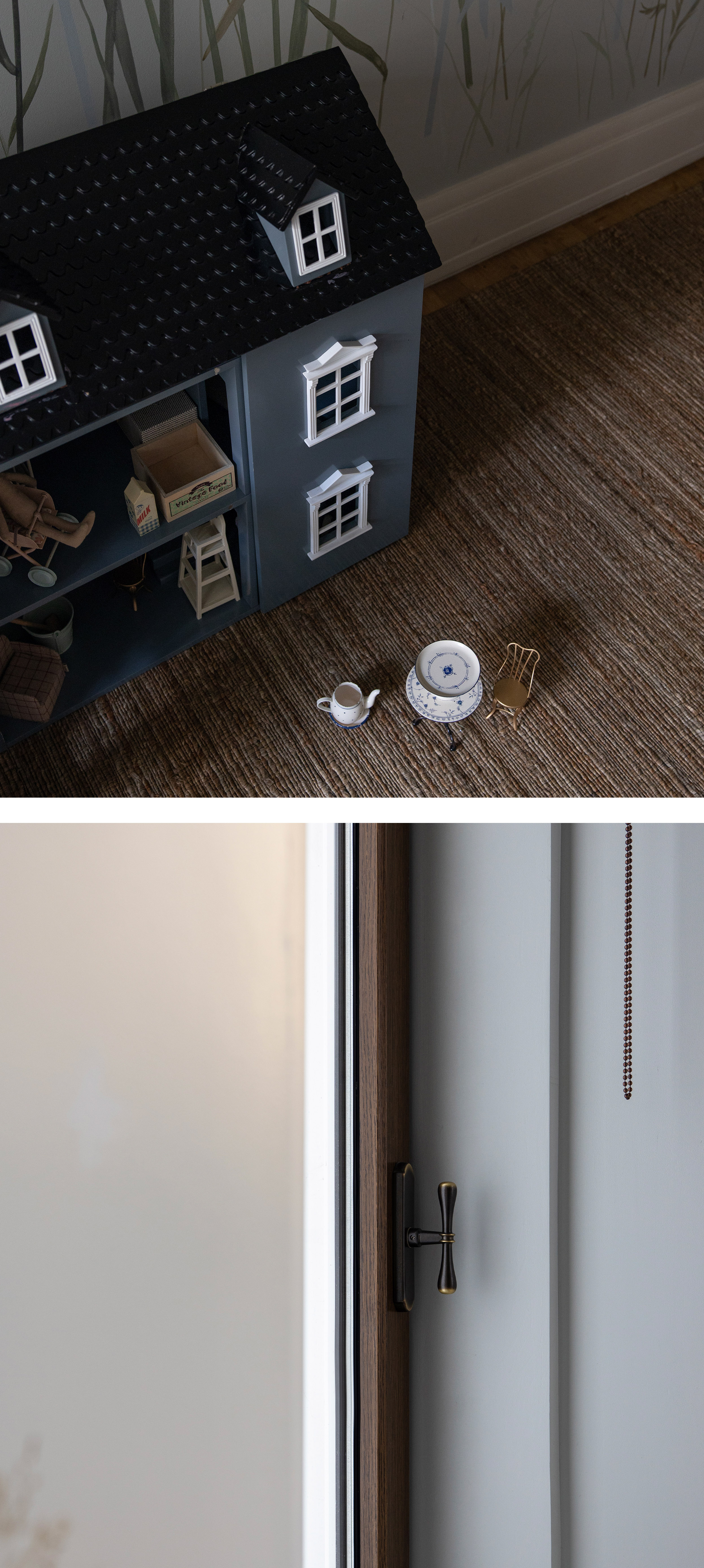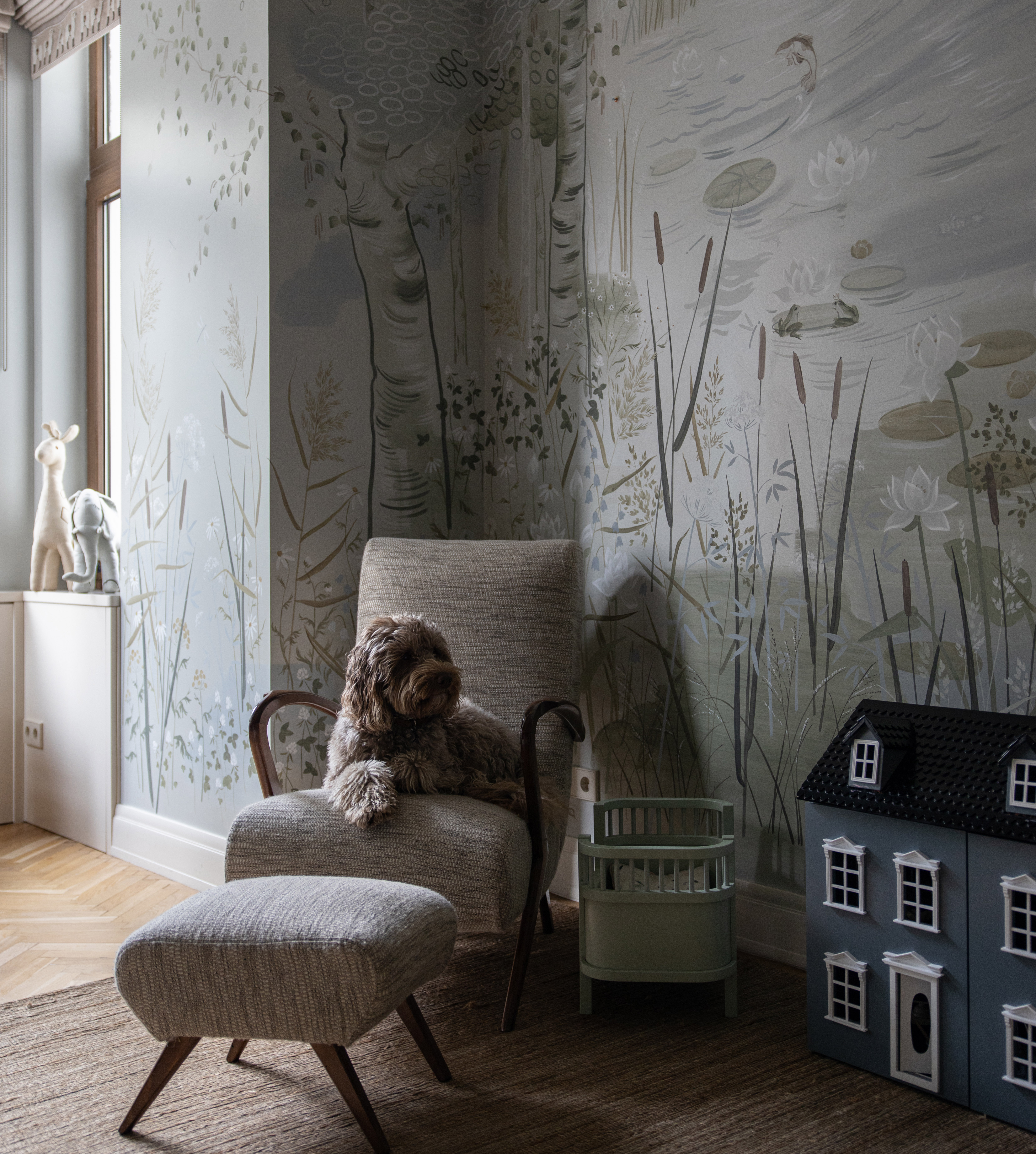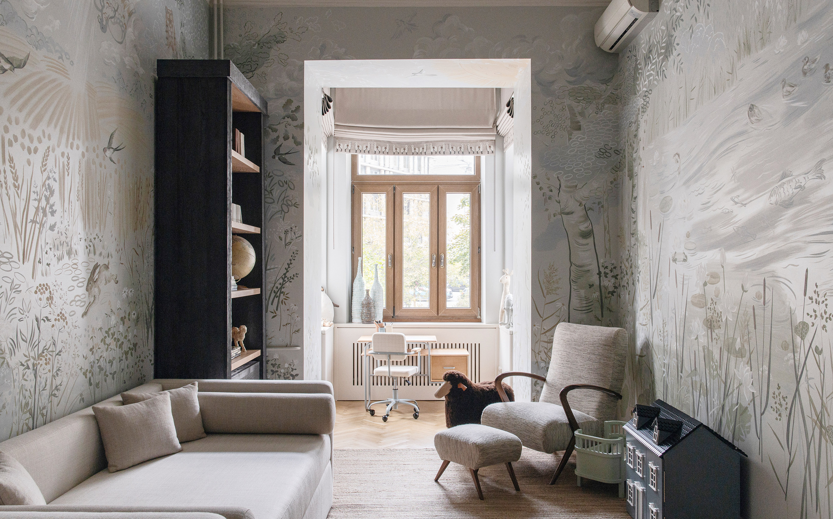 Один из важных элементов интерьера — расписанные вручную стены с пасторальными мотивами — с садами, утками, ежиками и солнцем. Этот «проект в проекте» стал продолжением творческих экспериментов, начавшихся с создания театральных декораций на 5-летие Алии. К празднику было решено подготовить театральную постановку и нарисовать декорации на тему Щелкунчика на огромных картонах практически в человеческий рост. Вся семья, включая Алию, дружно работала над этим проектом в течение нескольких месяцев. Когда стало понятно, что своими силами проект не закончить, Александра пригласила художницу. Совместная работа оказалась настолько приятной, что стены детской комнаты они расписывали уже вместе. Сама Алия принимала активное участие в принятии всех решений, особенно в росписи стен и выборе дивана. Ее авторское видение учитывалось на каждом этапе, начиная с утверждения эскизов и заканчивая проработкой деталей.