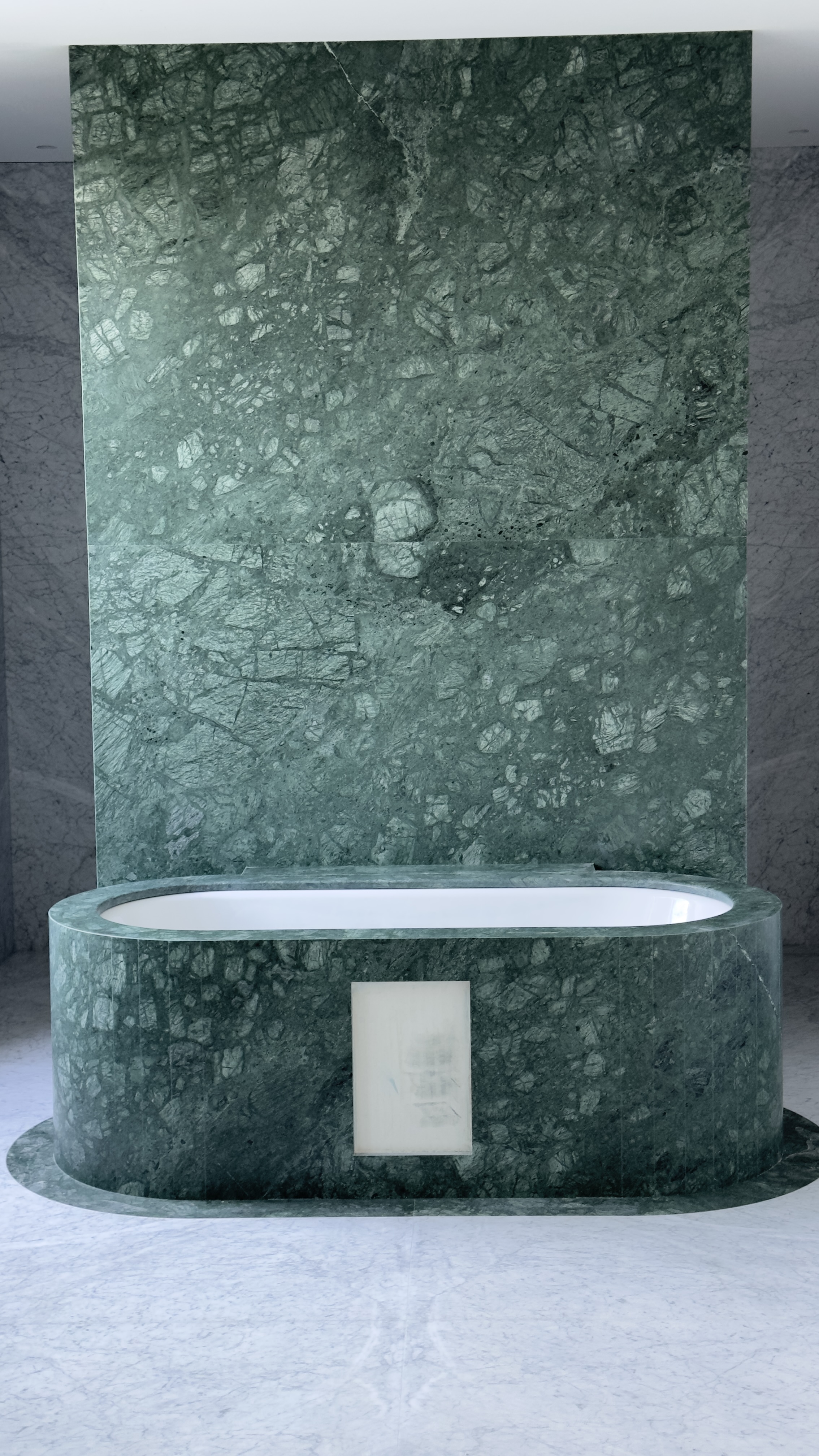 Одним из центральных пространств стал мастер-санузел, оформленный с использованием двух видов камня — белого итальянского мрамора Bianco Carrara и зеленого Verde Guatemala, привезенного из Индии. Стены и пол из Bianco Carrara выполнены с симметричной раскладкой «бабочка», при этом швы на поверхностях практически незаметны.