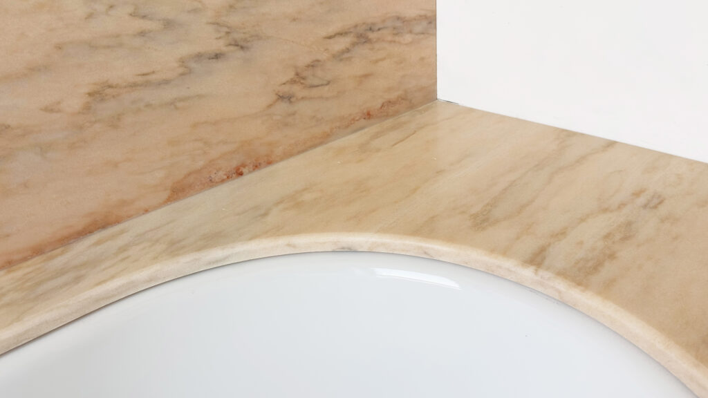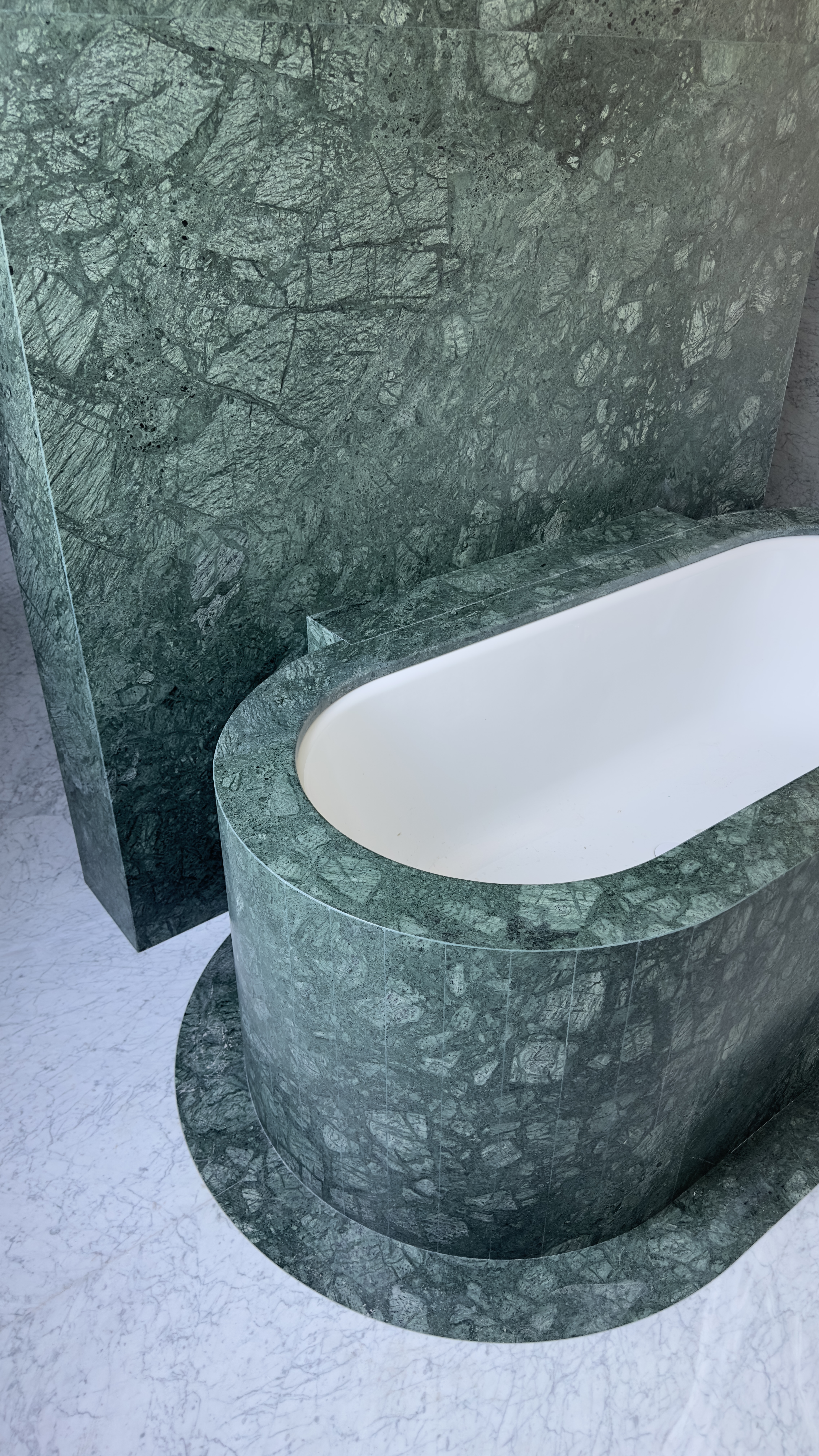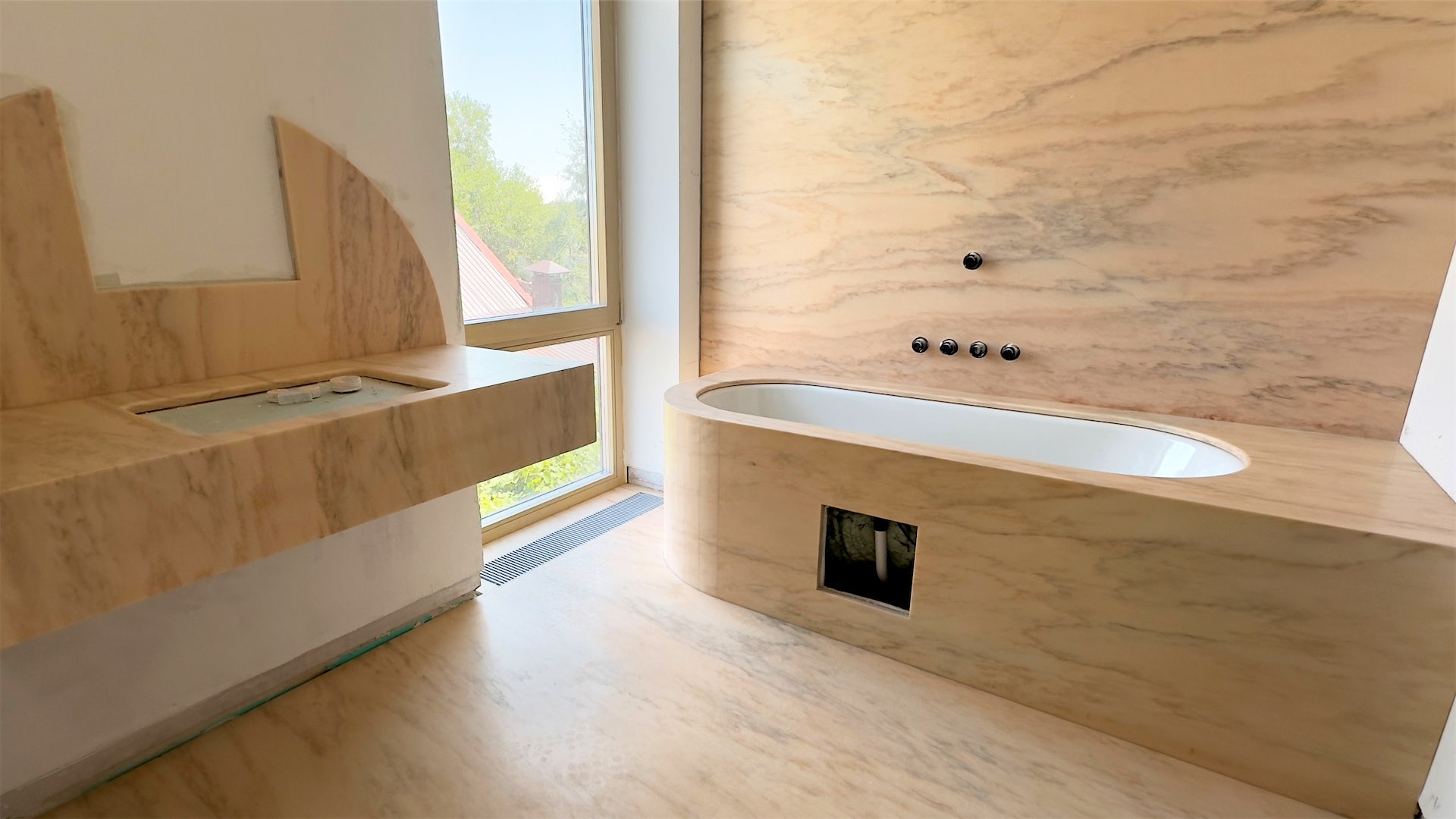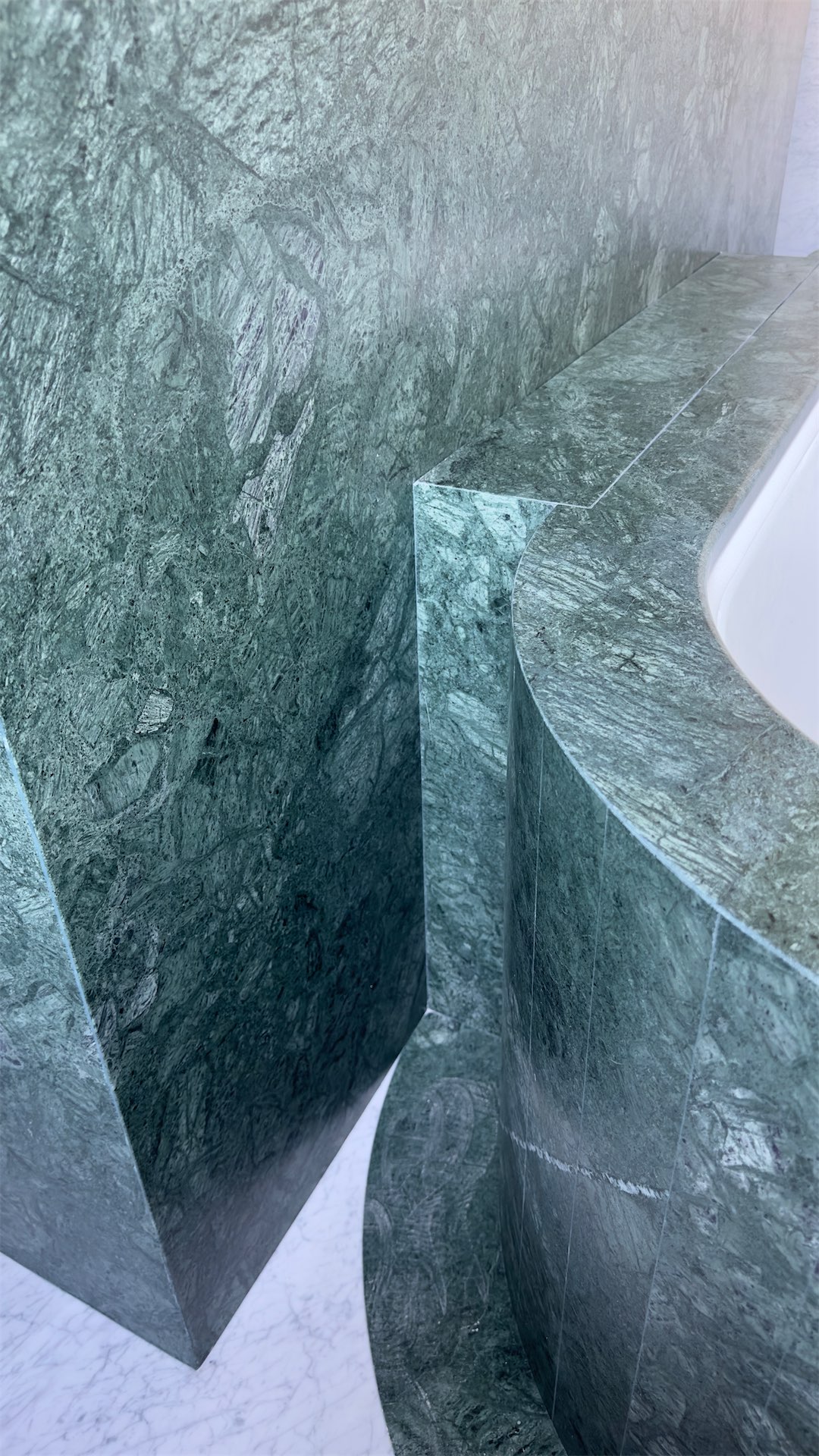 В центре помещения установлена радиусная ванна, облицованная материалом, точно повторяющим ее геометрию. Две части конструкции стыкуются под углом 45°, а на вертикальной поверхности выполнено аккуратное закругление. Все стыки тщательно обработаны и отполированы — швы не ощущаются даже тактильно.