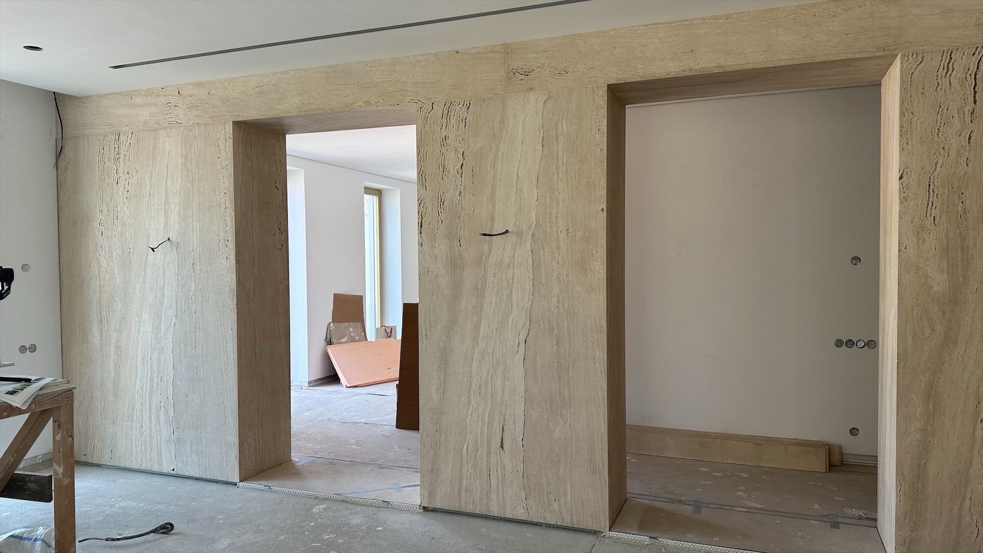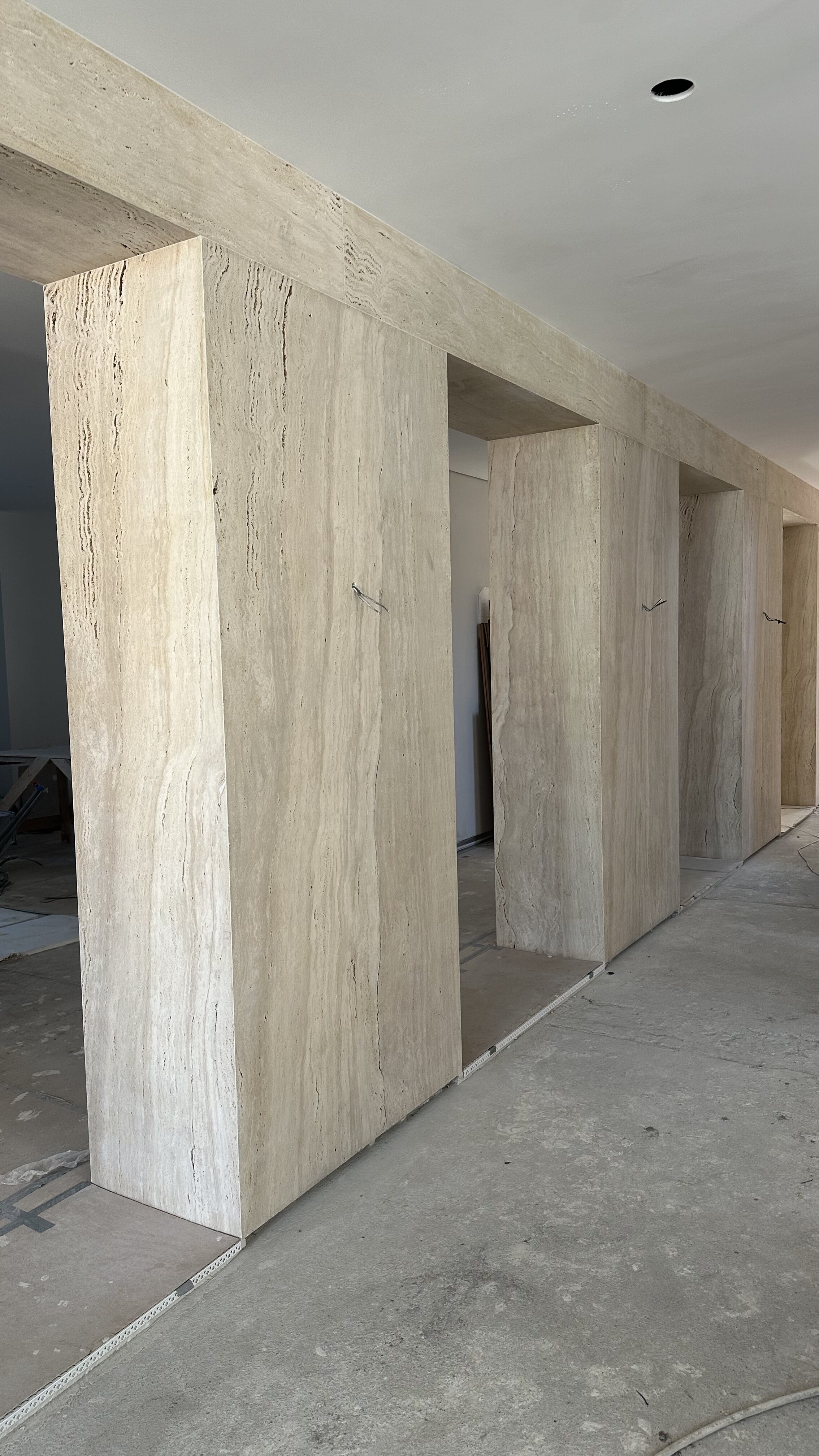 Команда INTERIOR STONE более пятнадцати лет работает с натуральным камнем, создавая частные и общественные интерьеры. В рамках недавнего проекта были облицованы четыре санузла, камин, колонны, а также выполнены встроенные элементы и мебель из камня.