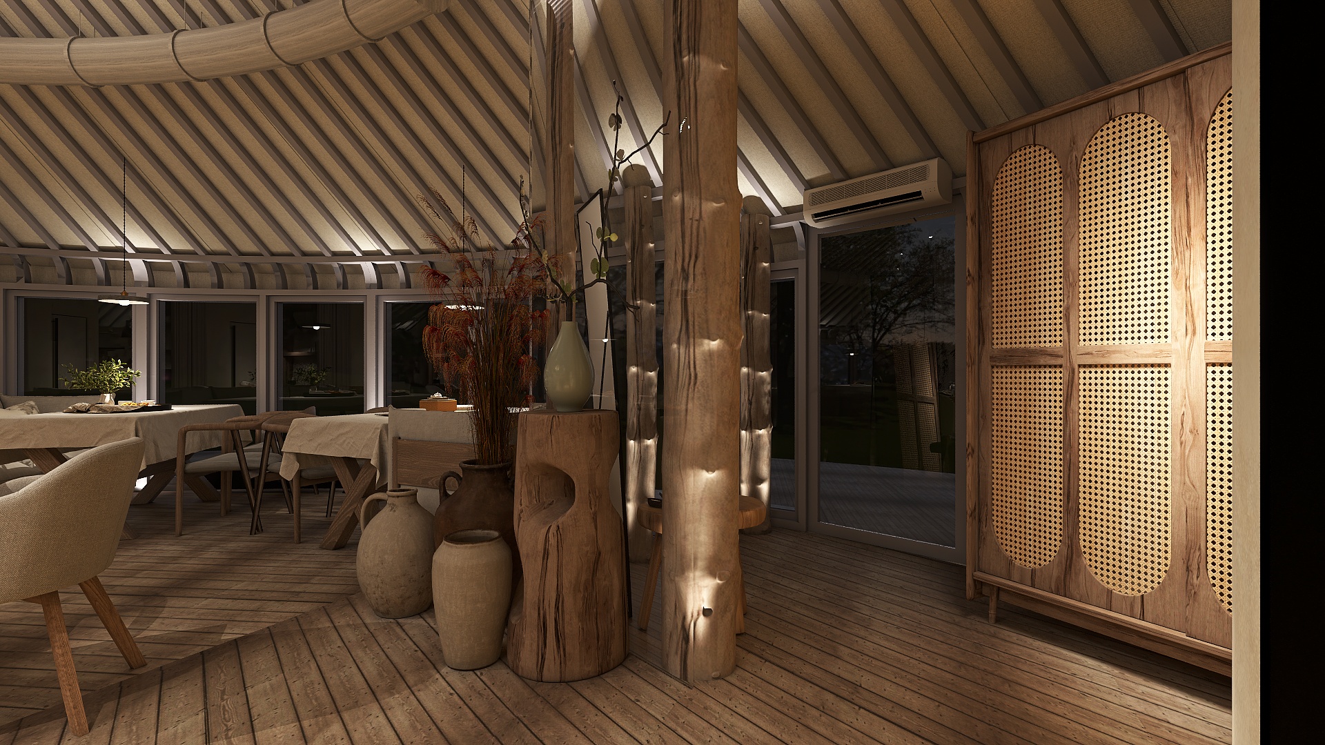 Арт-объекты позволяют не только показать часть художественного наследия края, но и подсветить важные проблемы. Декор и мебель разрабатывались локальными ремесленниками и мастерами. Например, глиняная посуда в ресторане создана красноярской студией «ЯРКЭ», вазы в домиках — художницами из Бурятии Мариной Налетовой и Викторией Смирновой, а ручная каллиграфия в каждом номере — художницей Янжимой Батуевой.