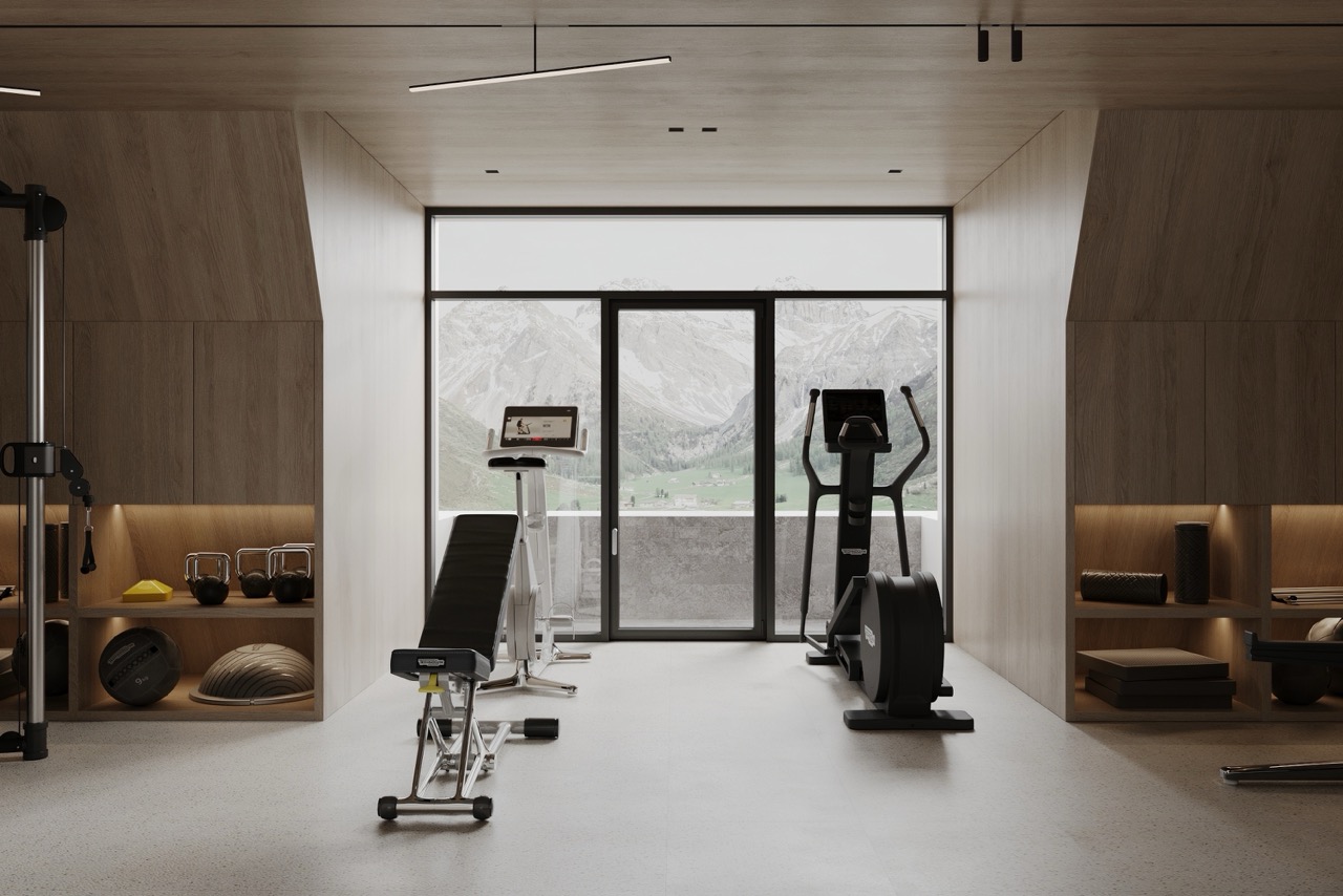 В доме четыре этажа, у каждого из которых своя идея и функция. Нижний этаж отвечает за технические и хозяйственные задачи. Второй посвящен теме well-being: здесь расположилась спа-зона с сауной, паровой баней, бассейном, тренажерный зал с видом на горы, а также залы для занятий, которые могут трансформироваться в гостевые спальни. Визуально чистый, немного строгий интерьер располагает к занятиям спортом и ментальному расслаблению. Вместе эти пространства создают место для отдыха, восстановления сил и хорошего самочувствия.